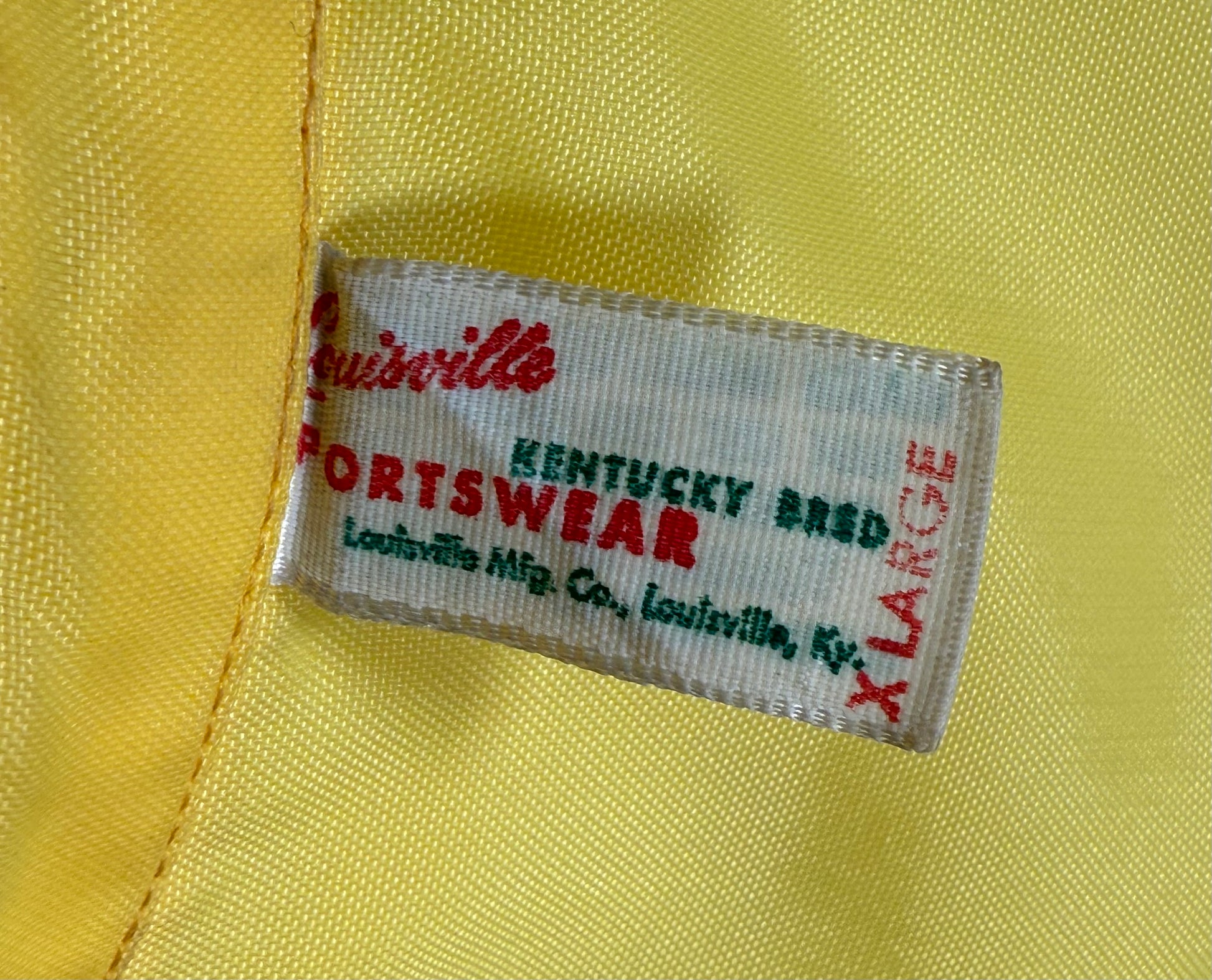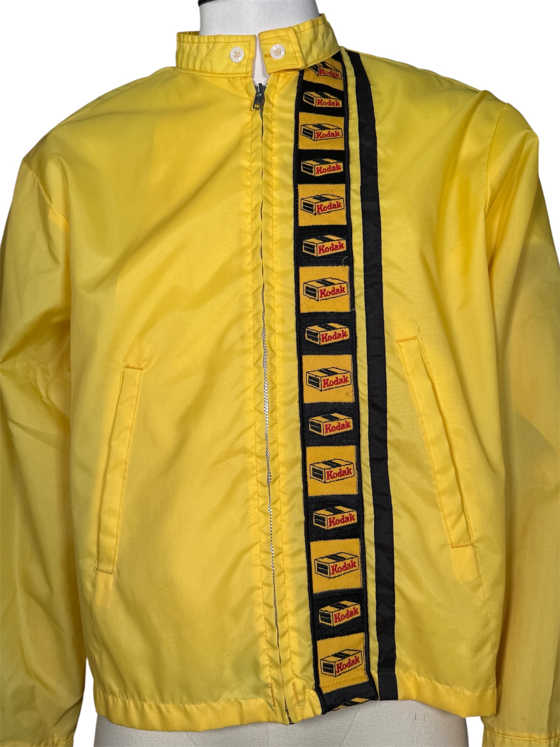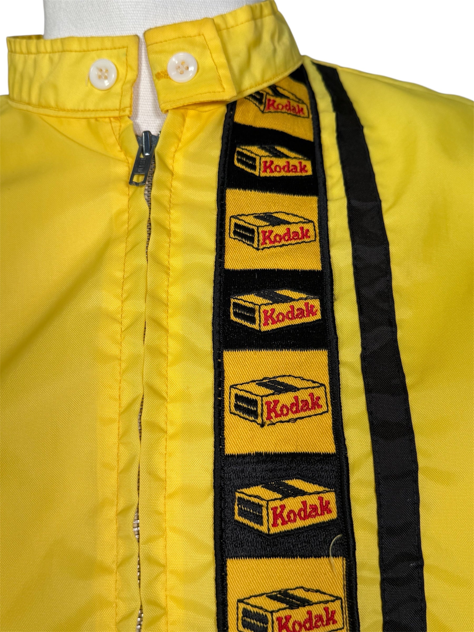 1970s "Kodak" Louisville Sportswear jacket. This yellow and black jacket features a stripe of boxes labeled Kodak in red down the front. It attaches at the front with a metal zipper and has two decorative, white, plastic buttons on the collar. There is a slight condition issue with this jacket, pictured in the last photo. There is a slight mark on the back of the jacket. This item is marked an X-Large, but please refer to the measurements as sizing changes based on the decade.