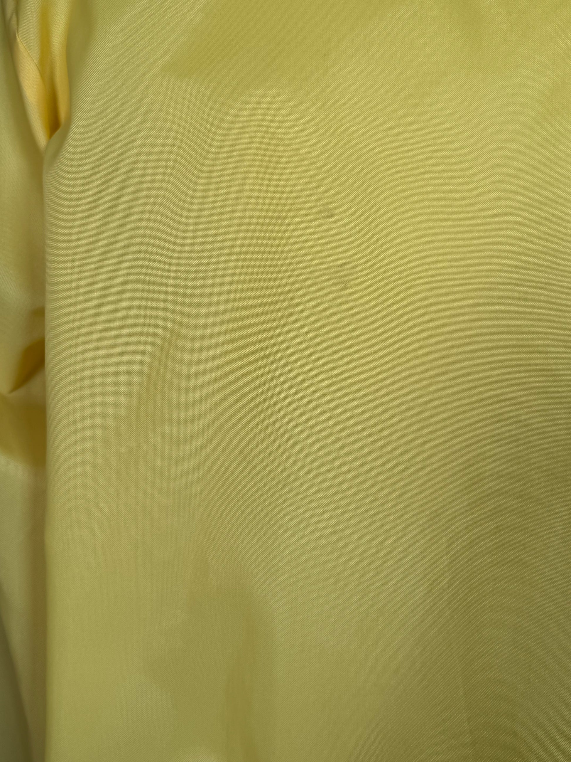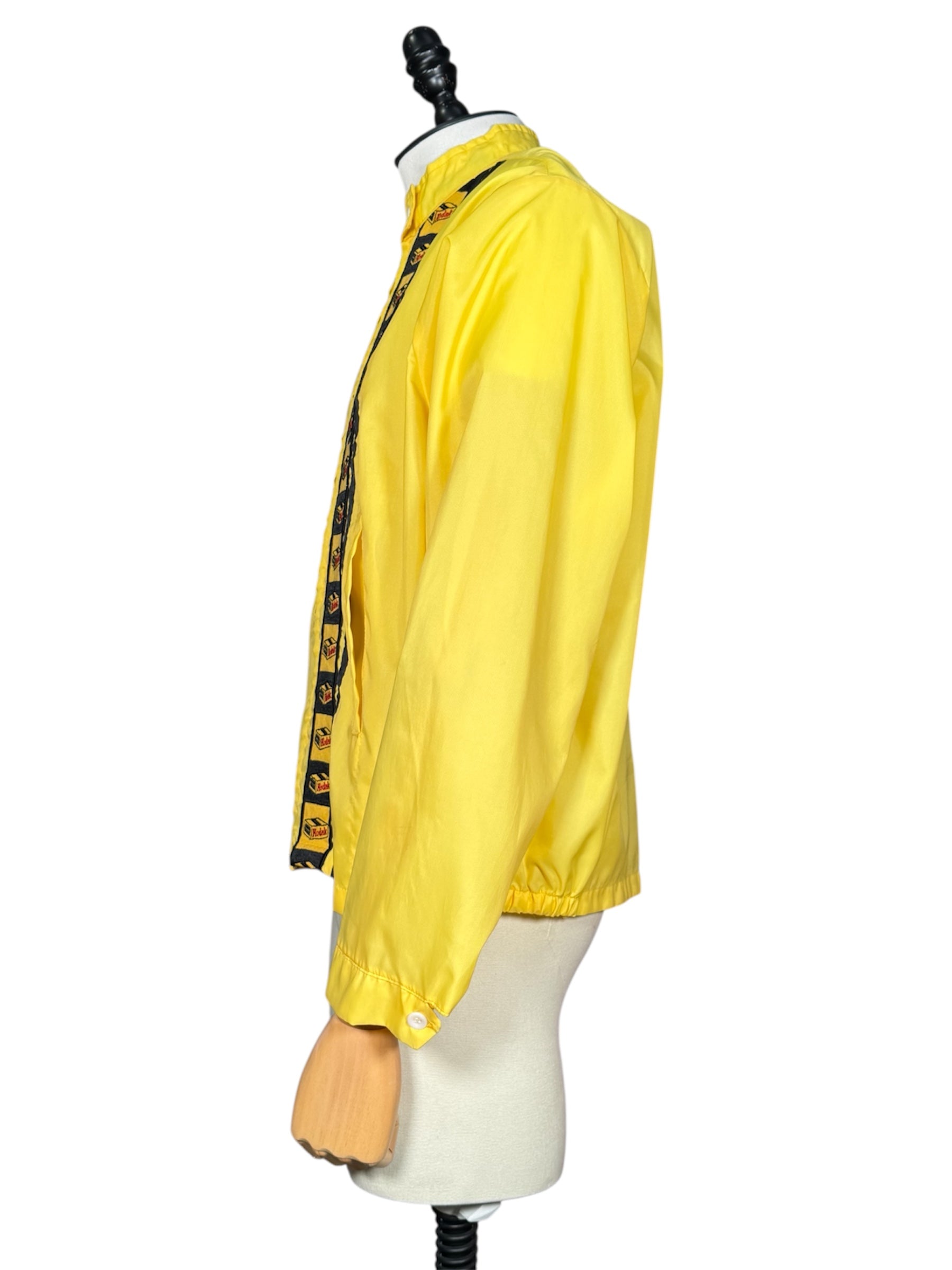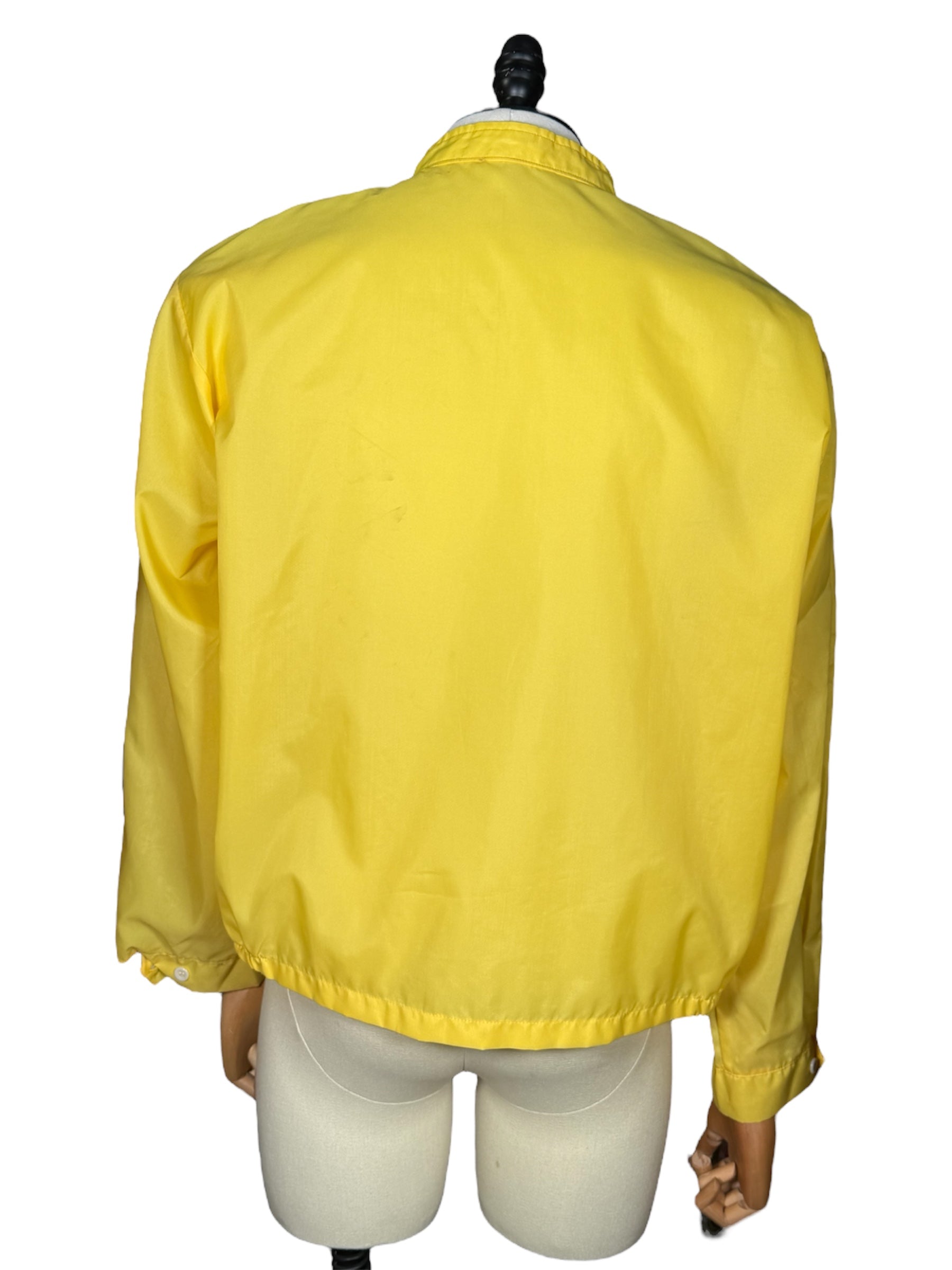 1970s "Kodak" Louisville Sportswear jacket. This yellow and black jacket features a stripe of boxes labeled Kodak in red down the front. It attaches at the front with a metal zipper and has two decorative, white, plastic buttons on the collar. There is a slight condition issue with this jacket, pictured in the last photo. There is a slight mark on the back of the jacket. This item is marked an X-Large, but please refer to the measurements as sizing changes based on the decade.