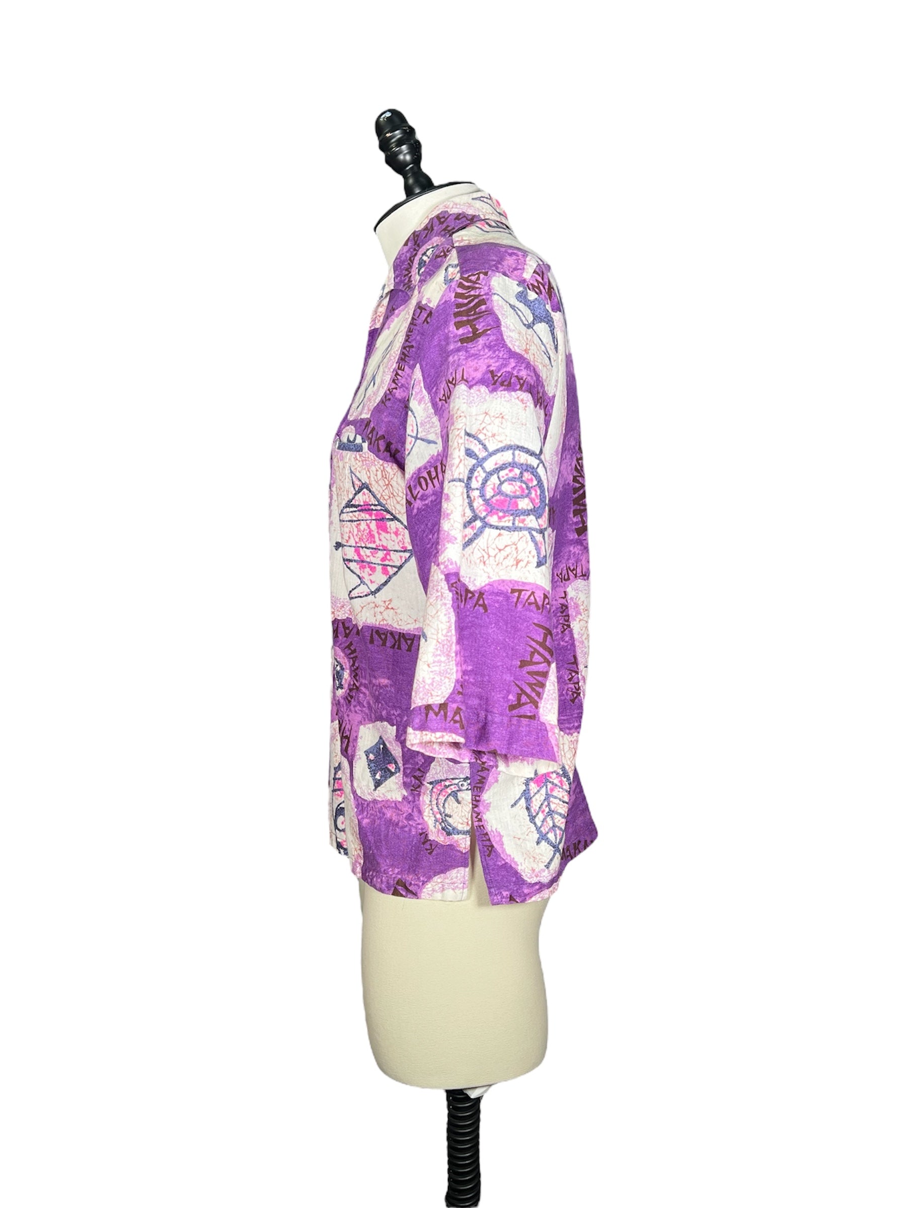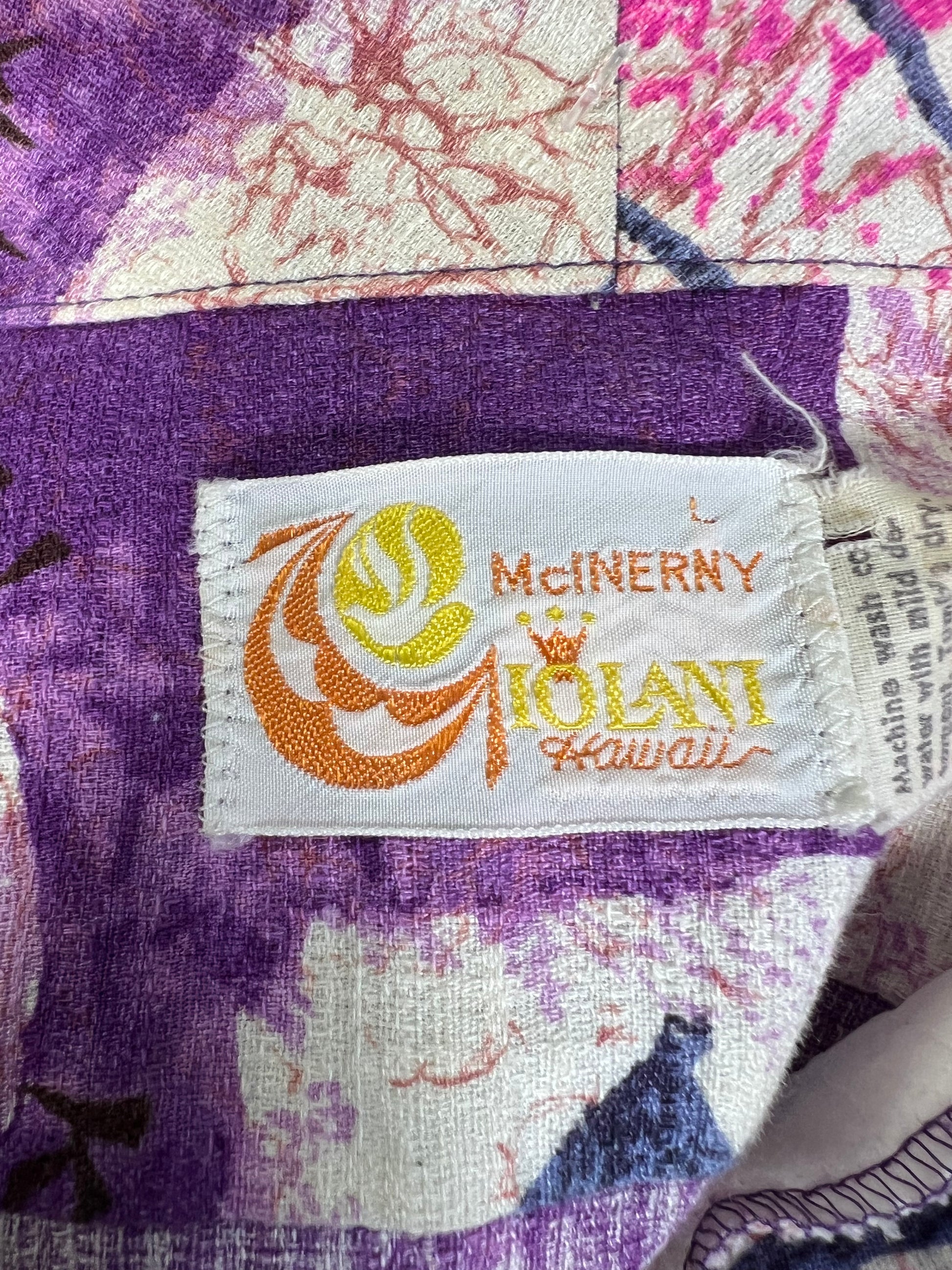 1970s McInerny Iolani Hawaiian shirt. This shirt features one button on the upper chest and a dagger collar. It has purple, white, and pink colors and has a turtle and fish print. The shirt has 3/4 sleeves and the material is 100% cotton. It is marked a size large, but please refer to the measurements as each decade has different sizing.