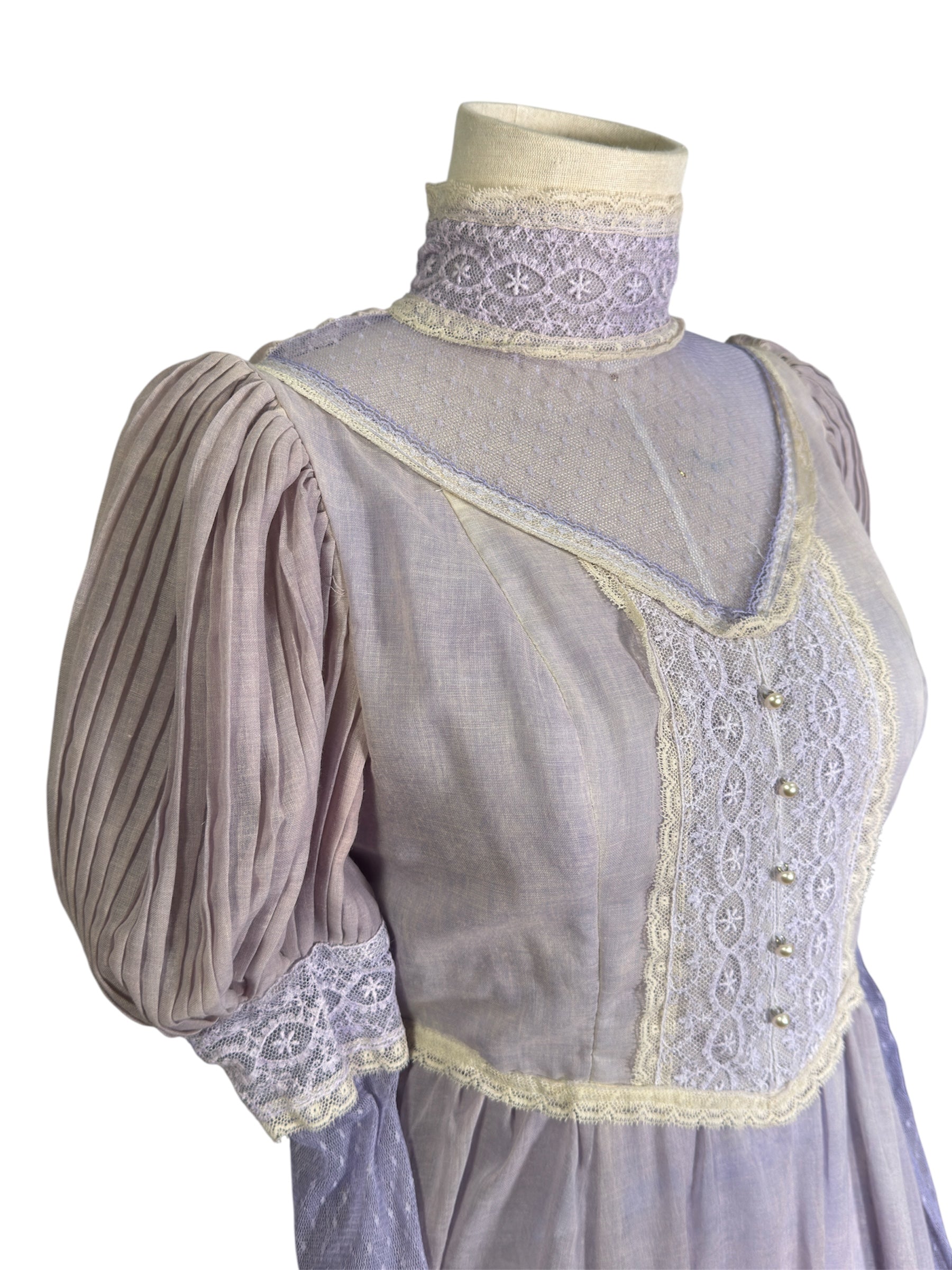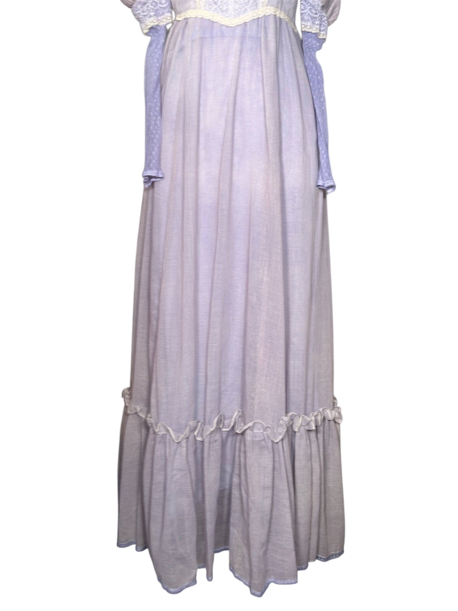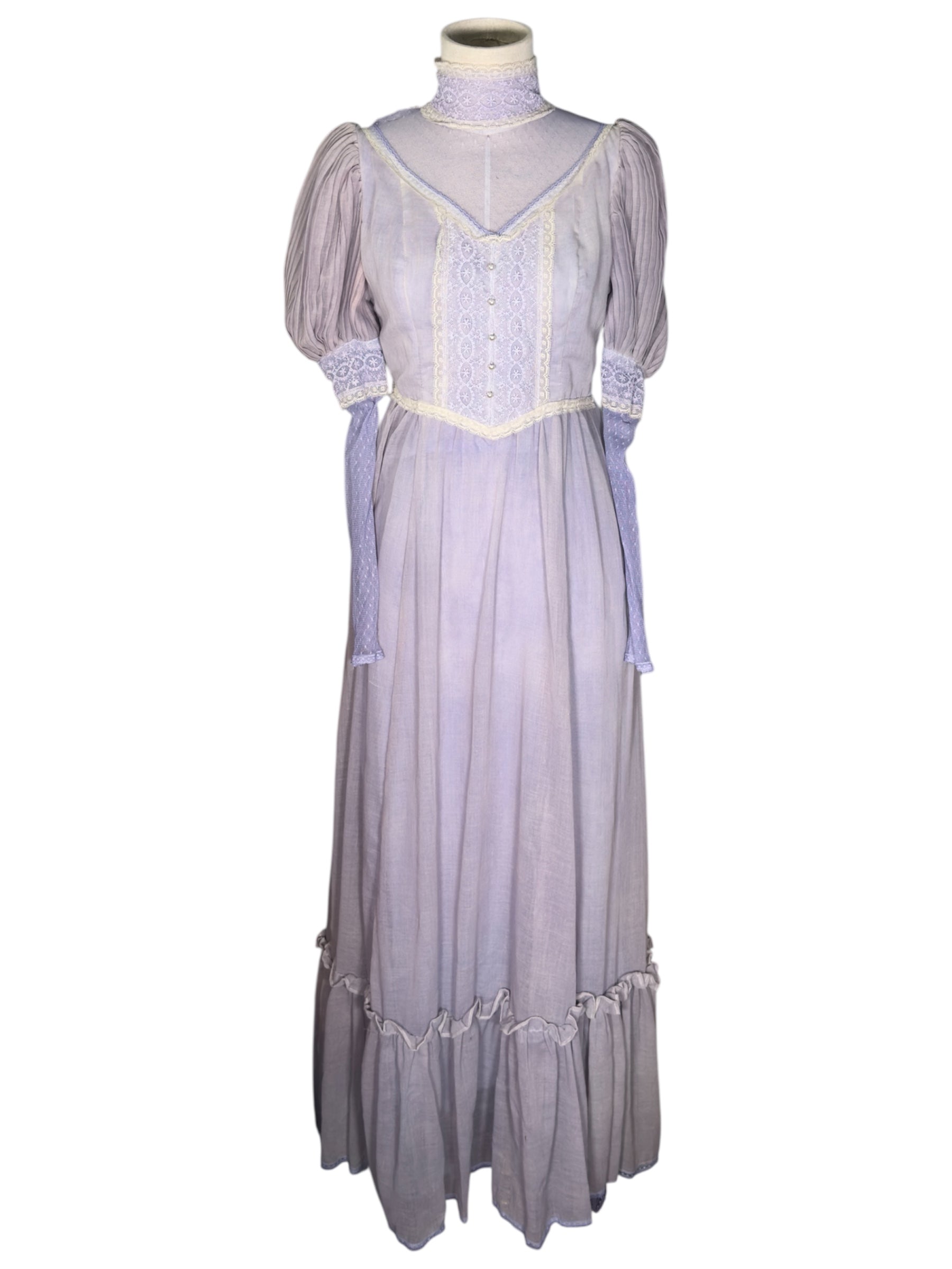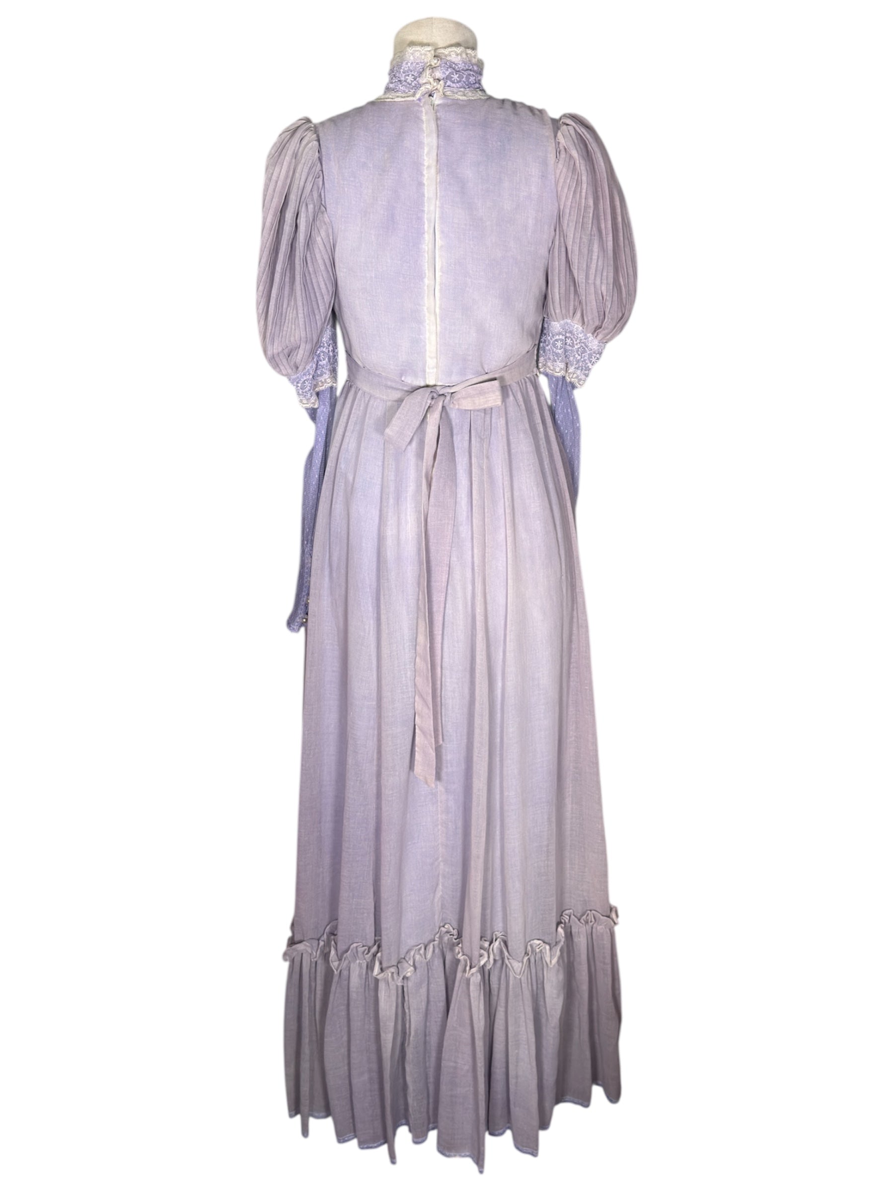 1970s unlabeled prairie dress. This lilac-colored dress was likely hand-dyed and made in the style of a Gunne Sax dress. It has a high, lace collar, cream colored lace detailing on the bust, and a ruffle near the bottom of the dress. The sleeves of this dress are incredibly unique, featuring a puffed design at the shoulders that transitions to a lace sleeve. There is also a decorative bow at the back that can be used for cinching. This dress attaches at the back with a zipper and two buttons on the back of the collar. There is a slight condition issue with this dress, pictured in the last photo. The dress is missing one of the three buttons originally there on the back of the collar.