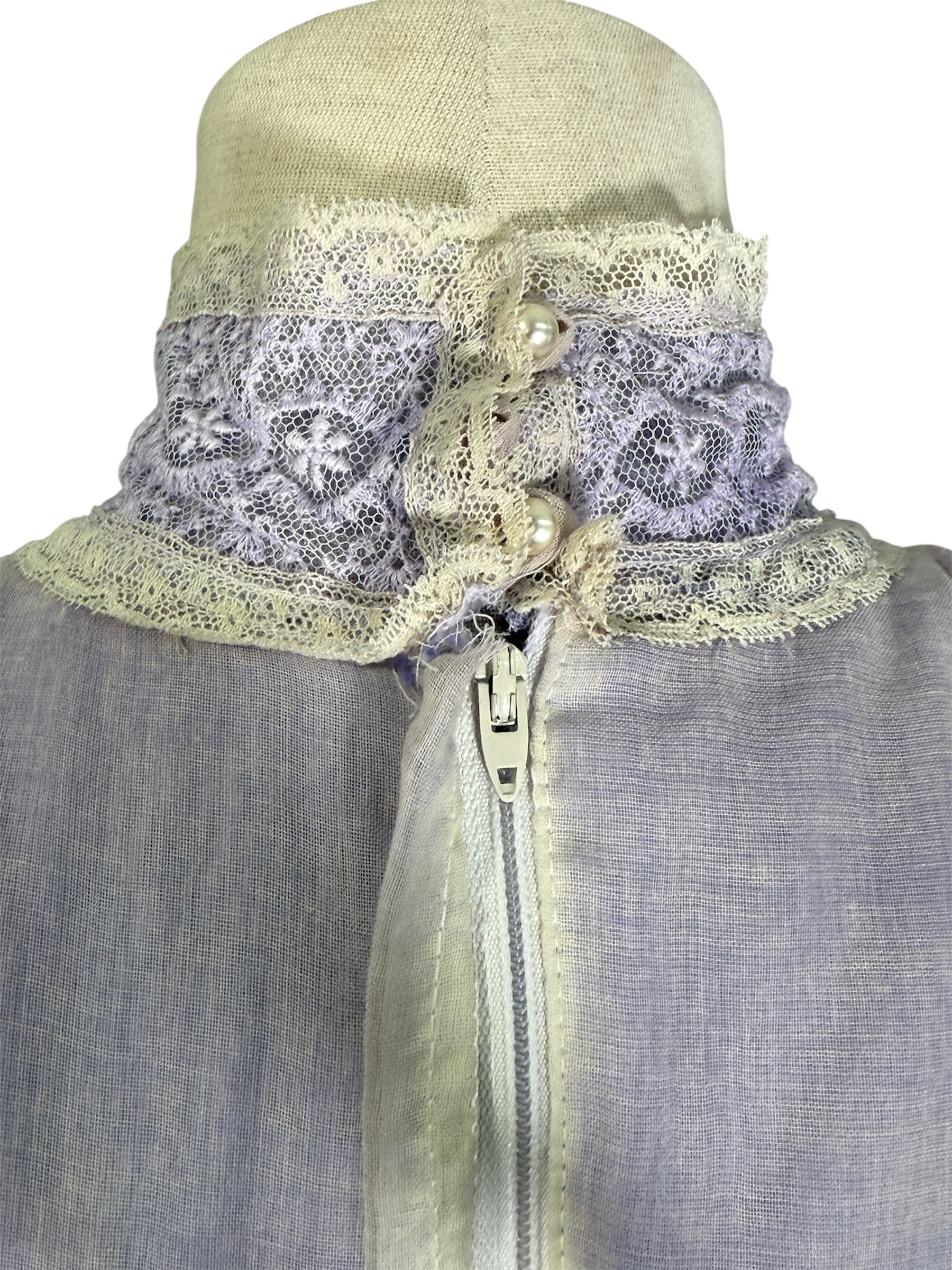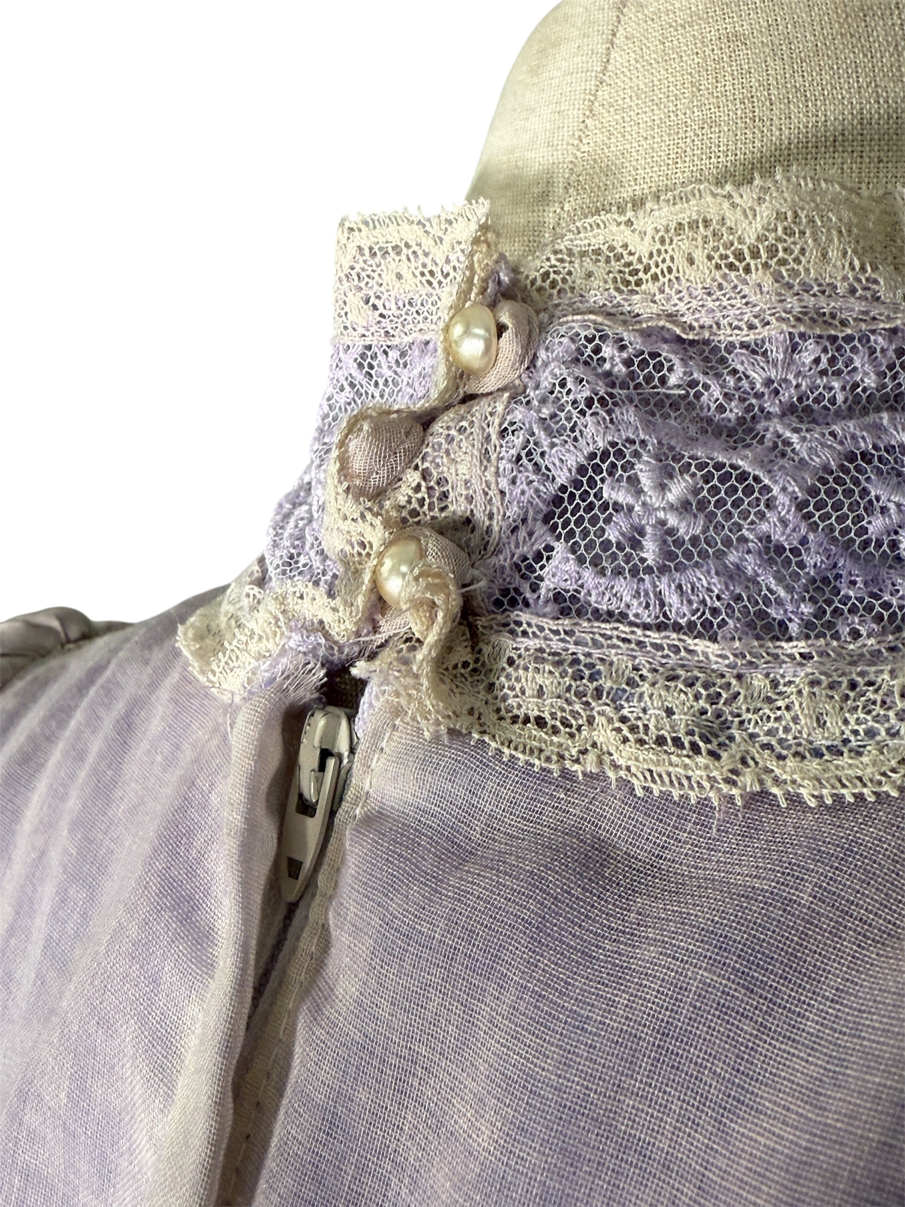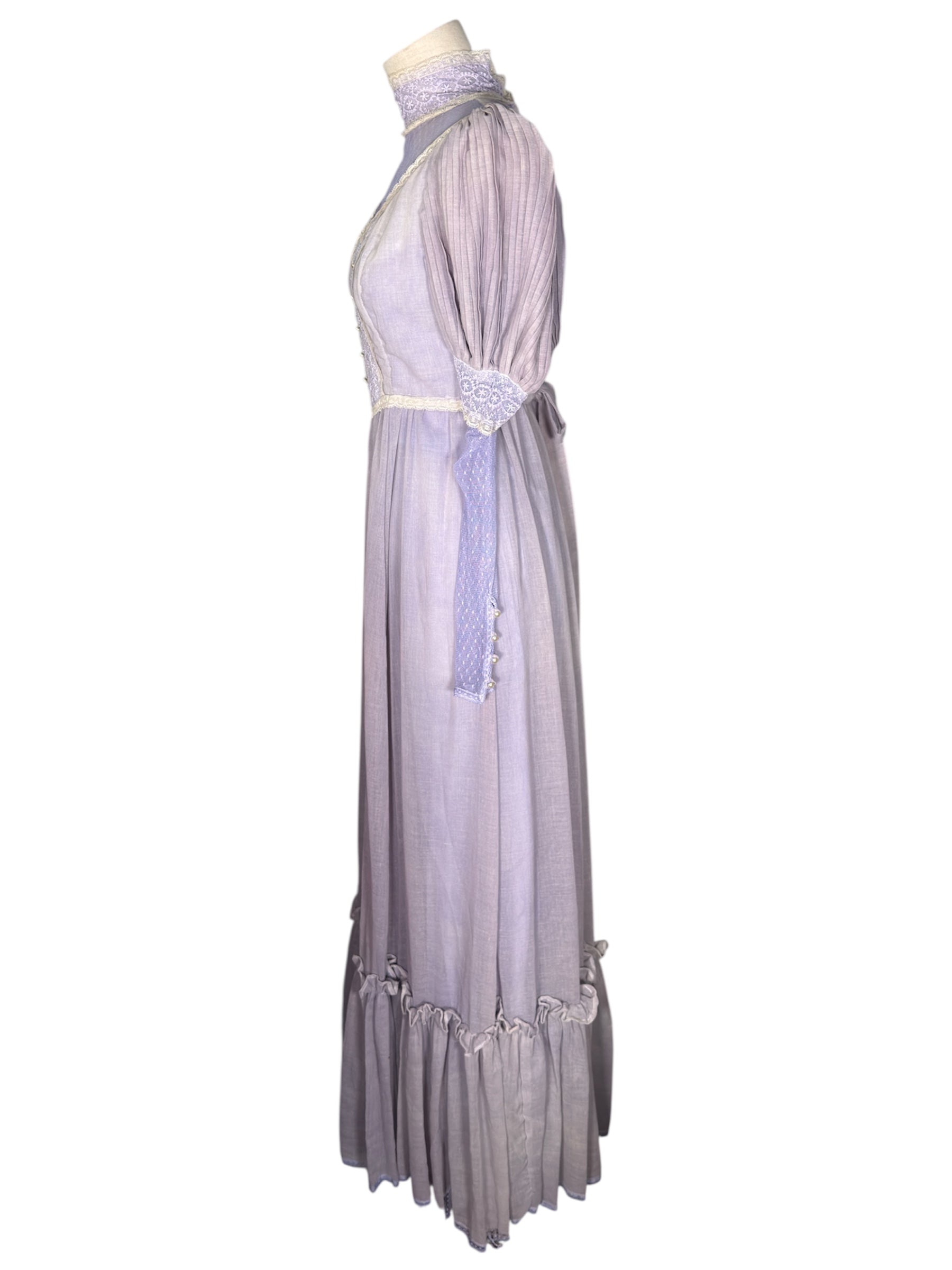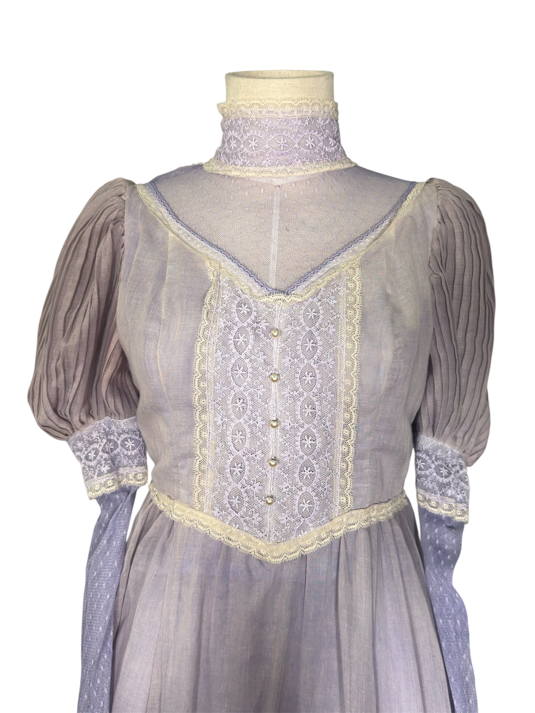 1970s unlabeled prairie dress. This lilac-colored dress was likely hand-dyed and made in the style of a Gunne Sax dress. It has a high, lace collar, cream colored lace detailing on the bust, and a ruffle near the bottom of the dress. The sleeves of this dress are incredibly unique, featuring a puffed design at the shoulders that transitions to a lace sleeve. There is also a decorative bow at the back that can be used for cinching. This dress attaches at the back with a zipper and two buttons on the back of the collar. There is a slight condition issue with this dress, pictured in the last photo. The dress is missing one of the three buttons originally there on the back of the collar.