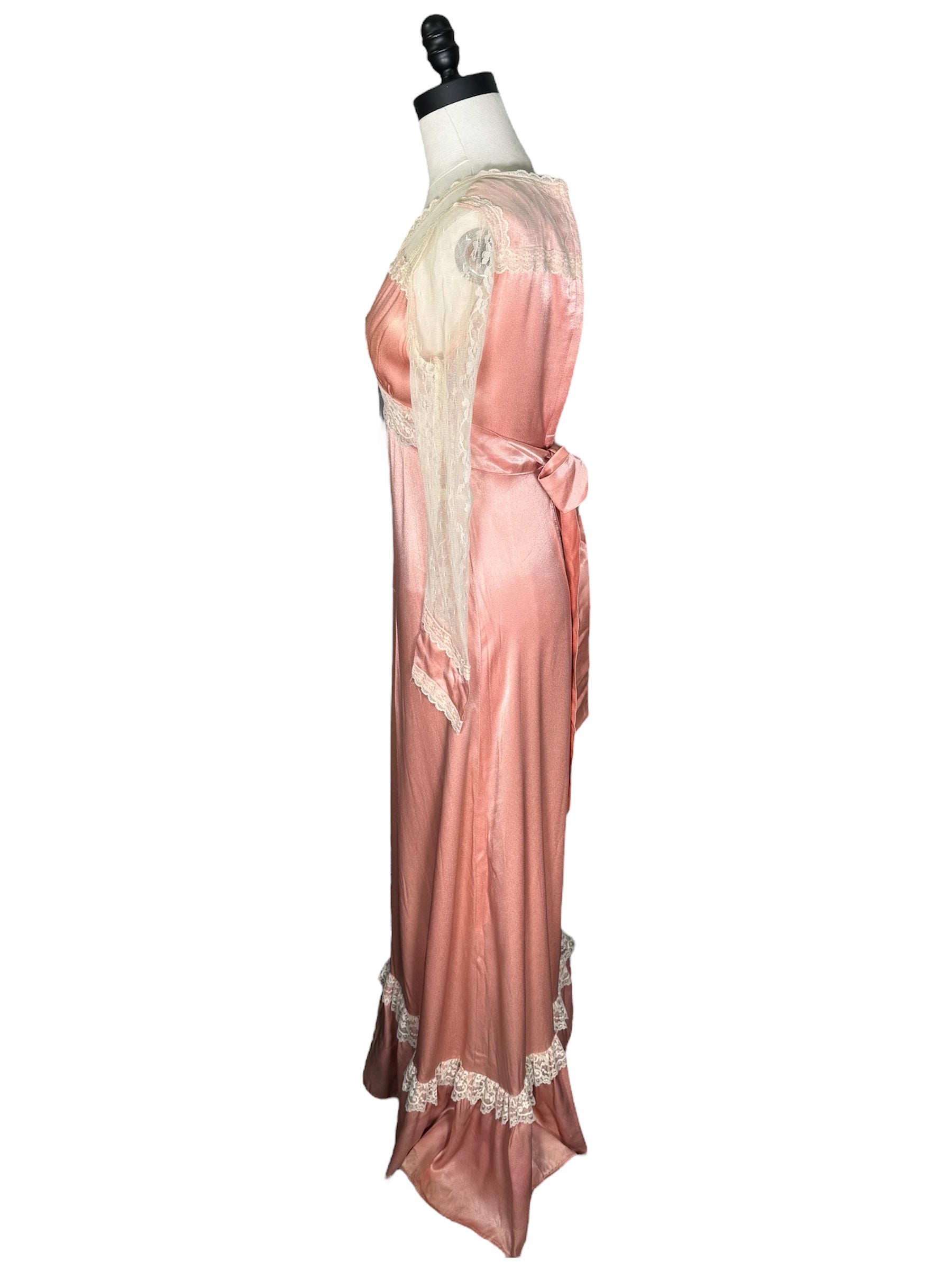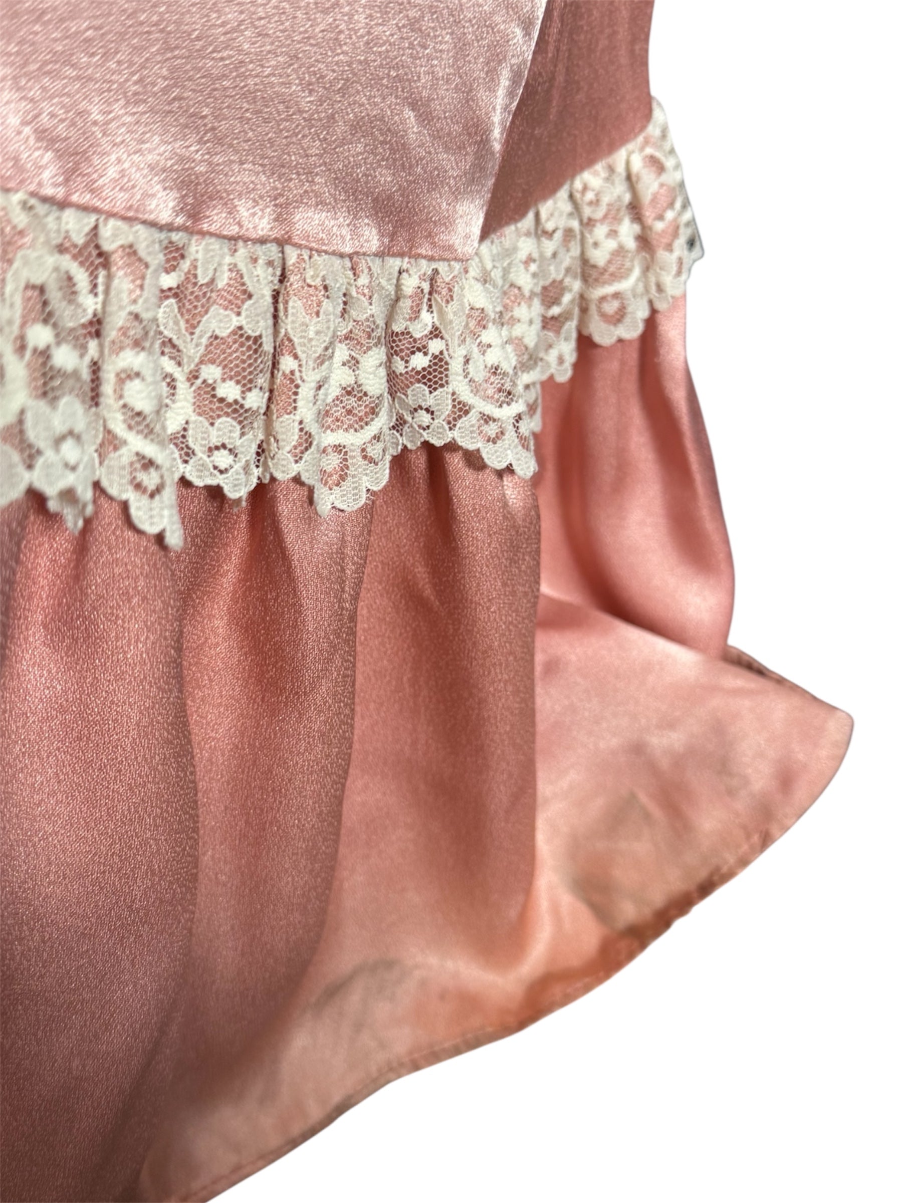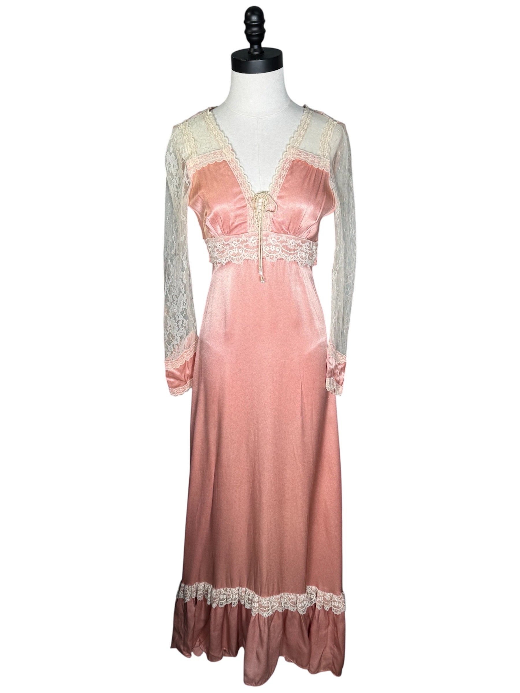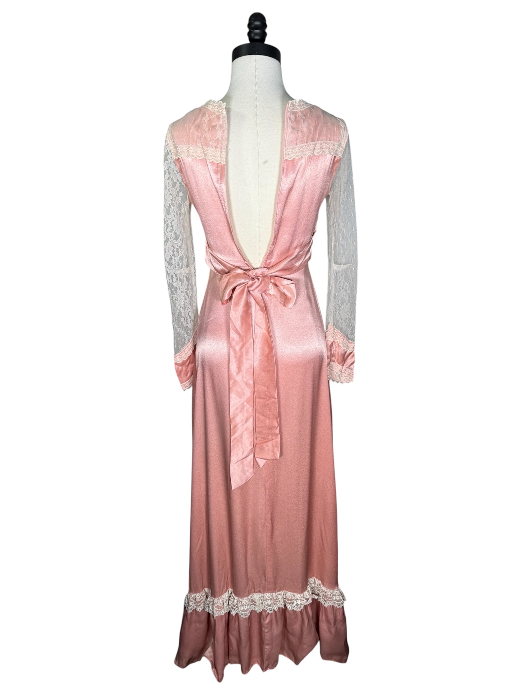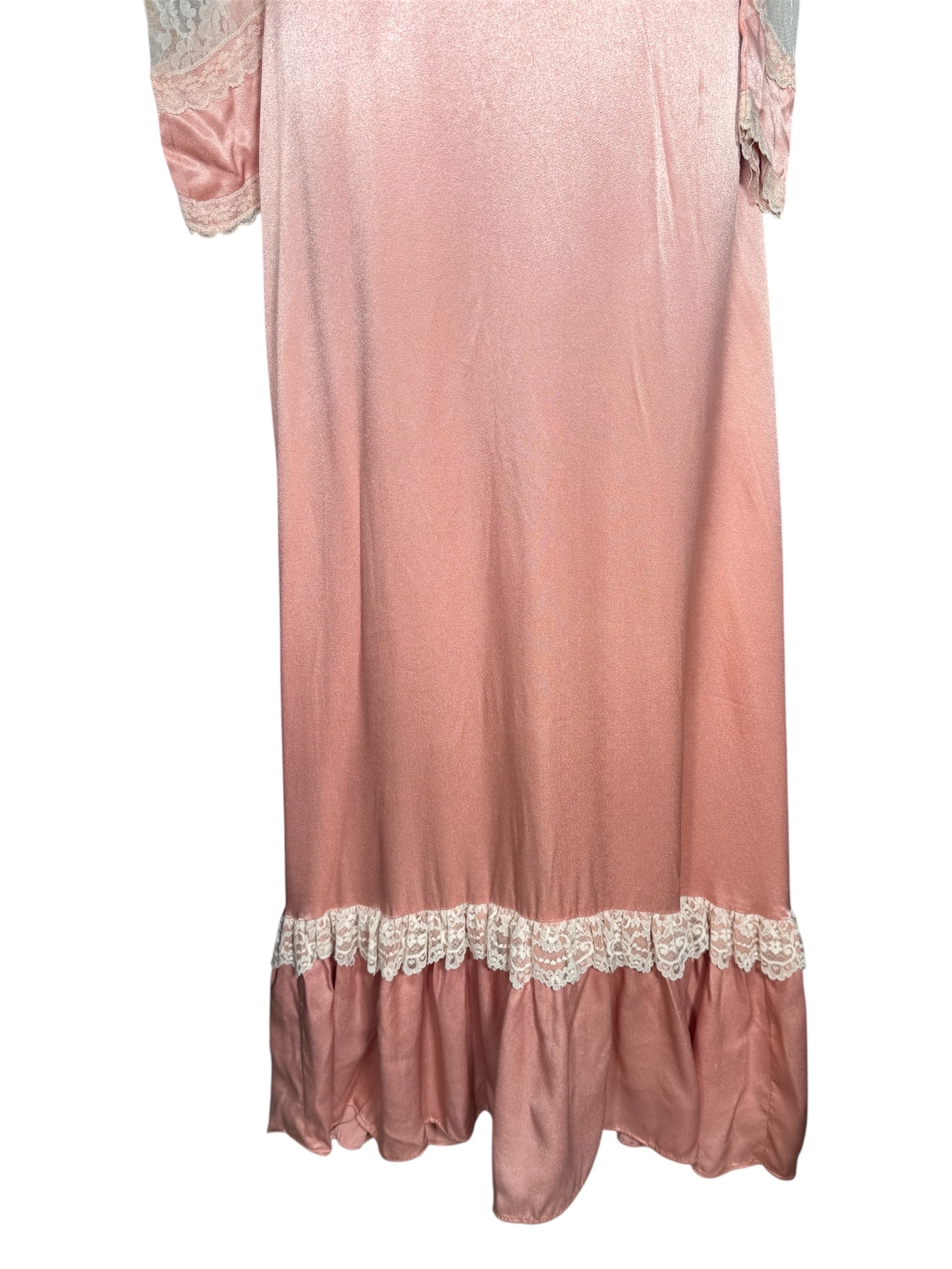1970s unlabeled, prairie, lace dress. This pink dress features white lace on shoulders, sleeves, waistline, and bottom of the dress. It has a tie at the top of the bust that serves as a decoration and can allow for extra room in the bust. This dress attaches at the back with a zipper. It functions normally, it is photographed with it unzipped due to the size of the dress. It also has a decorative ribbon at the back that can be tied into a bow. There is a slight condition issue with this item, pictured in the last photo. There is a couple of dark areas at the bottom of the side of the dress.