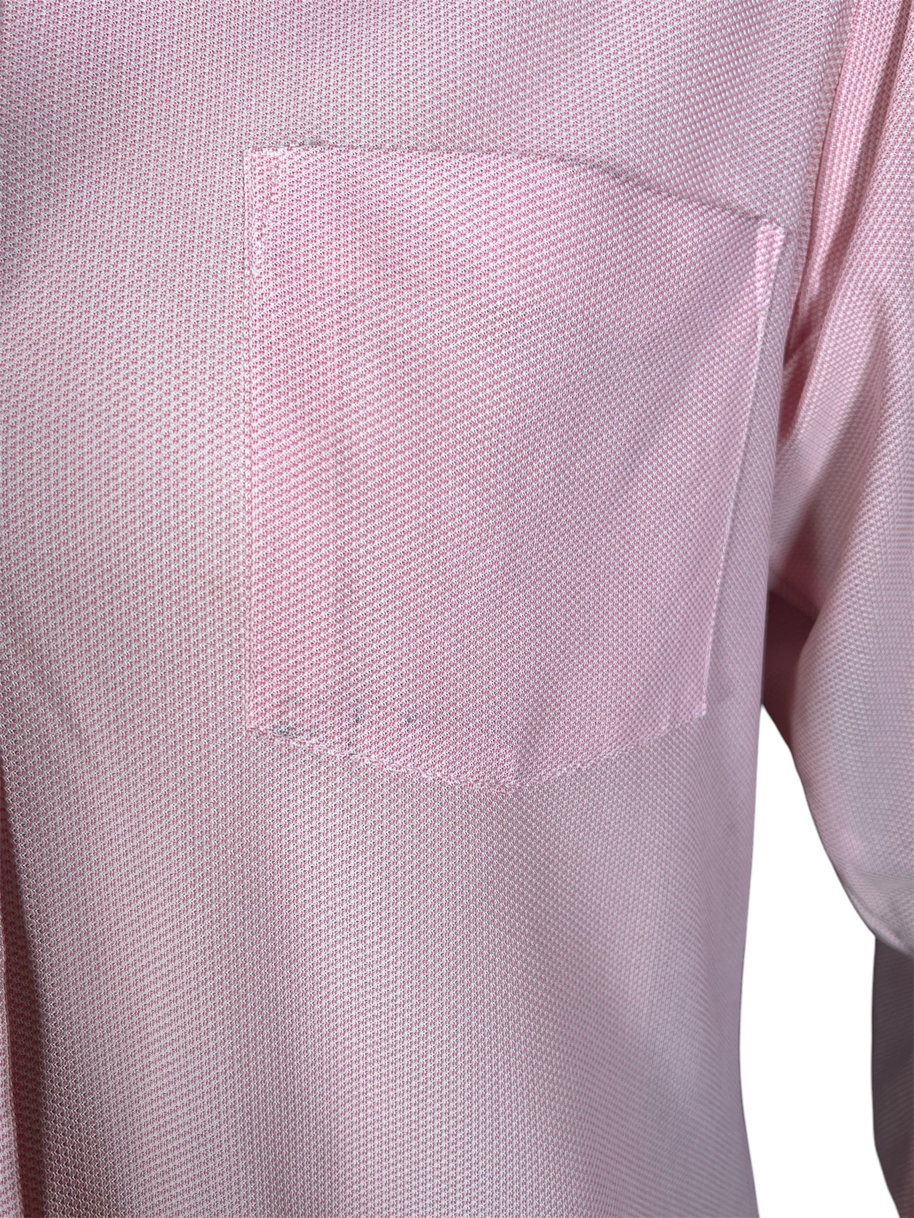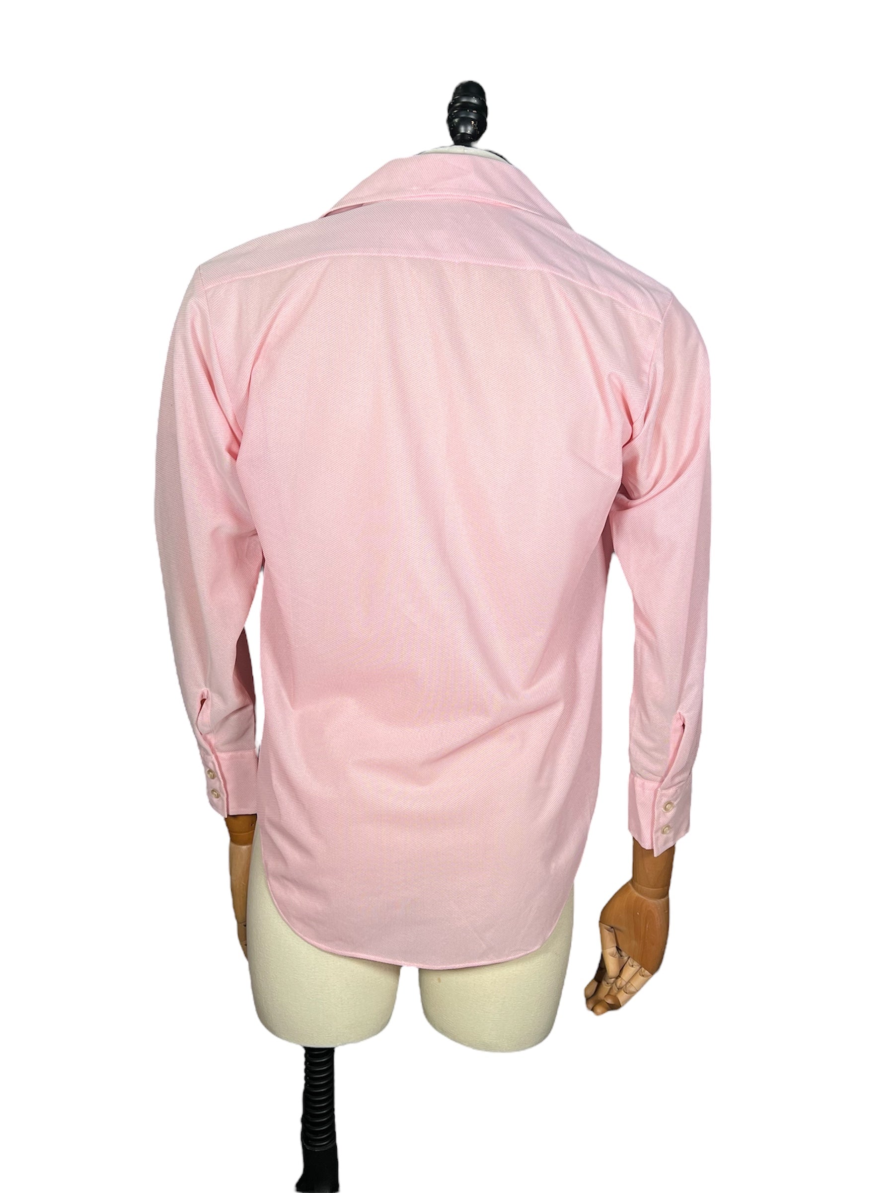 1970s Bold Knits button up shirt. This pink shirt is semi-sheer and buttons all the way to the collar. It has a dagger collar and one pocket on the chest. The material is polyester and nylon. There is a slight condition issue with this piece, pictured in the last two photos. There is a mark on one of the sleeves and on the pocket.