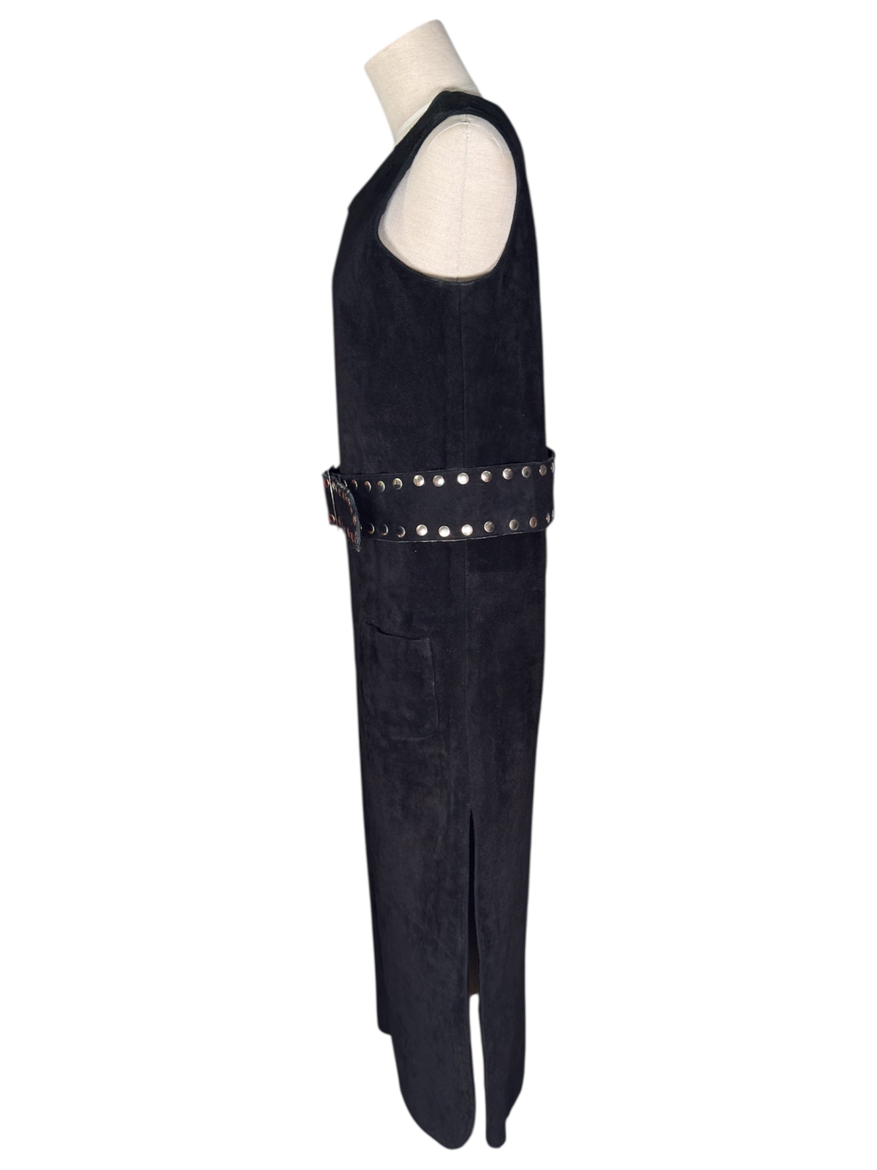 1970s Anne Klein by Saks Fifth Avenue suede leather dress. This black, sleeveless, leather dress with a studded belt is a sheath design with slits on the bottom of either side. There are pockets on the front of either hip. It attaches with a metal zipper at the back. There is a minor condition issue with this dress, pictured in the last photo. There is some minor damage on the top of the edge of the belt.