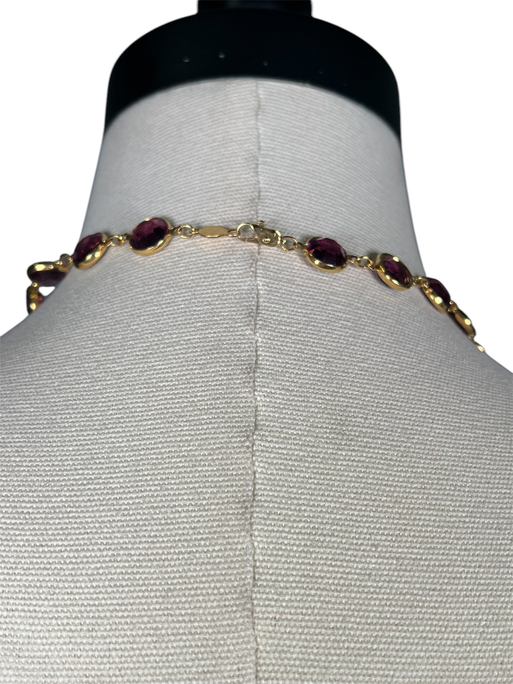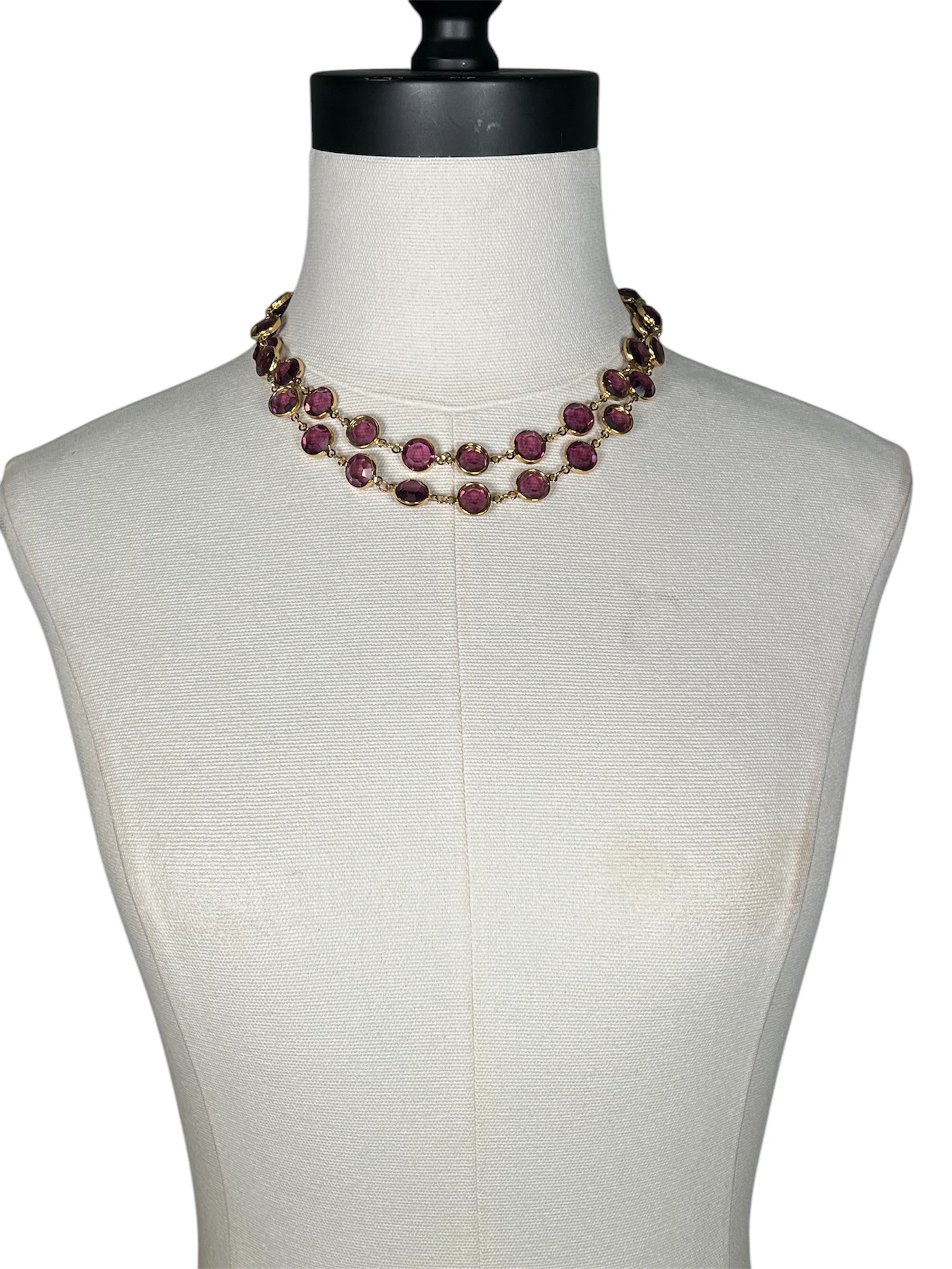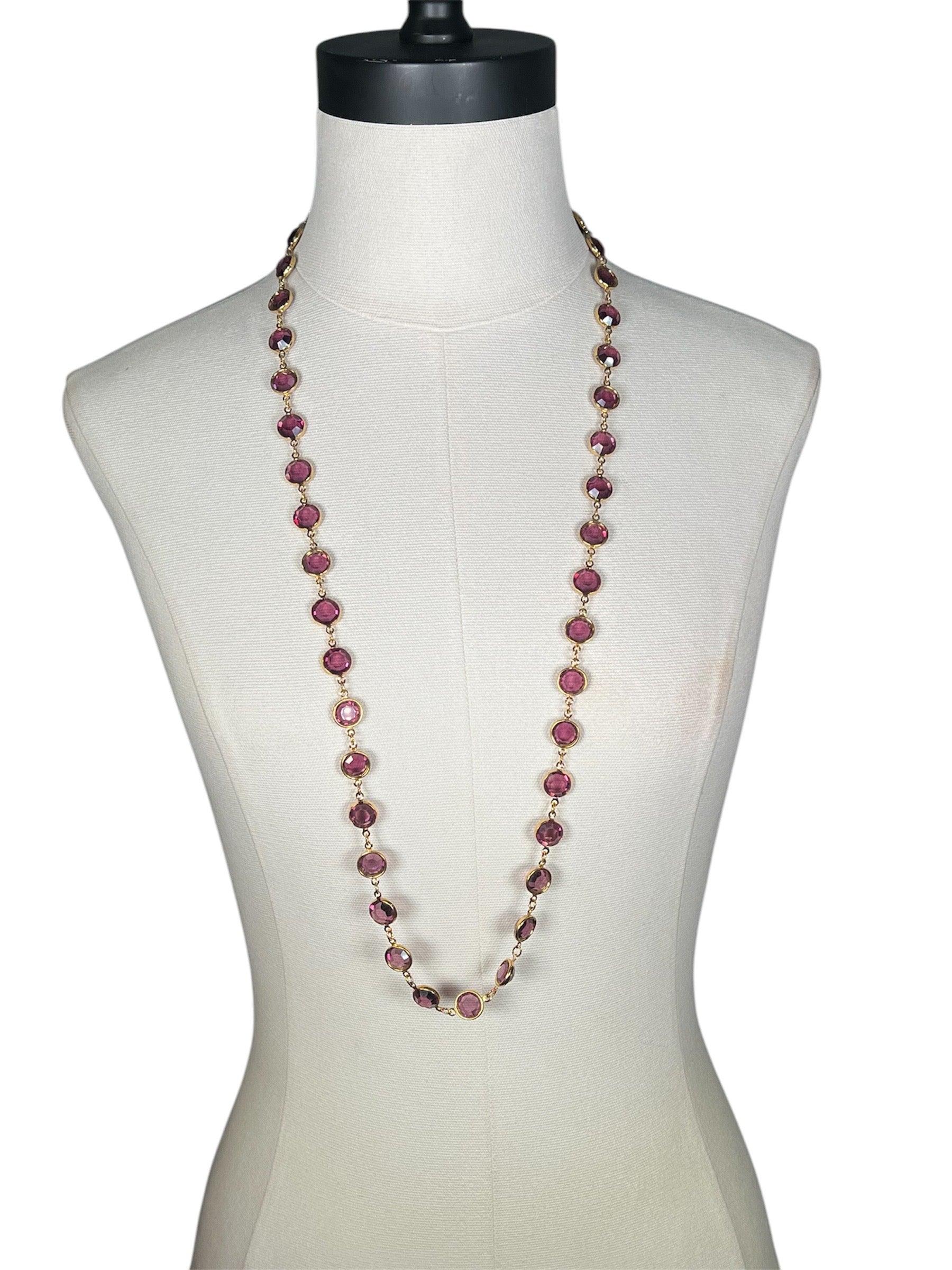1970s Swarovski crystal necklace. This long necklace can be worn doubled or as a long, single strand. This purple and gold costume jewelry piece is perfect for layering! There is a lobster clasp on the back that is not adjustable.
