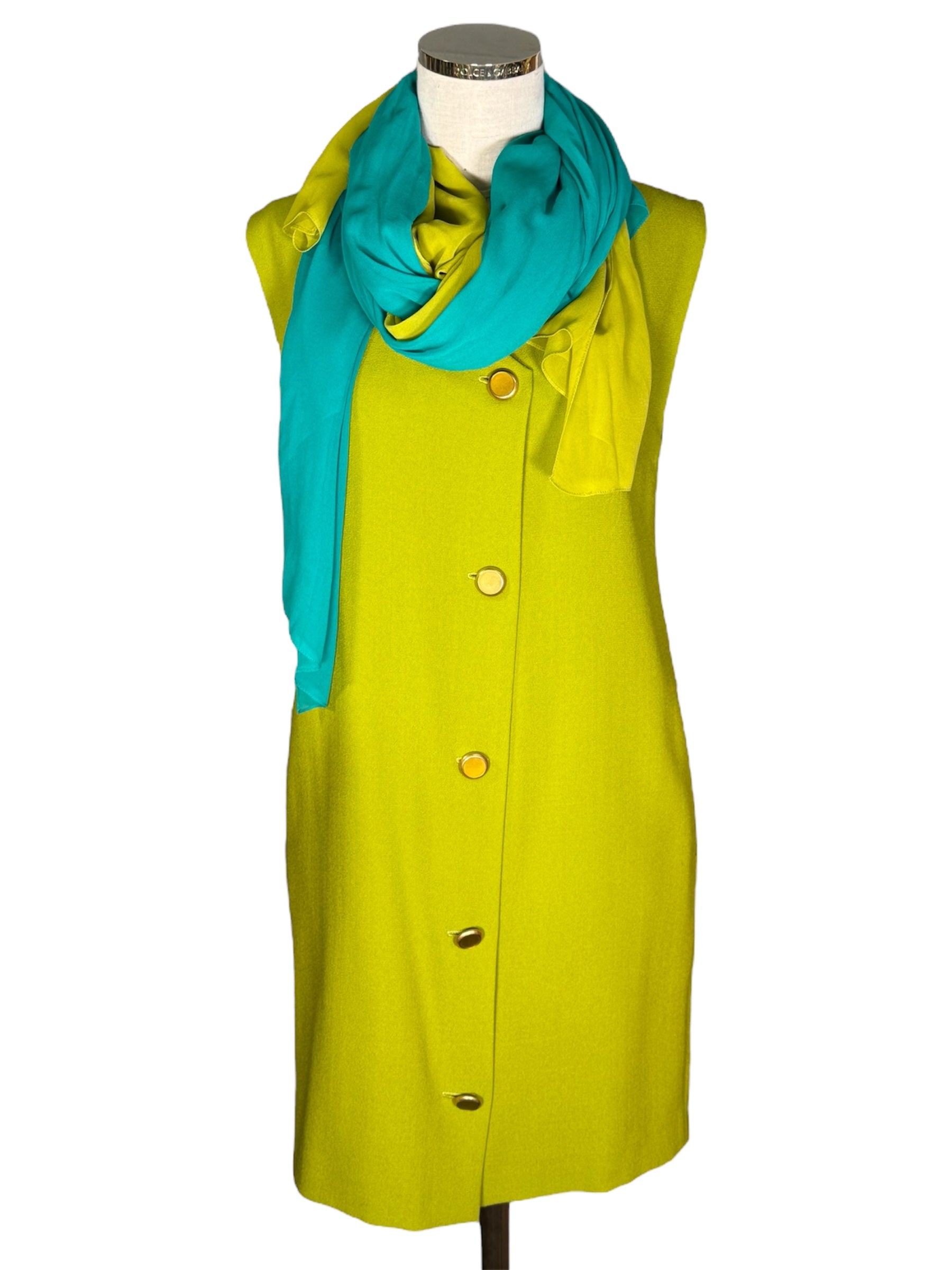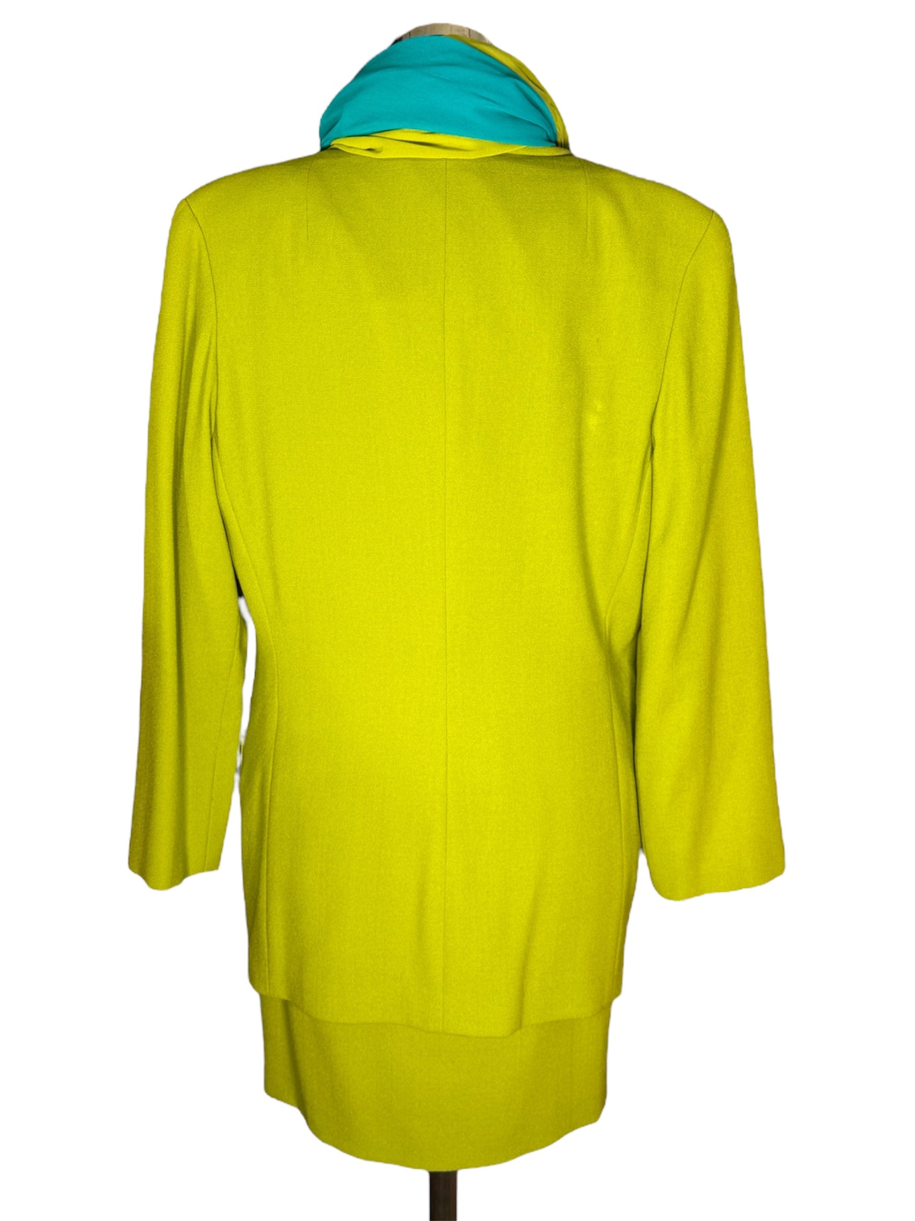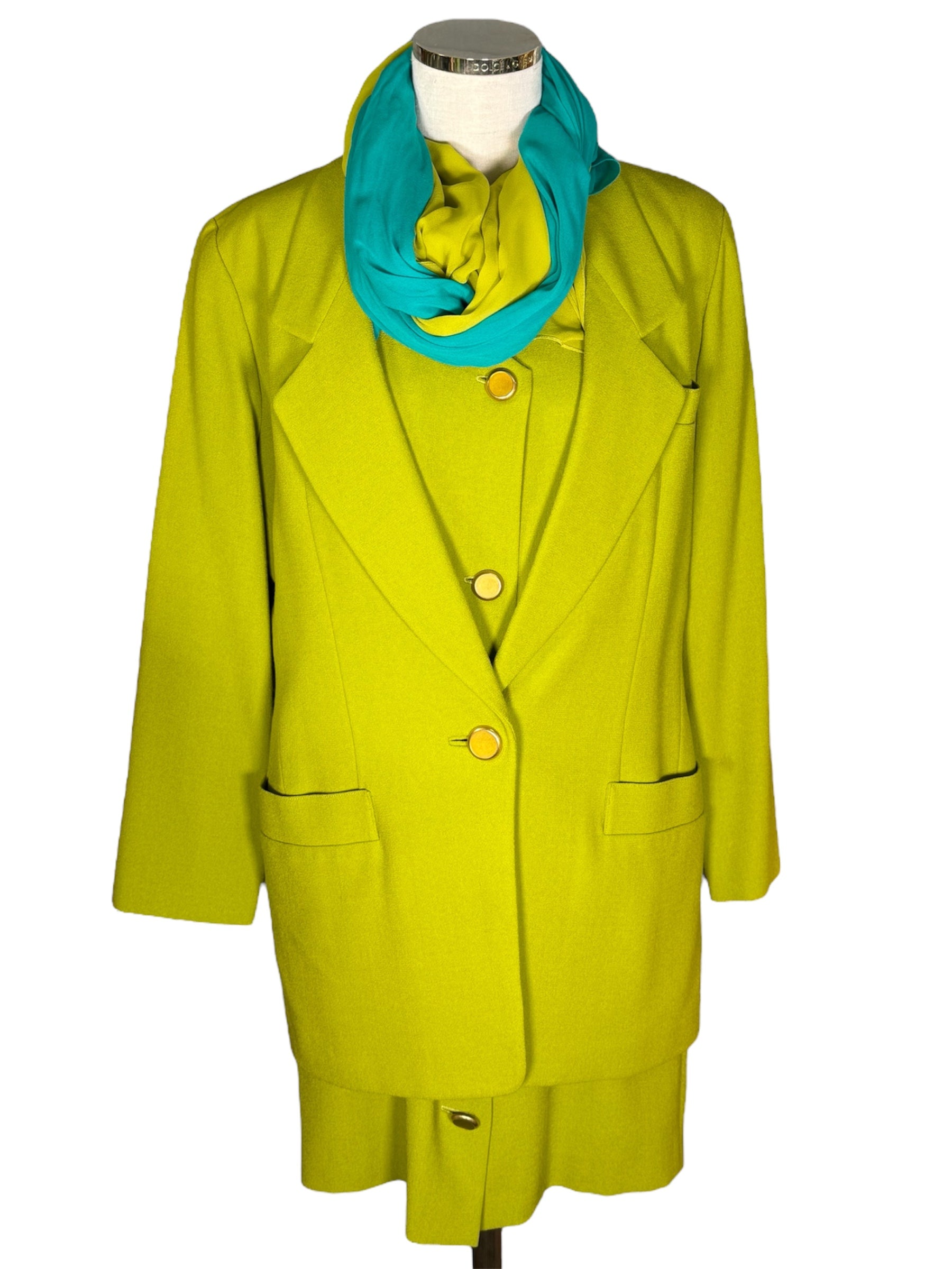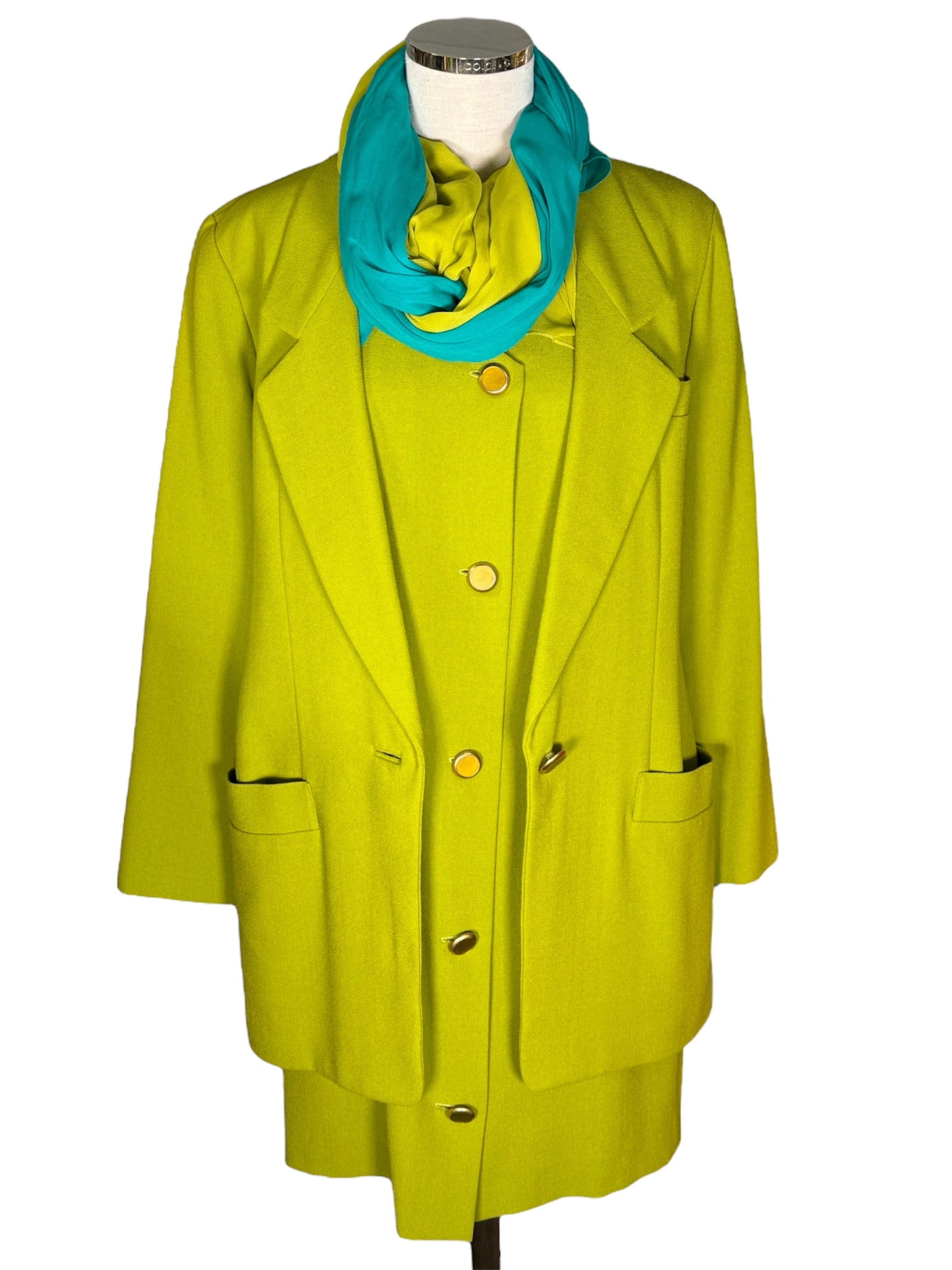 1980s Anne Klein and Co. sample dress, jacket, and scarf set. This green, crepe set features gold-toned buttons and a turquoise and green scarf. The jacket has shoulder pads and is oversized, while the dress does not have shoulder pads. The dress has a v-neck and attaches with the gold-toned buttons and hidden, metal snap closure at the top of the buttons. There is one flaw with this piece, shown in the last photo. There is a very minor stain on the front of the sleeve of the jacket.