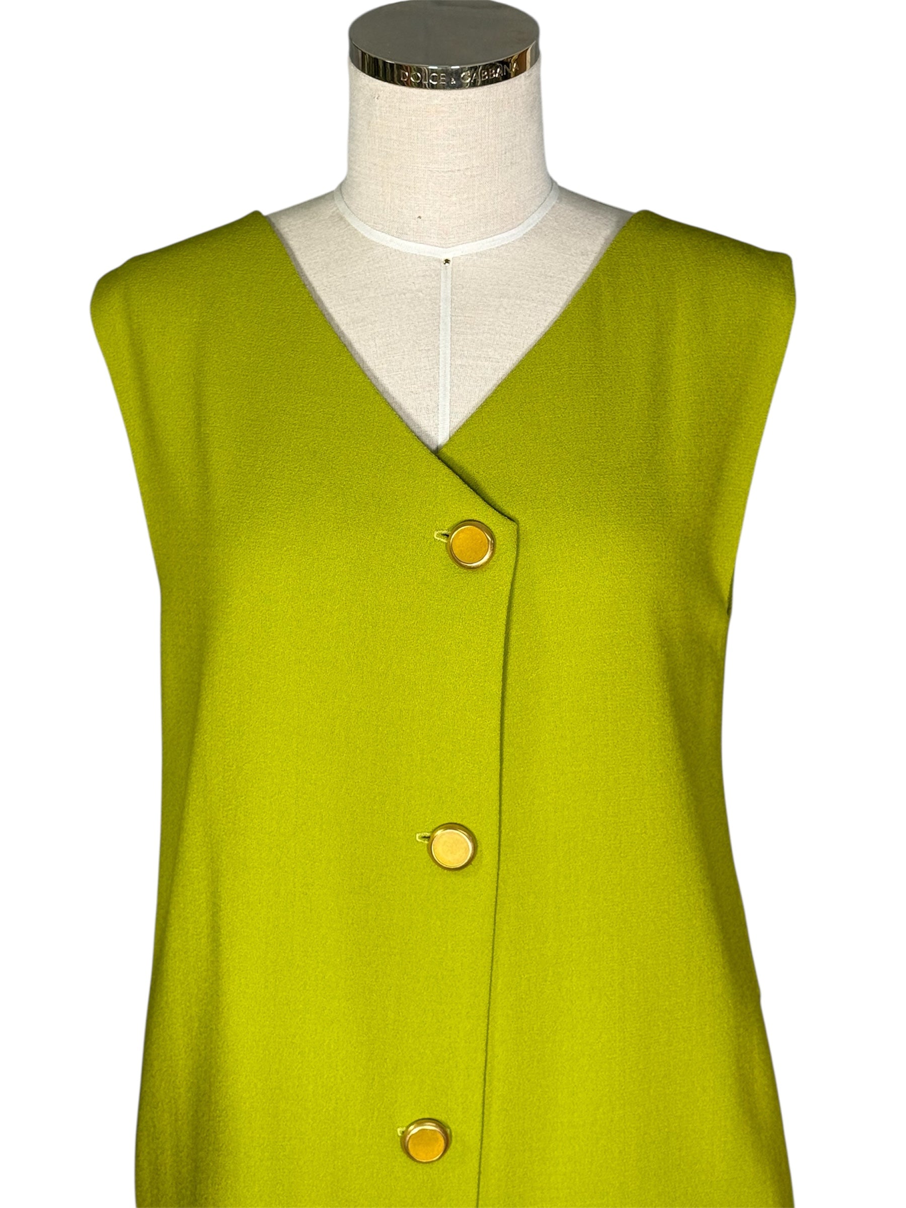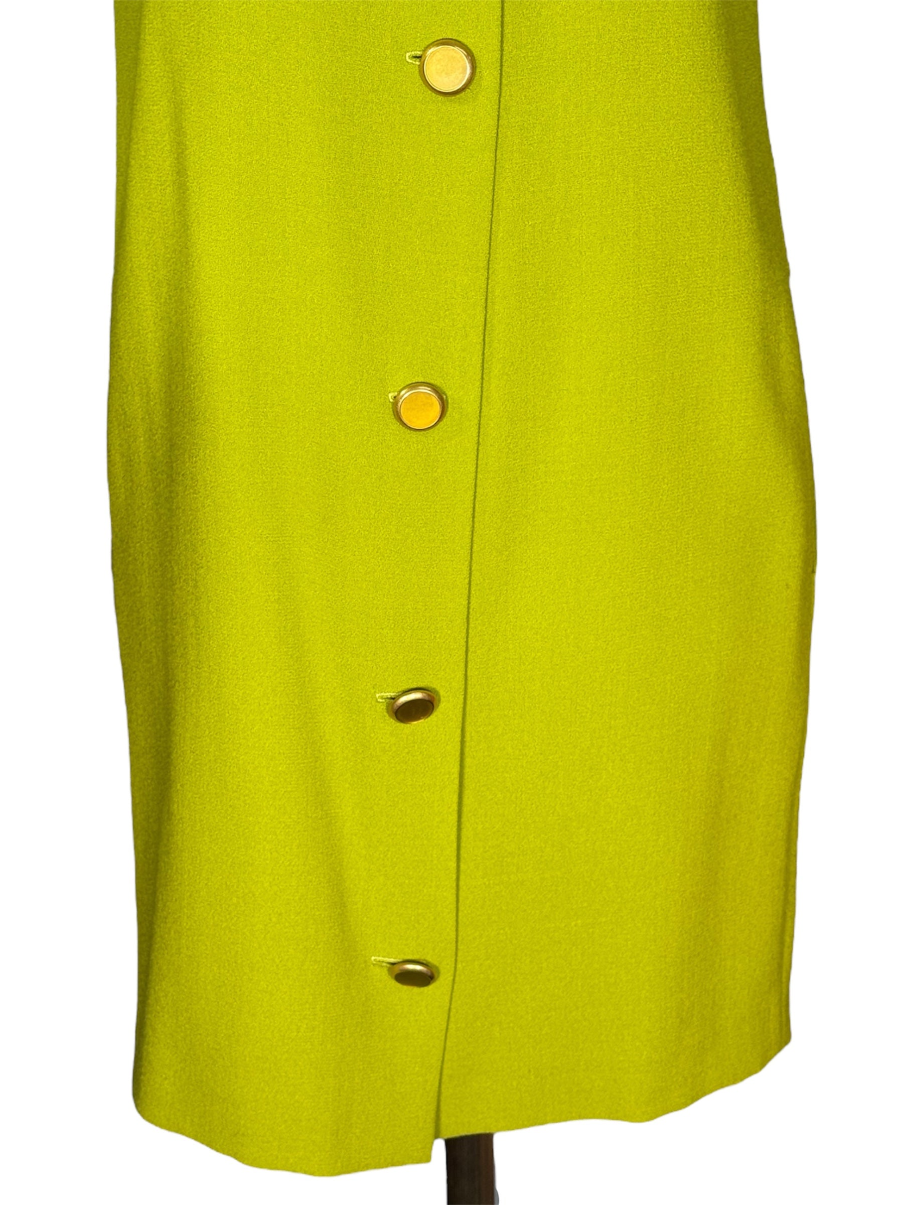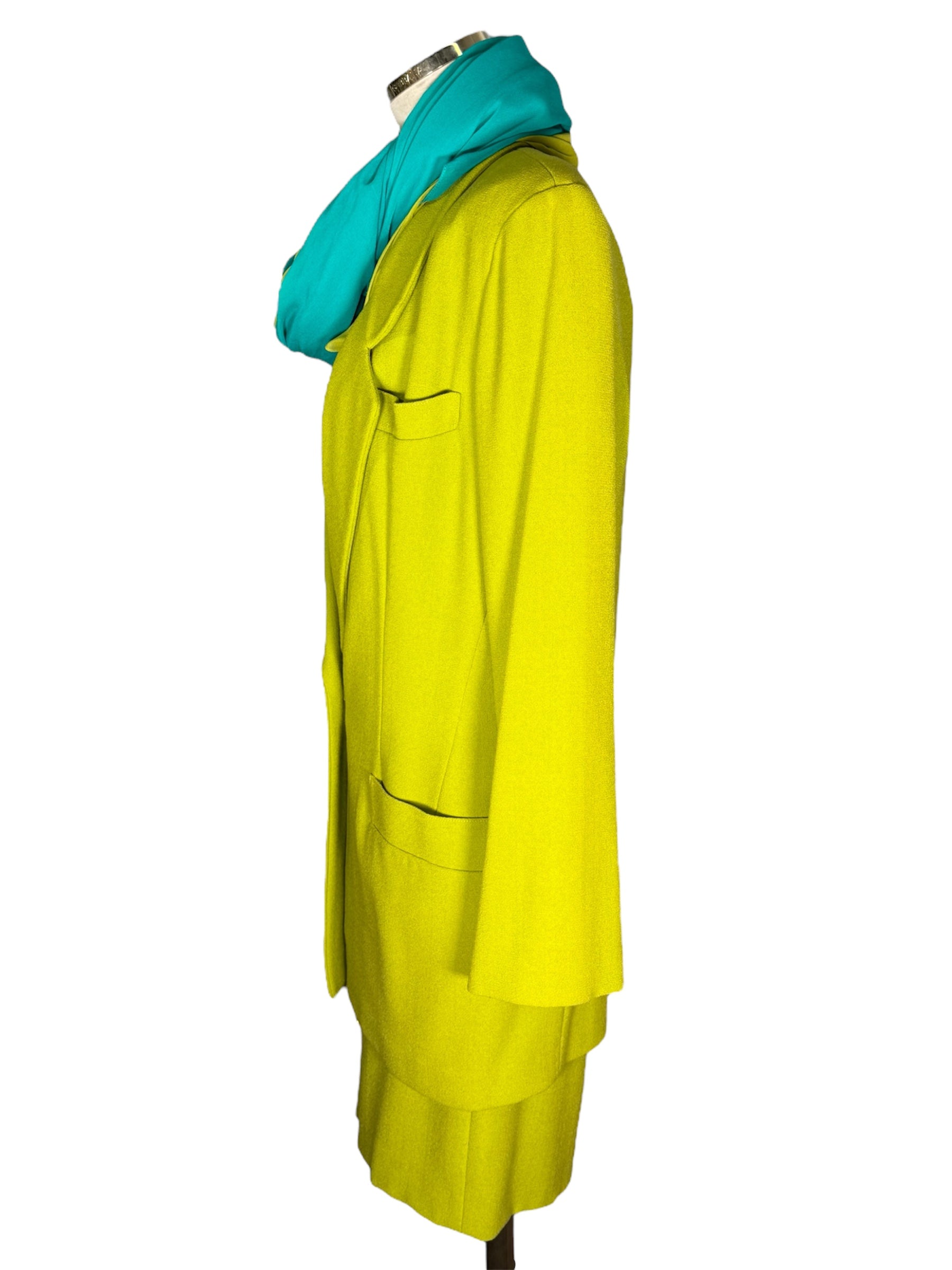 1980s Anne Klein and Co. sample dress, jacket, and scarf set. This green, crepe set features gold-toned buttons and a turquoise and green scarf. The jacket has shoulder pads and is oversized, while the dress does not have shoulder pads. The dress has a v-neck and attaches with the gold-toned buttons and hidden, metal snap closure at the top of the buttons. There is one flaw with this piece, shown in the last photo. There is a very minor stain on the front of the sleeve of the jacket.