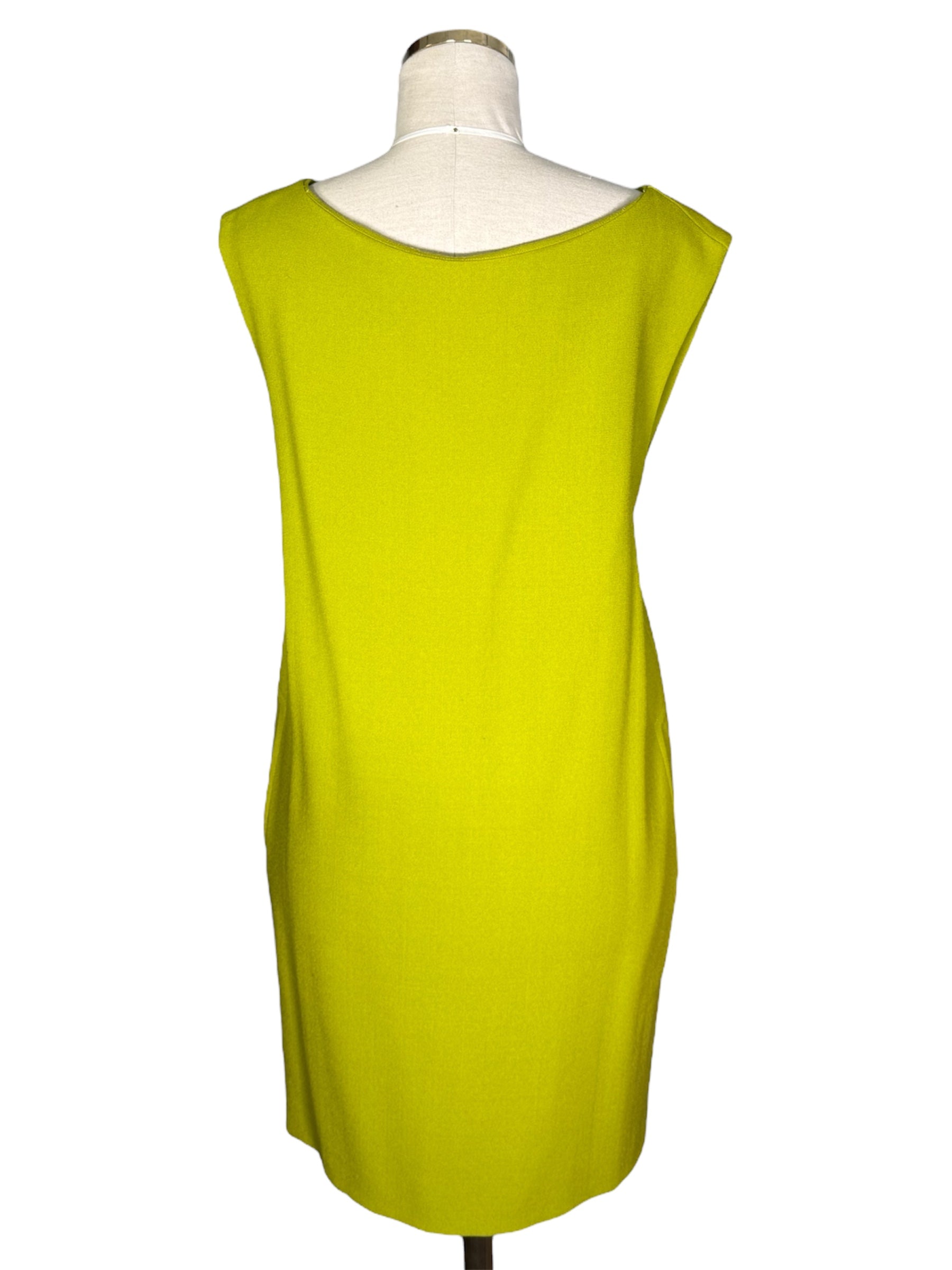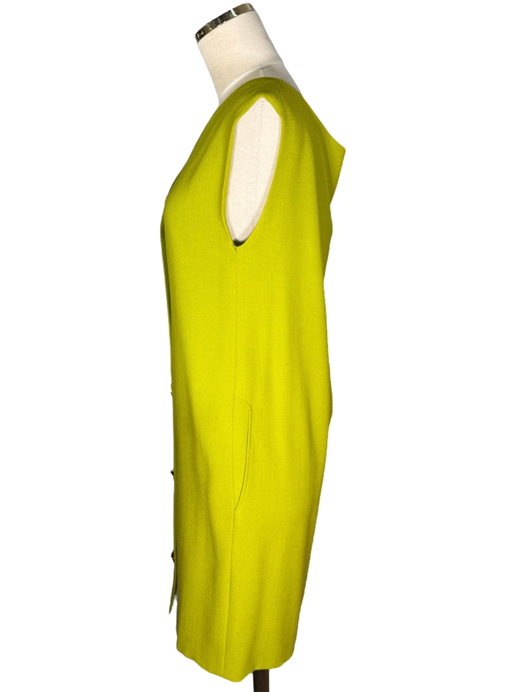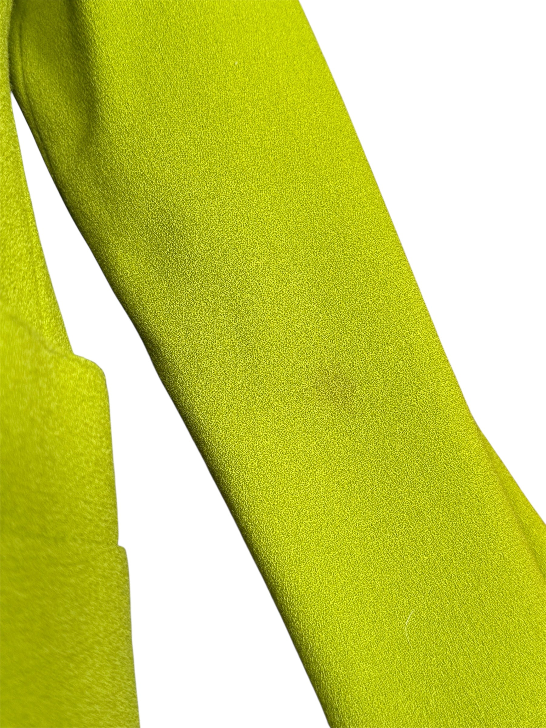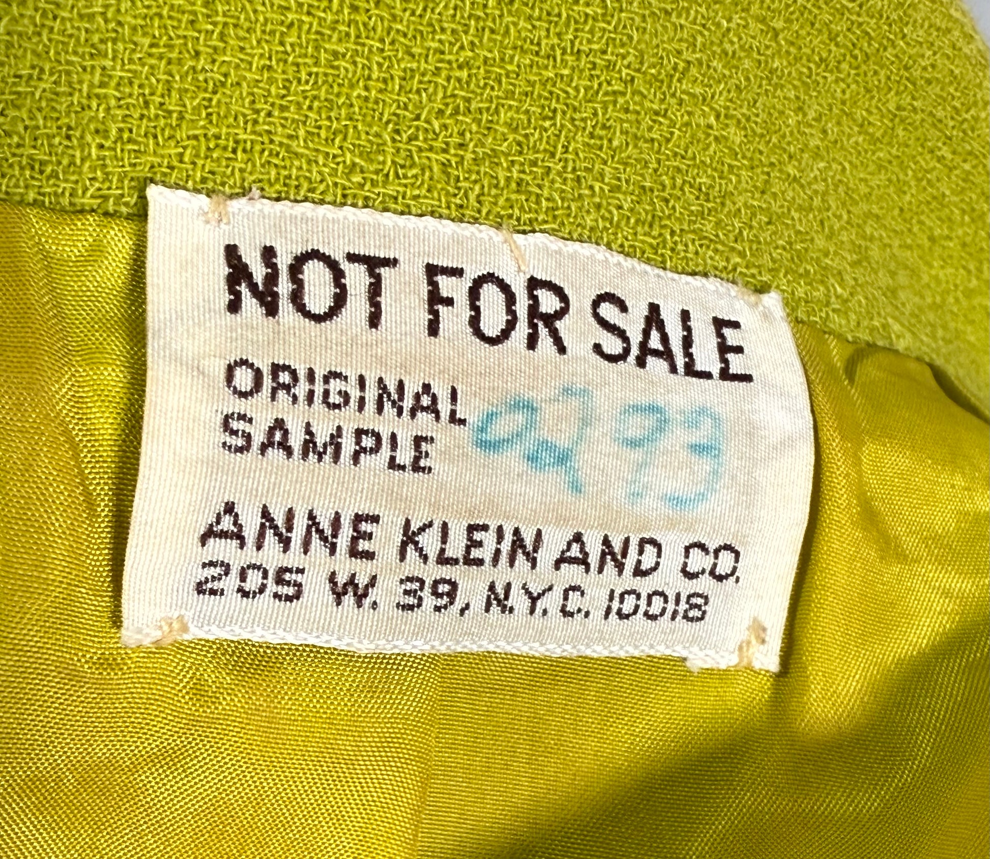 1980s Anne Klein and Co. sample dress, jacket, and scarf set. This green, crepe set features gold-toned buttons and a turquoise and green scarf. The jacket has shoulder pads and is oversized, while the dress does not have shoulder pads. The dress has a v-neck and attaches with the gold-toned buttons and hidden, metal snap closure at the top of the buttons. There is one flaw with this piece, shown in the last photo. There is a very minor stain on the front of the sleeve of the jacket.