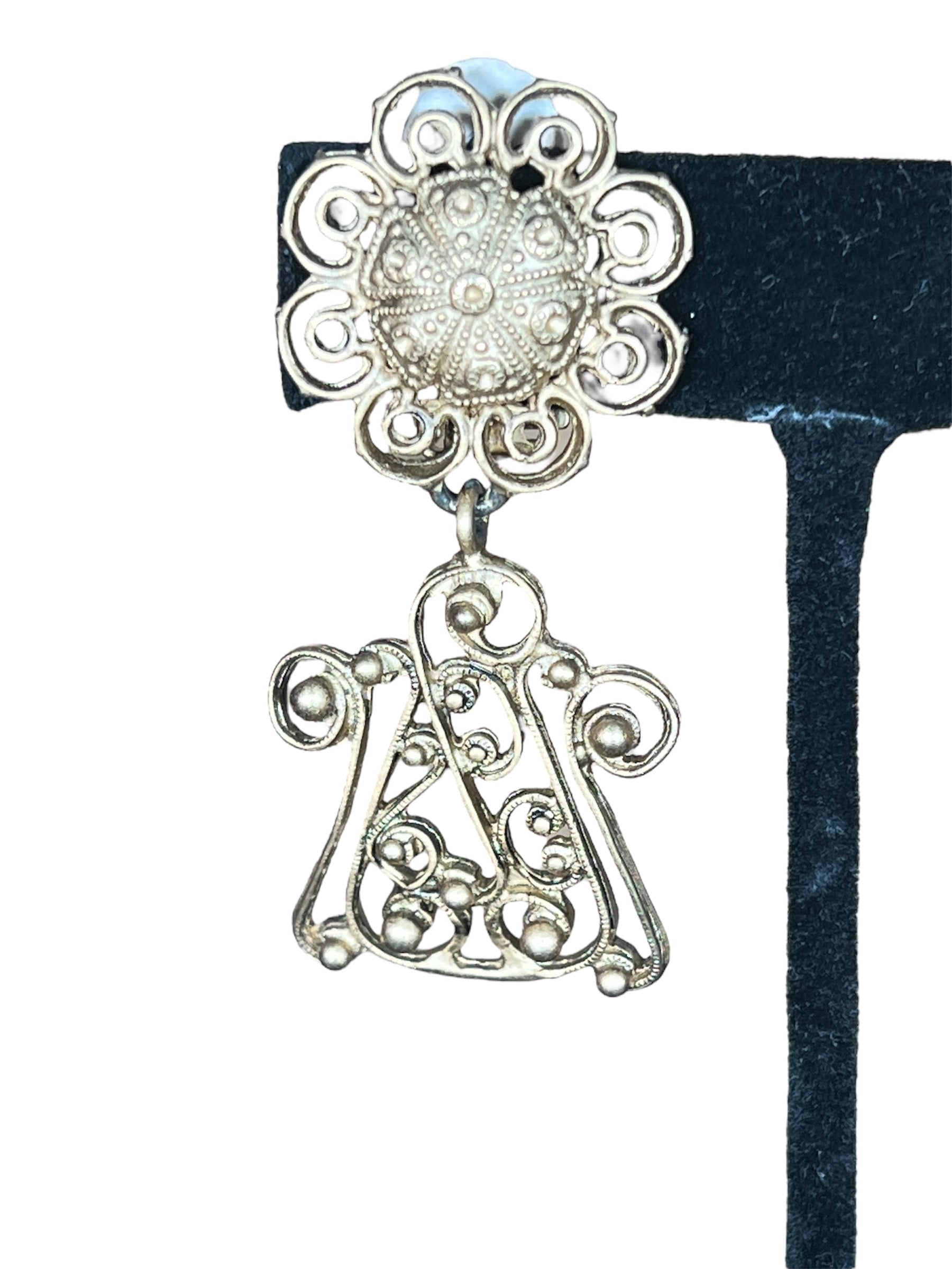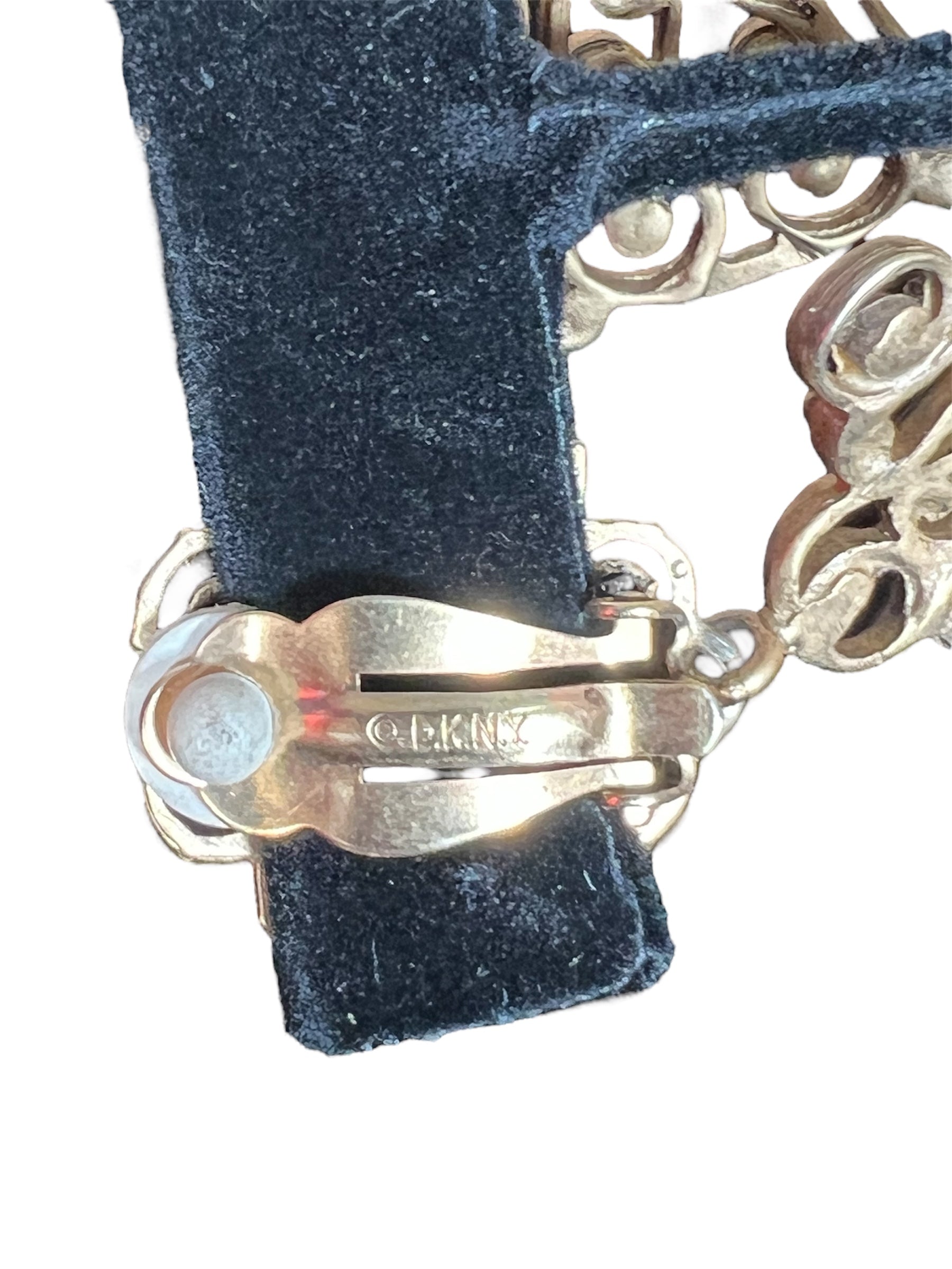 1980s DKNY earrings. These costume jewelry earrings feature a metal flower on the top and an abstract design on the bottom. These bronze, drop earrings are clip on earrings and have a signature, visible on the last photo.