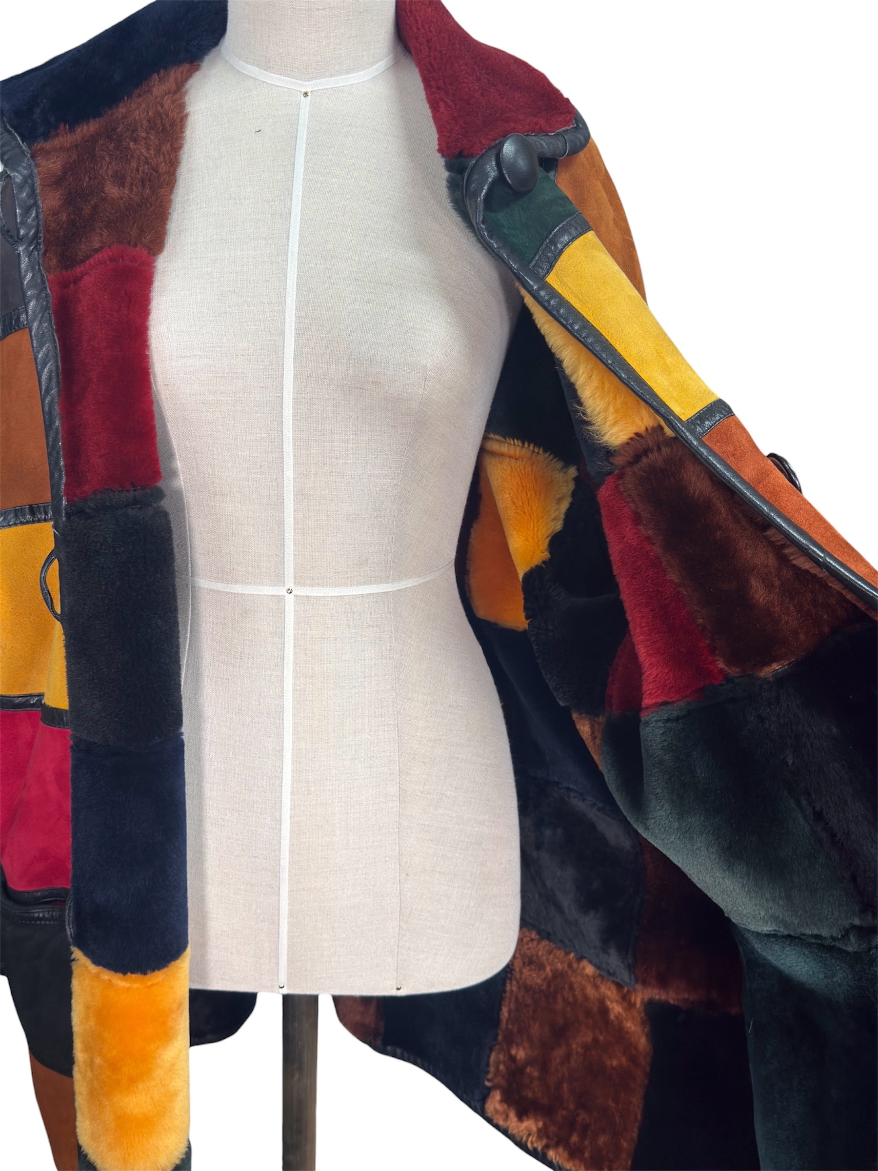 1980s Donna Karan New York Neiman Marcus suede coat featuring a multicolor patchwork exterior, plush shearling-style collar, and oversized round button front closure. Color blocked panels with contrast piping and an interior lined in coordinating faux-fur patchwork. Pockets on the side of either hip in the front. There is slight condition issues with this piece, pictured in the last photos. There is some color fading on the front of the left shoulder and a small rectangular dark mark on the coat. In otherwise good condition.