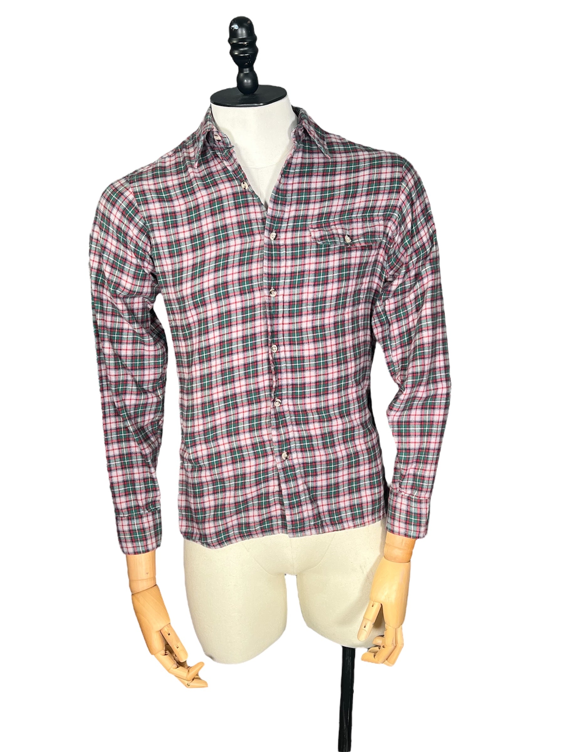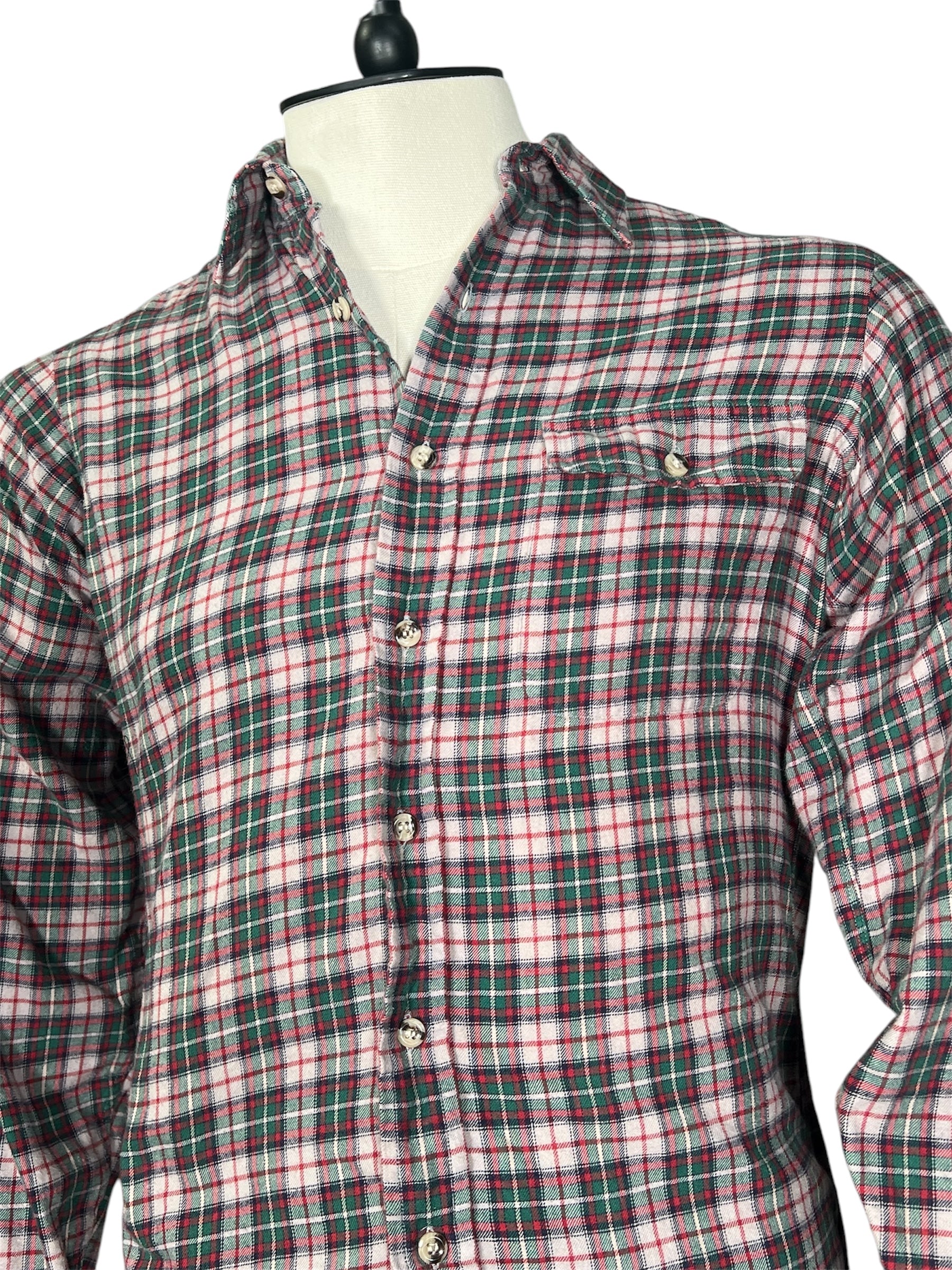 1980s Savile Row long-sleeve, flannel shirt. This plaid shirt is a combination of green, red, and white colors. It features buttons from the collar down the front and a front pocket secured with a button.