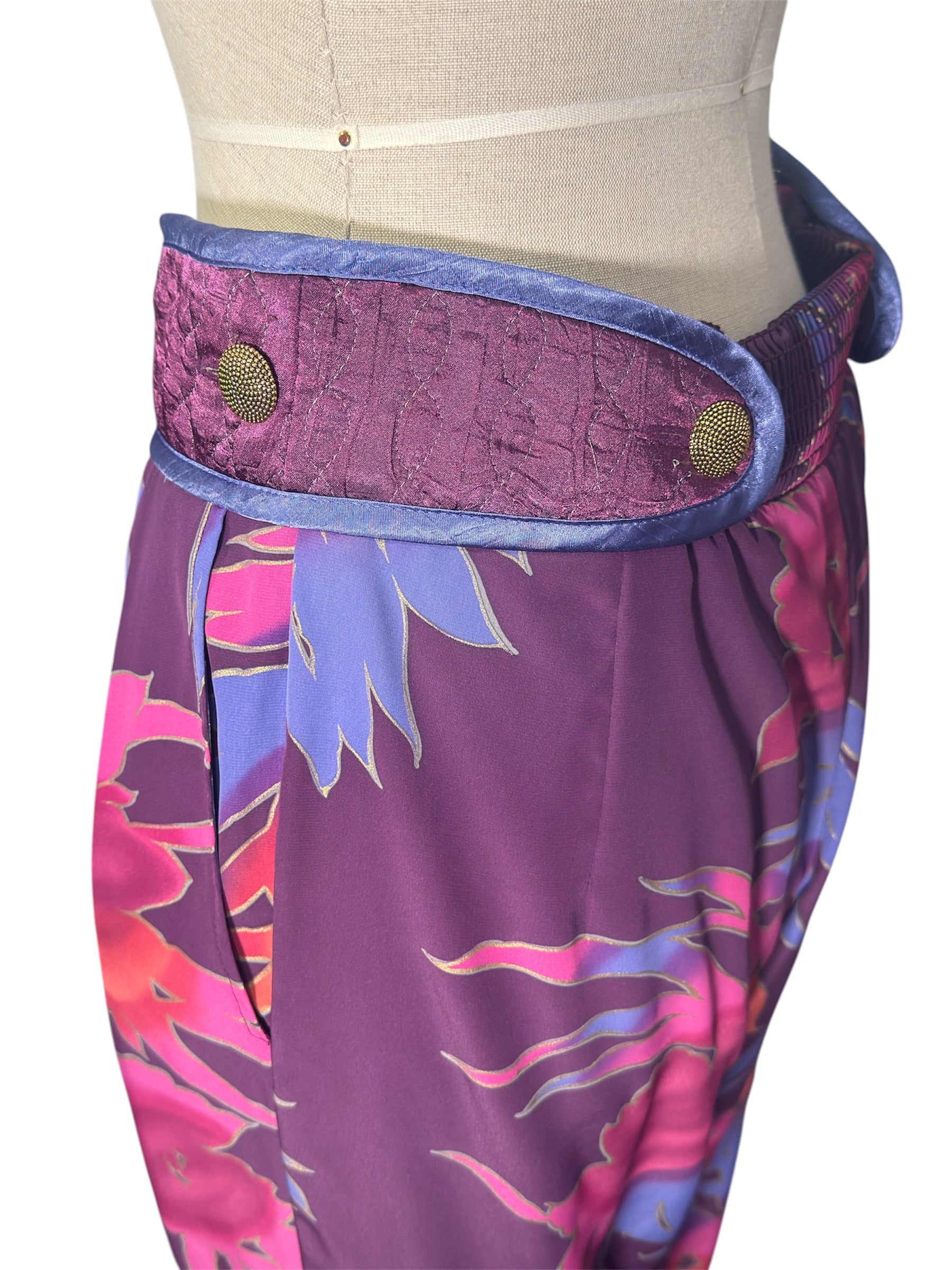 1980s Jeanne Marc pants. These purple, pink, and blue pants have a wide, quilted waistband that mimics a belt. It attaches at the side with two gold buttons, along with hidden plastic buttons inside the waistband. The pants balloon out at the hips and taper down at the ankle. There are pockets on the side of either hip. They are made in the USA and marked a size small, but please refer to the measurements as sizing changes based on the decade. These would be perfect for a New Wave look.