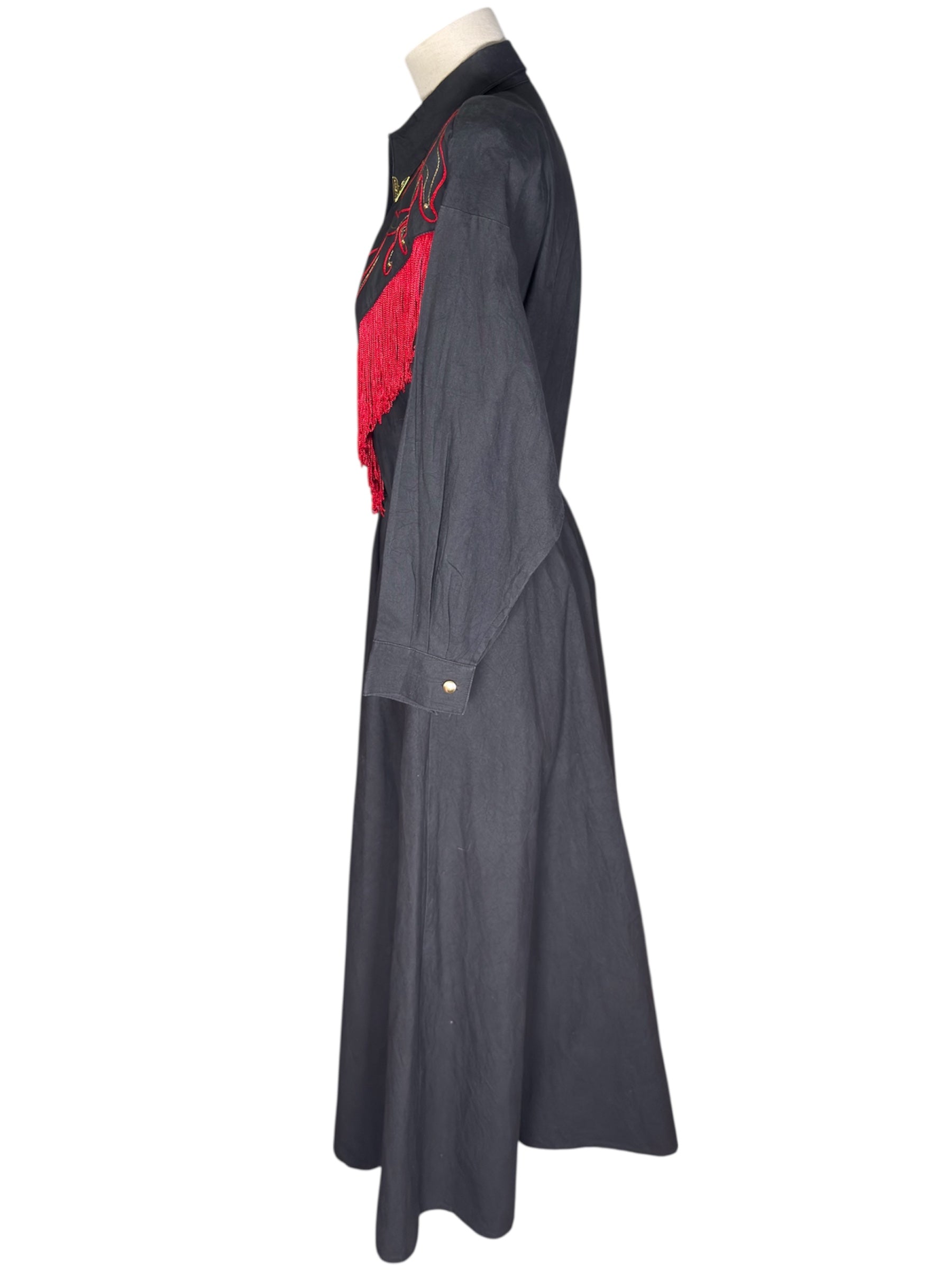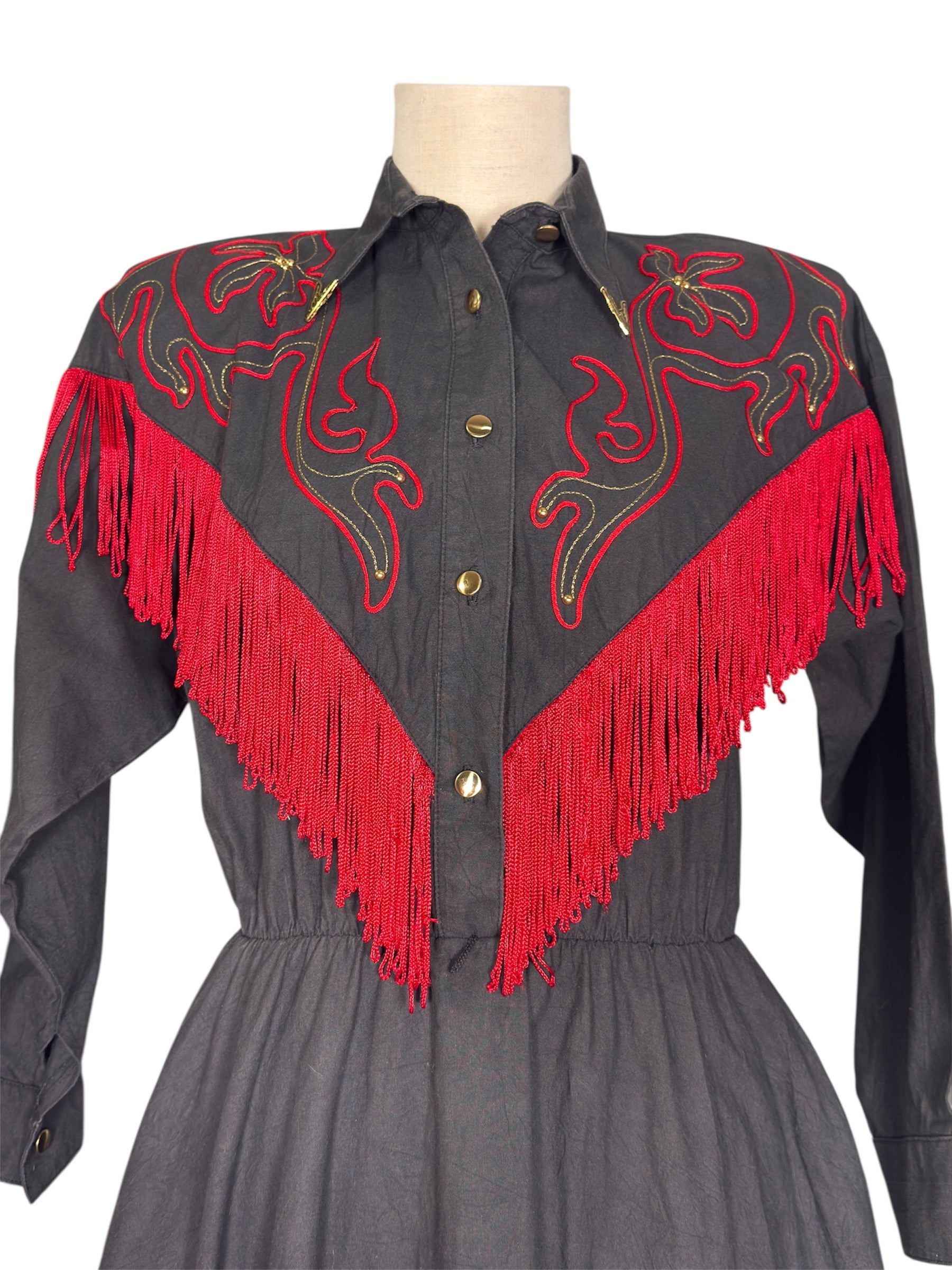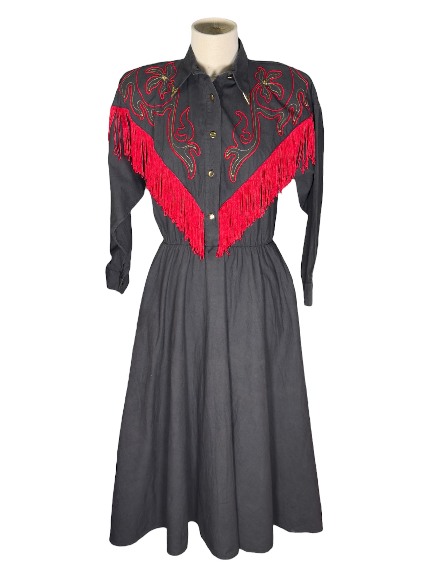 1980s Lilia Smitty dress. This western/rodeo dress features metal tips on the collar, a red and gold design across the chest, and red fringe under the chest. It has long sleeves, a mid-length skirt, pockets on the front of either hip, and shoulder pads. The material is 100% cotton. It is marked a size 11/12, but please refer to the measurements. There were no visible flaws with this piece.