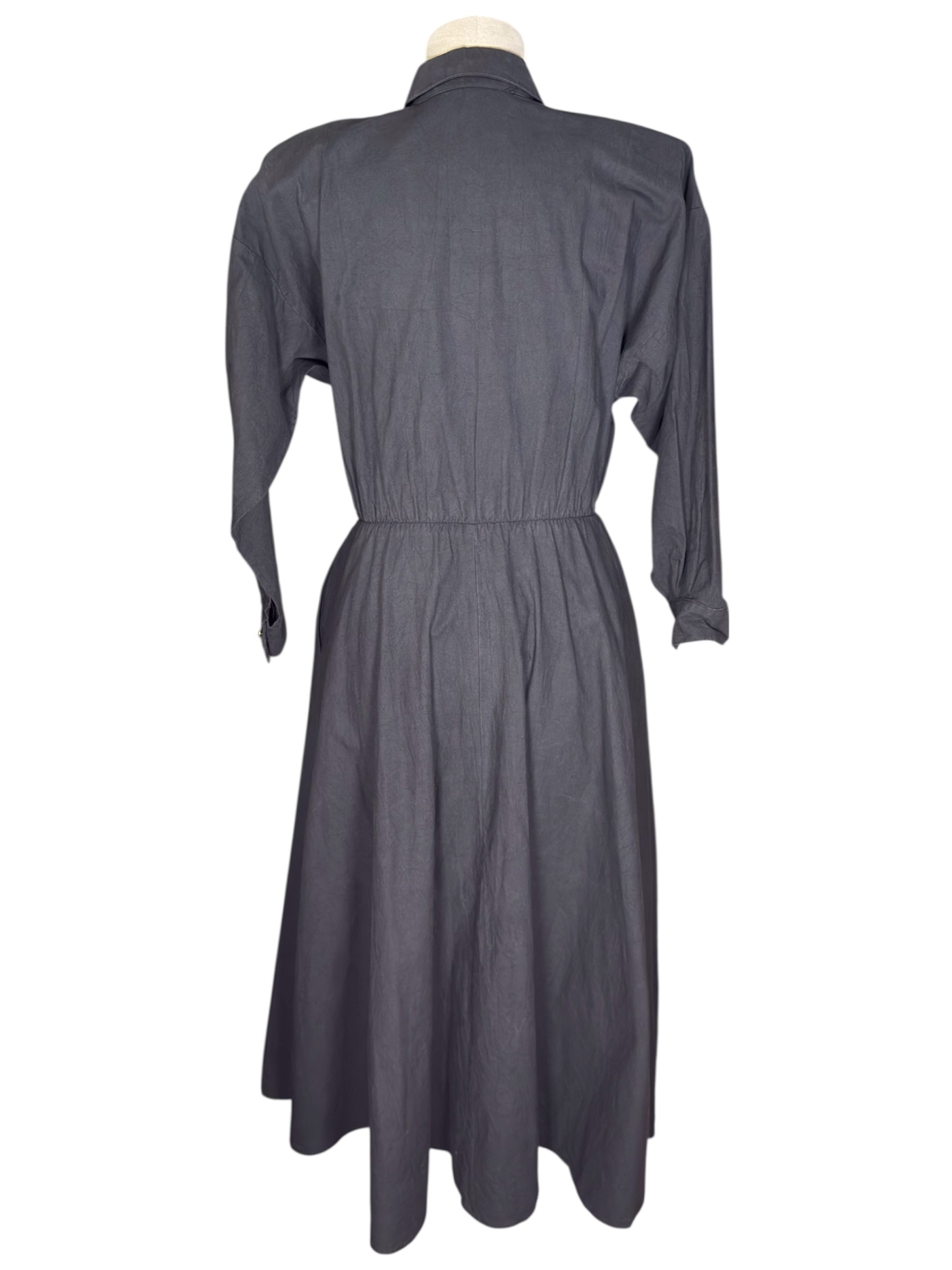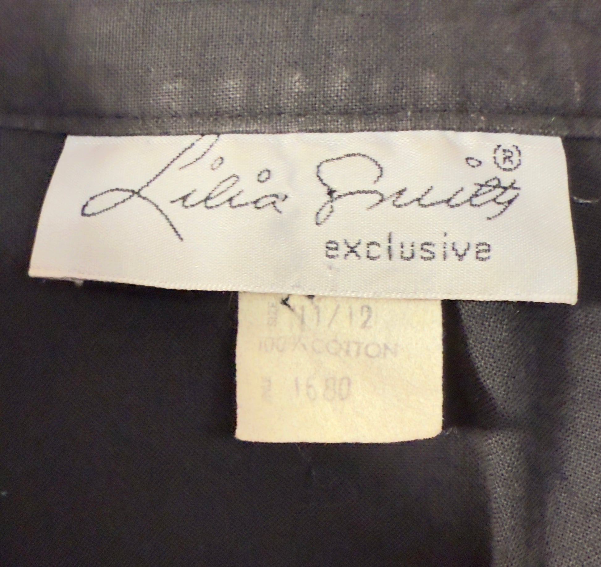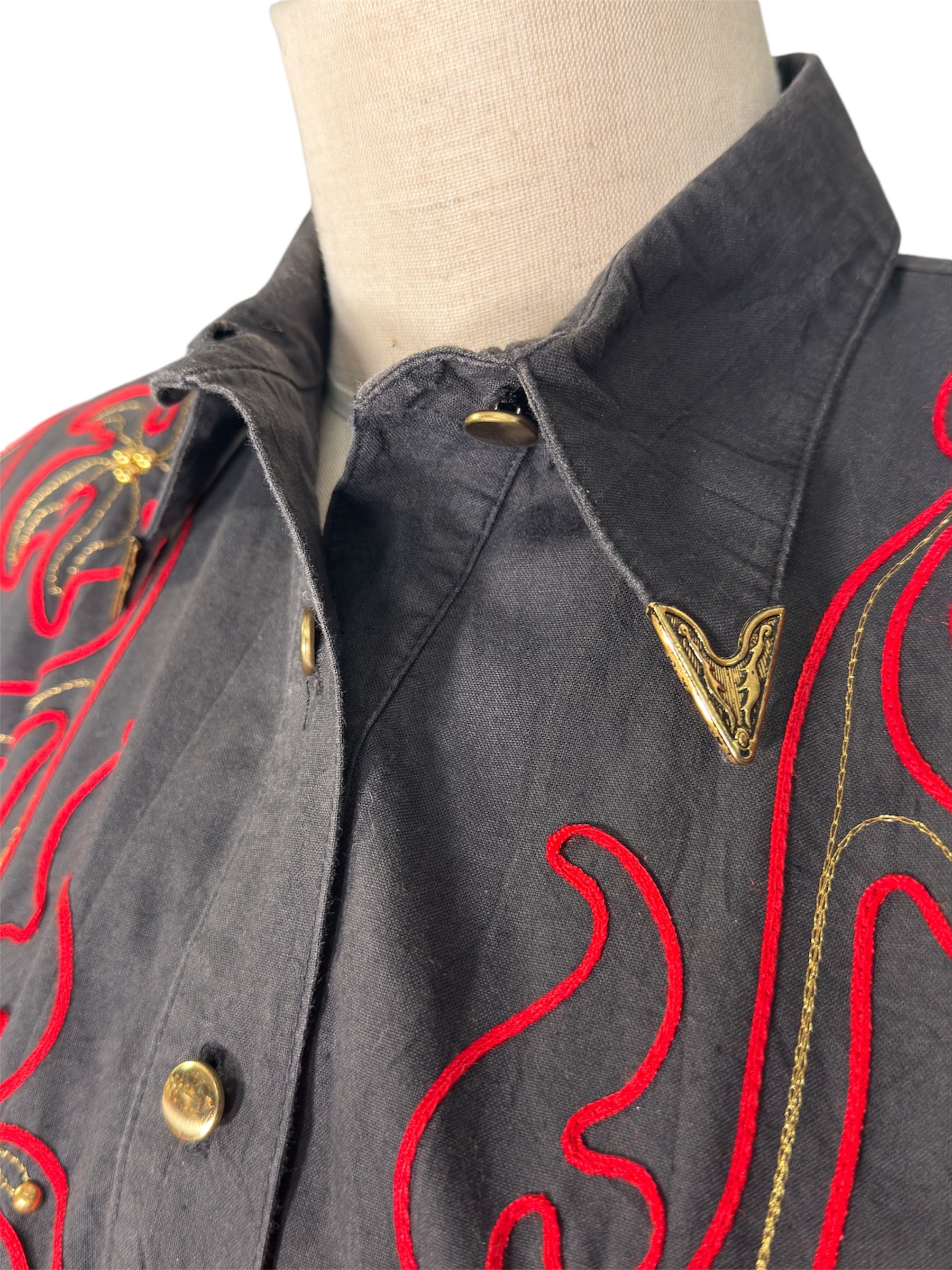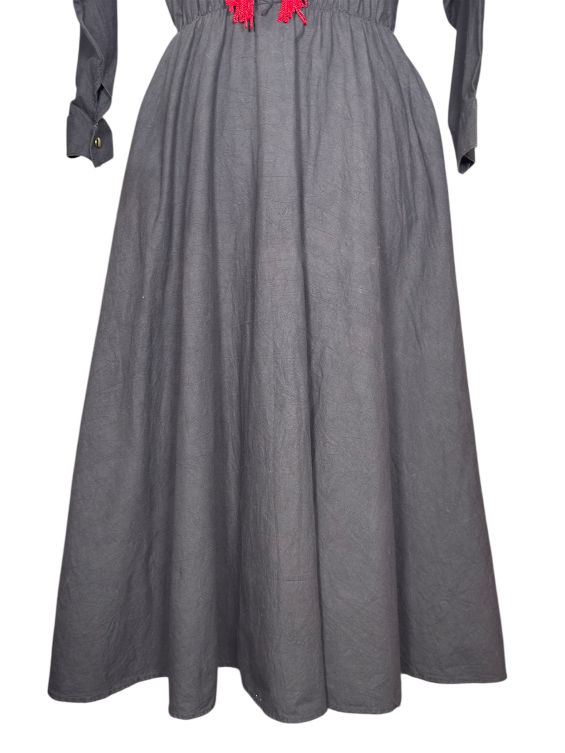 1980s Lilia Smitty dress. This western/rodeo dress features metal tips on the collar, a red and gold design across the chest, and red fringe under the chest. It has long sleeves, a mid-length skirt, pockets on the front of either hip, and shoulder pads. The material is 100% cotton. It is marked a size 11/12, but please refer to the measurements. There were no visible flaws with this piece.