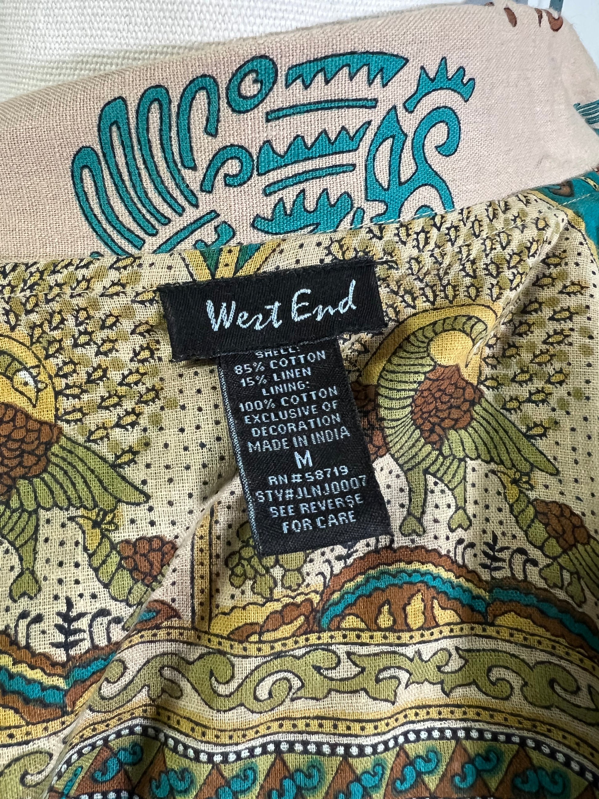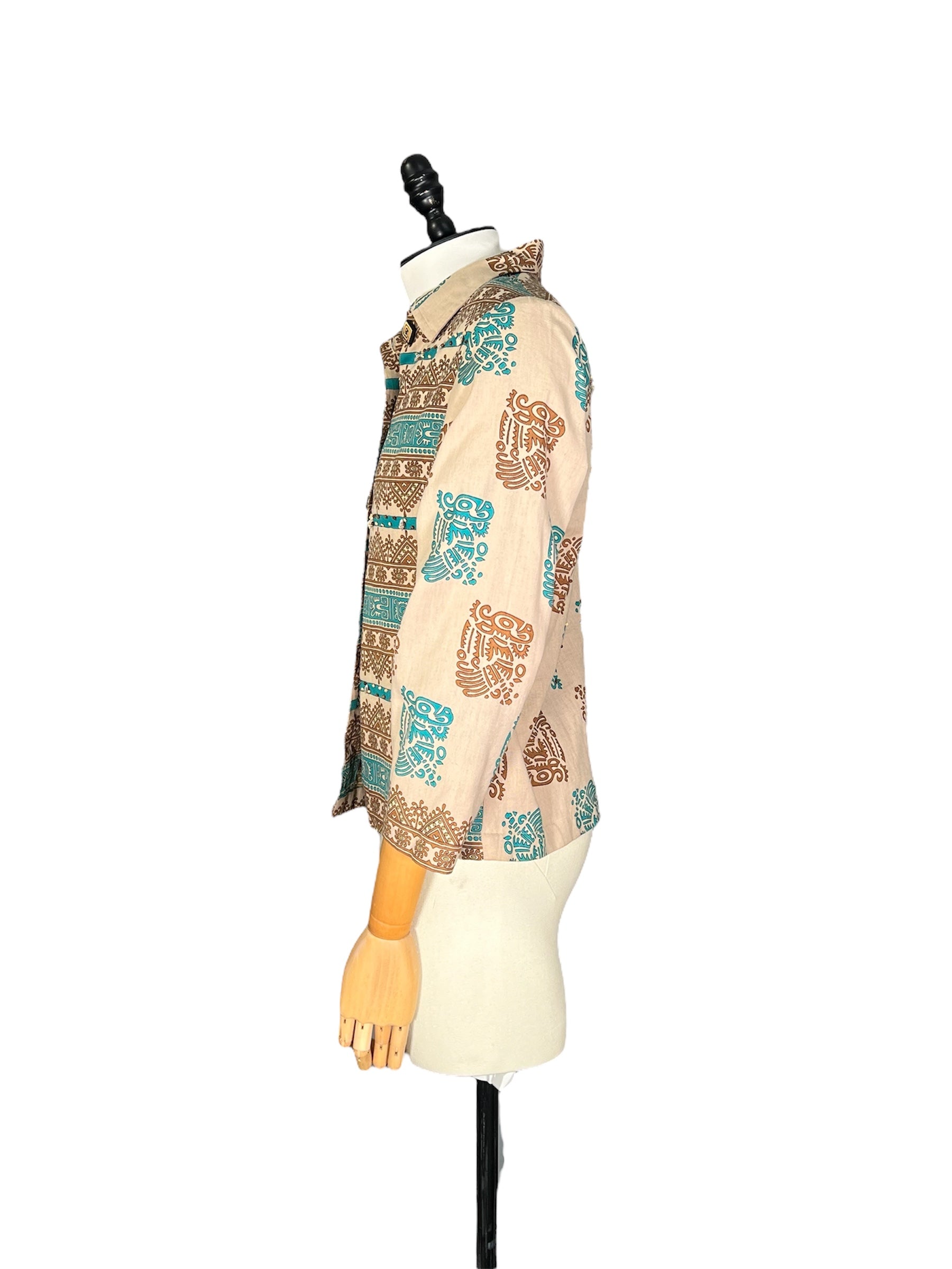 1980s patterned shirt. This beachy shirt features large, abstract buttons and sewn on seashells. It is a combination of turquoise, dark brown, and tan and is made from cotton and linen. The shape of this 3/4 sleeve shirt is accentuated by shoulder pads.