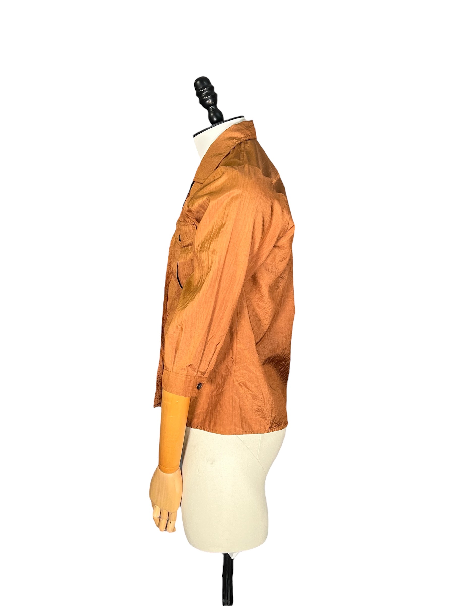 1980s Summerfield 3/4 sleeve shirt. This burnt orange shirt features a v-neck and two pockets on either breast. The material is 100% polyester and it is made in Sri Lanka. It is labeled a size 8 but please refer to measurements as sizing changes depending on the decade.