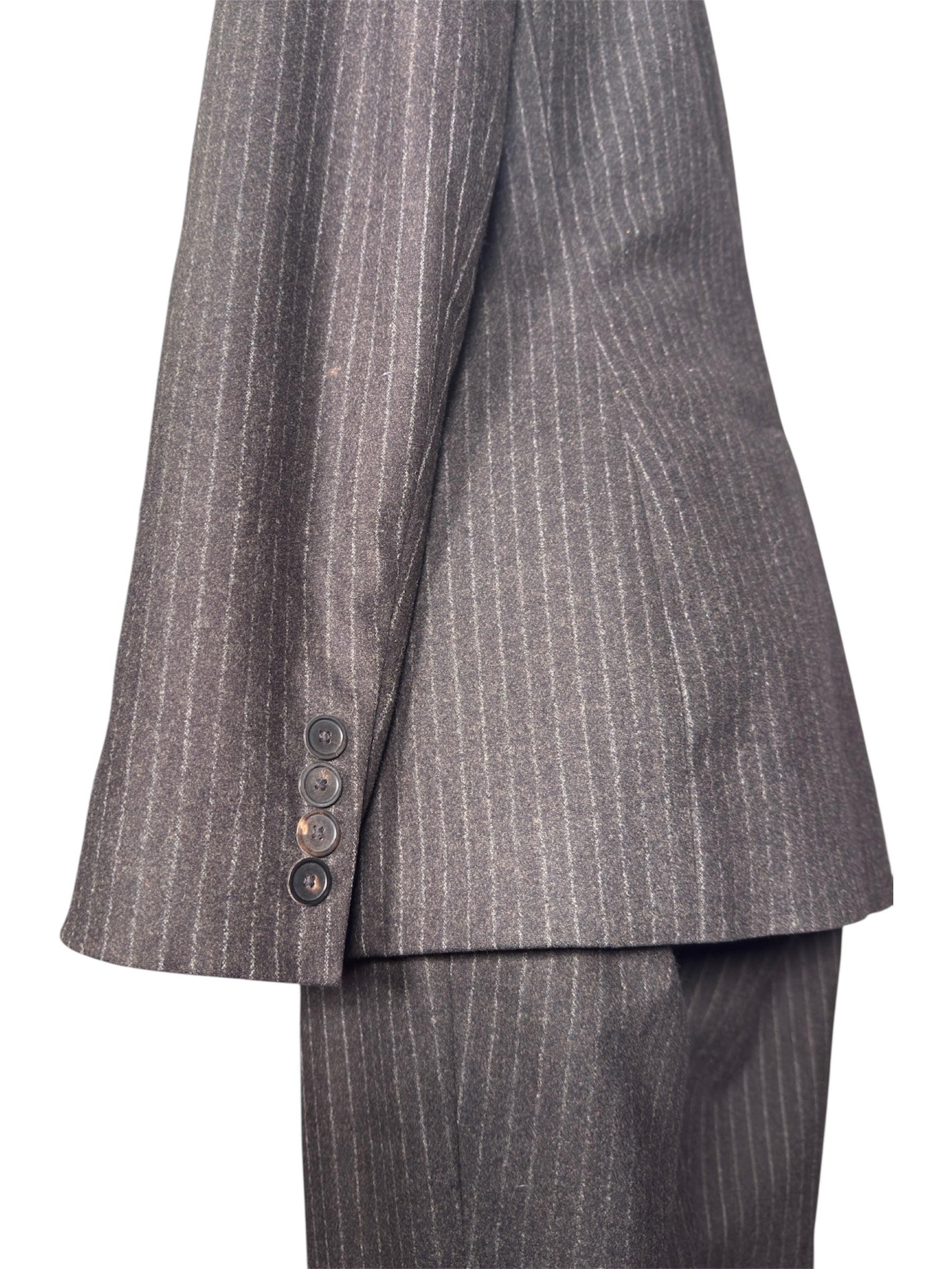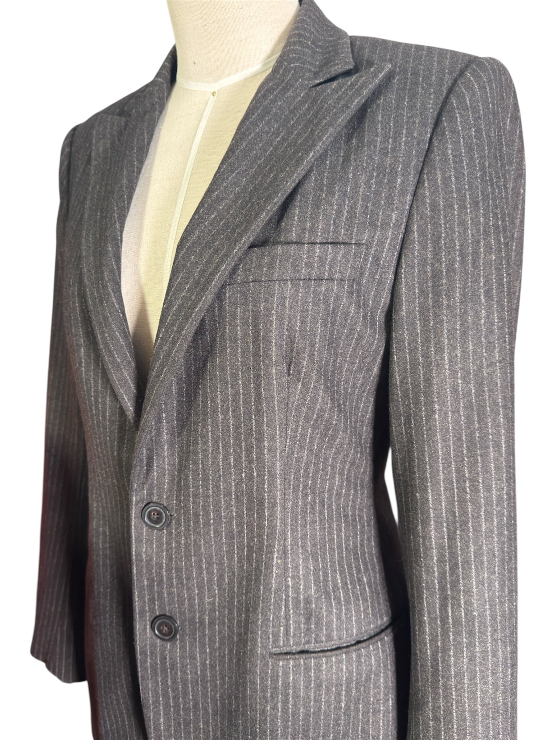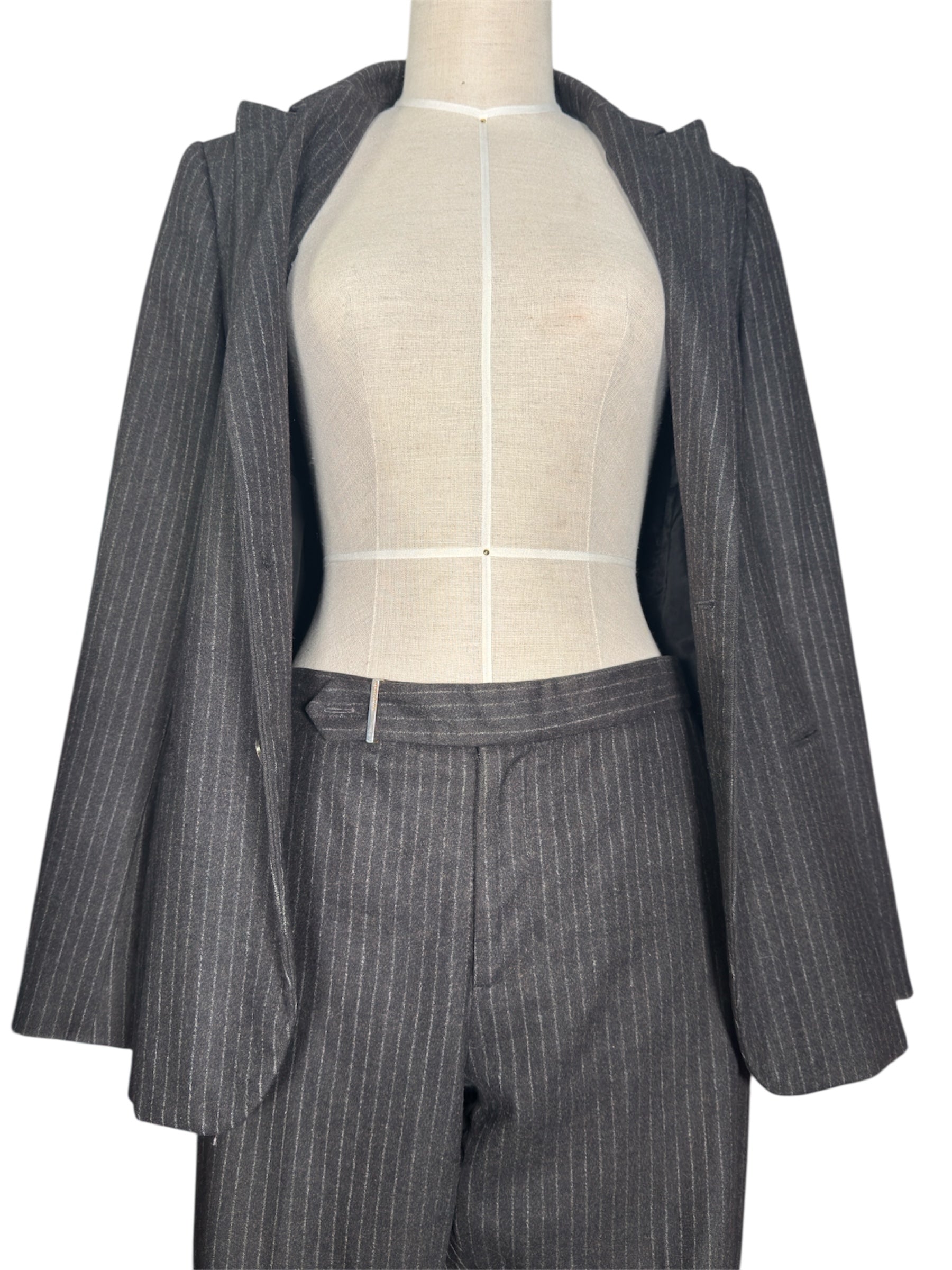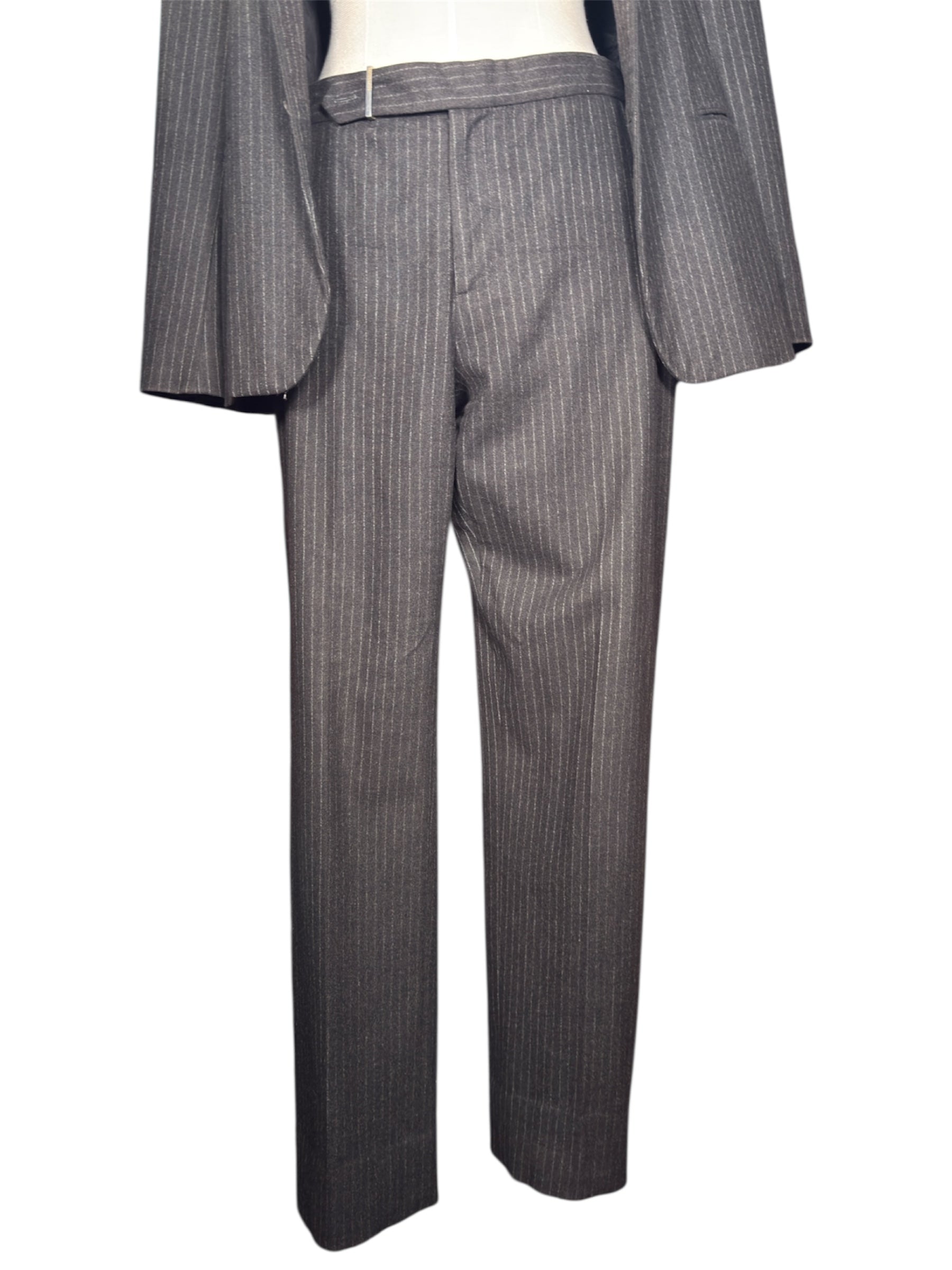 1990s Ralph Lauren 2-piece suit set. This beautiful women's suit consists of a black and white, pin-striped, jacket and pants. On the jacket, there are pockets on the sides of either hip and on the left side of the chest. The pants have one back pocket on right side. The jacket is attached with two plastic buttons right below the chest and at the waist. The pants attach with a metal zipper, a metal latch, and a faux belt. This set is made in the U.S.A. and is 96% wool, 3% nylon, and 1% elastane. Both the jacket and the pants are marked a size 6, but please refer to the measurements as sizing changes based on the decade. There are no visible condition issues with this piece.