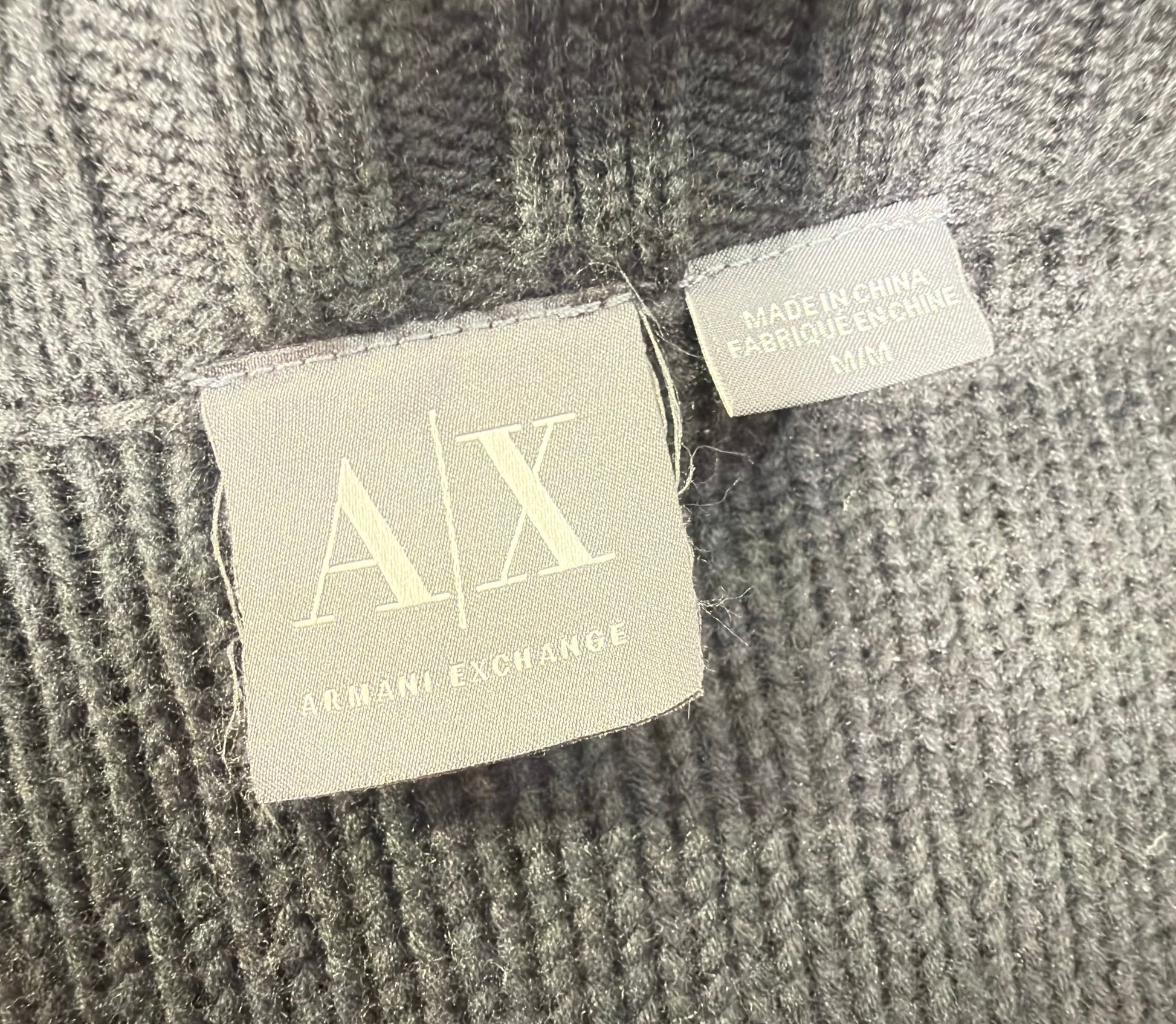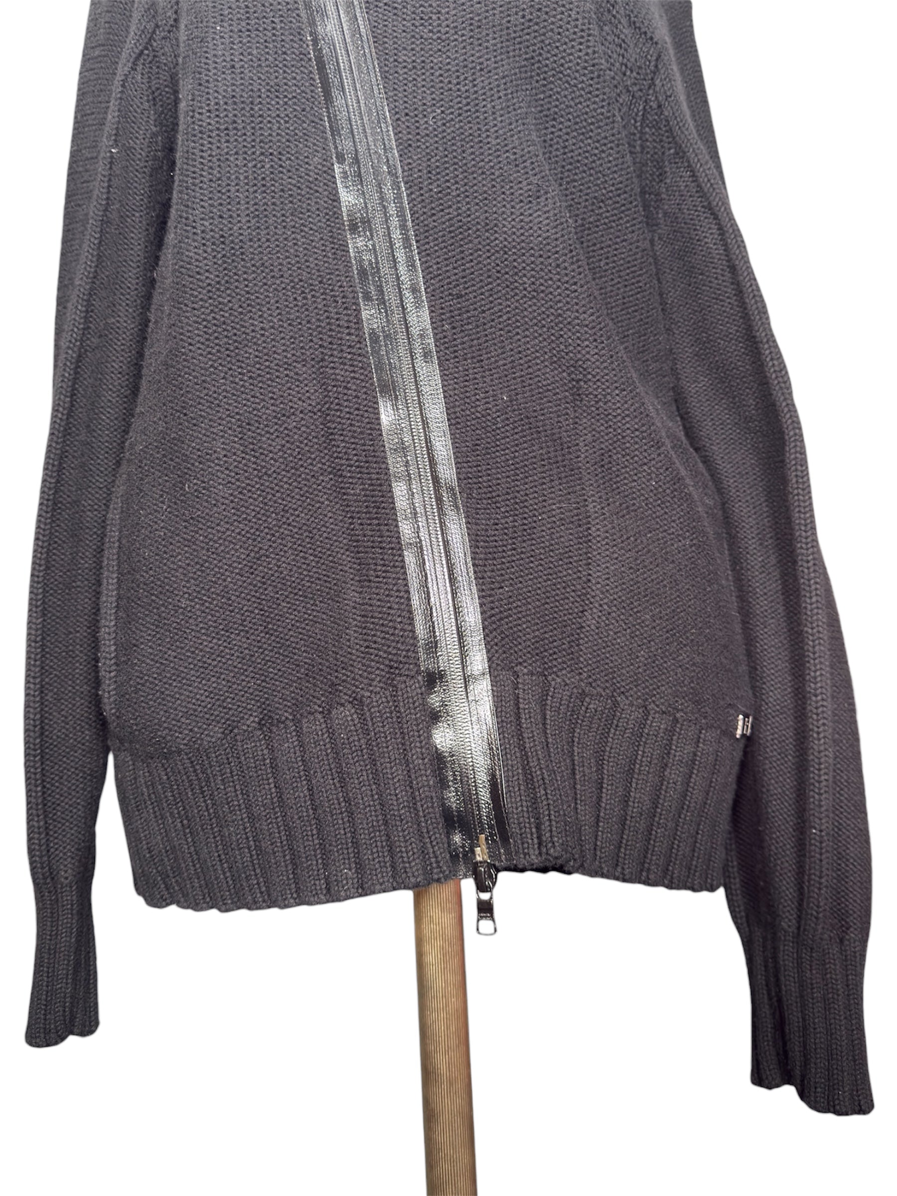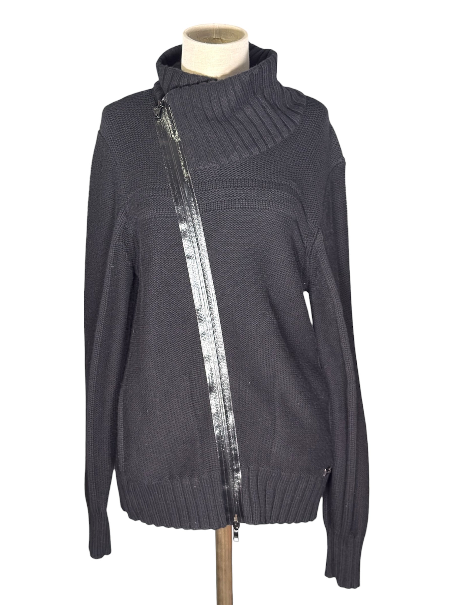 Modern Armani Exchange knit sweater featuring an eye-catching diagonal metallic zipper closure and a ribbed, oversized funnel neckline. The textured black knit gives it a contemporary edge while the distinctive hardware adds bold visual interest. Made in China. The material is 55% cotton and 45% nylon. Shows little to no visible wear; appears in excellent condition. The jacket is marked a size M, but please refer to the measurements.