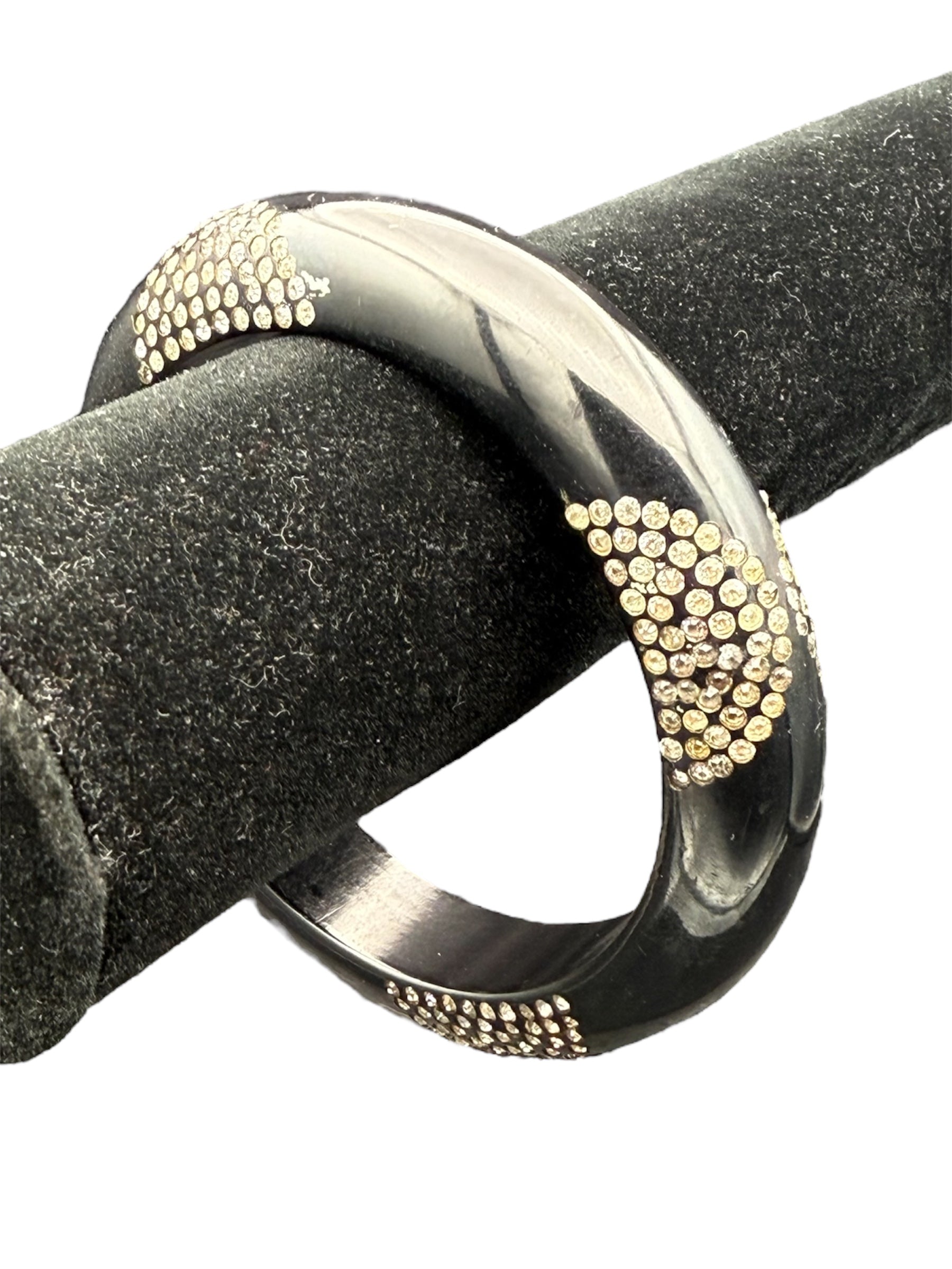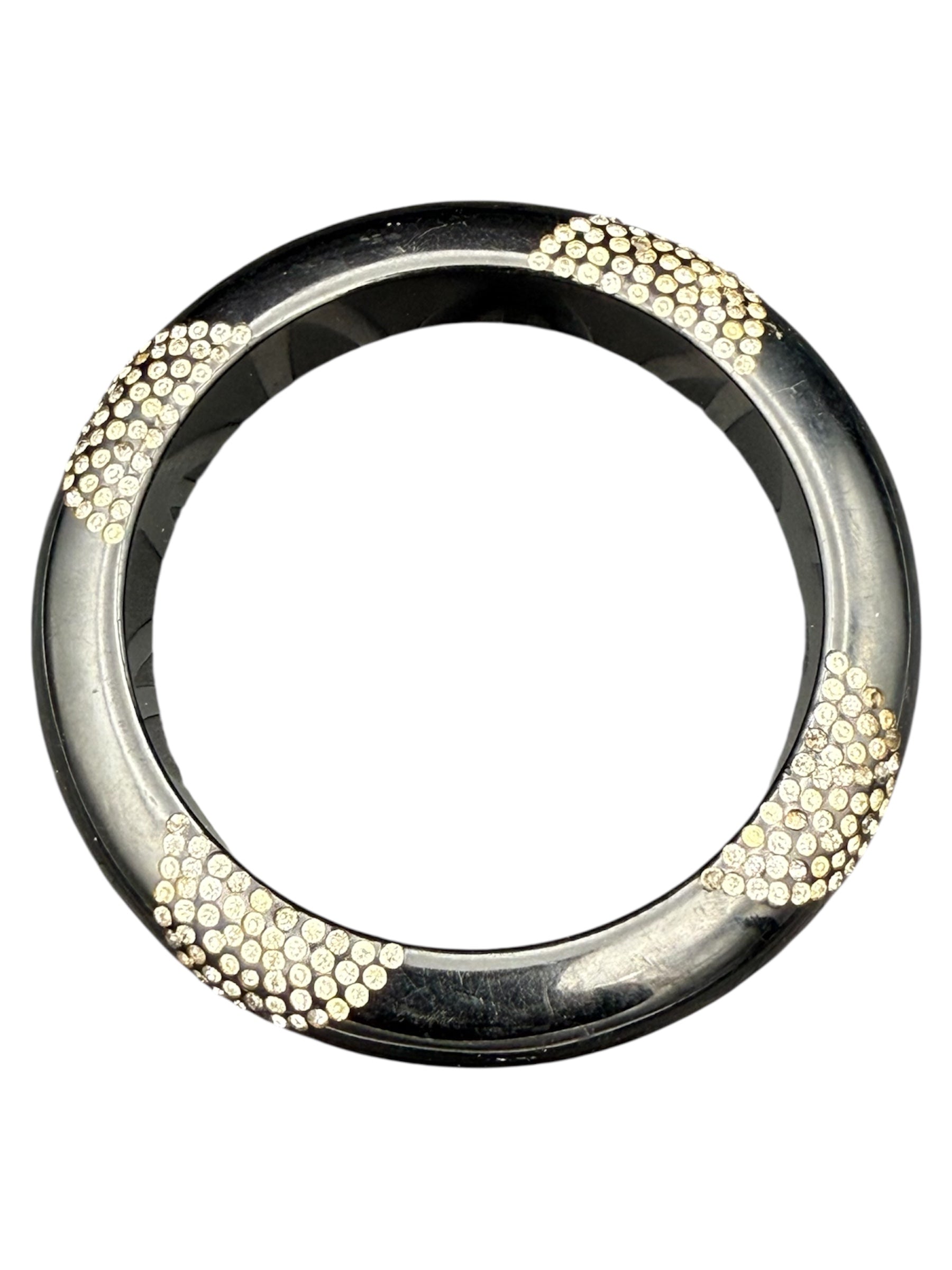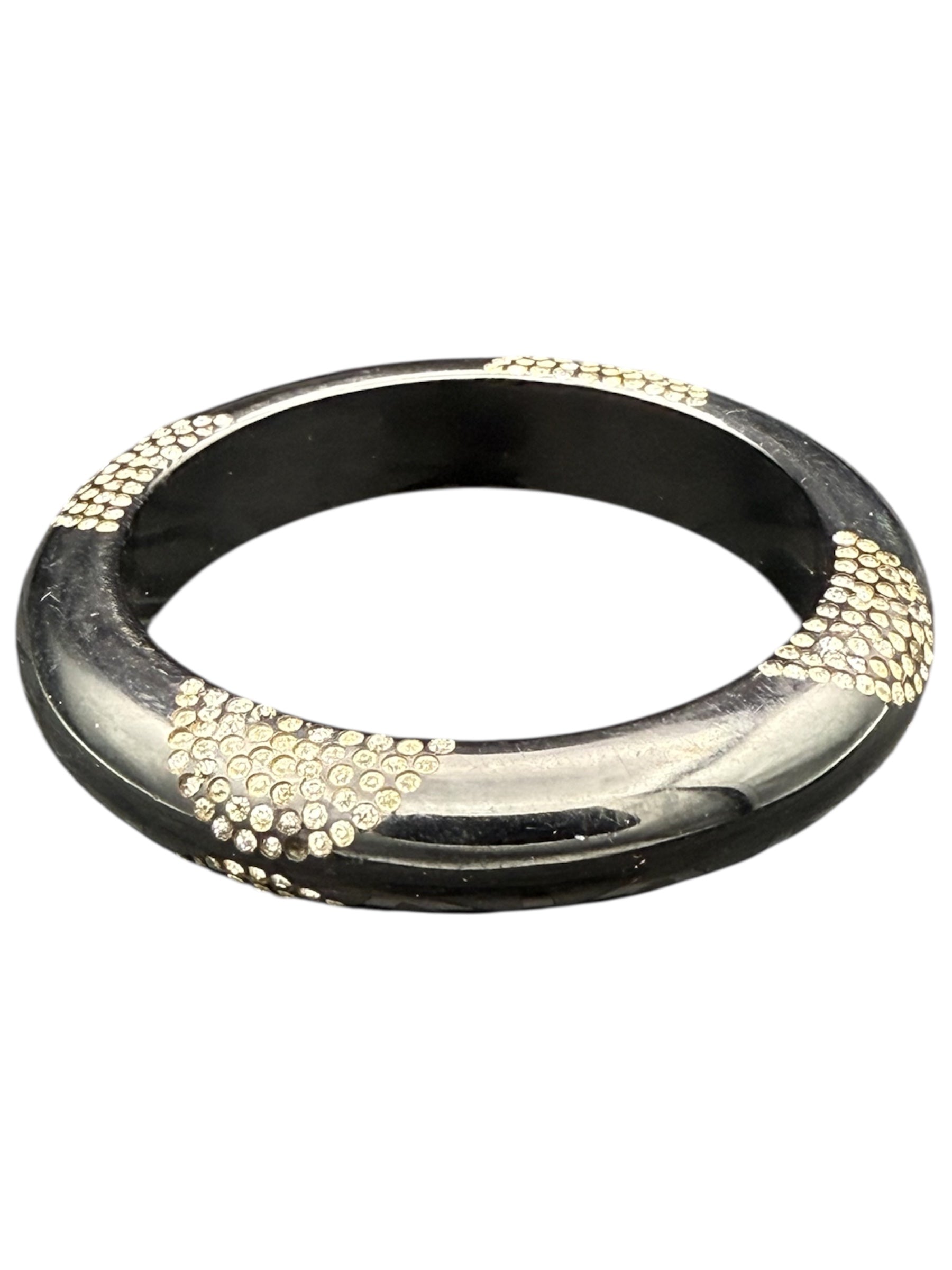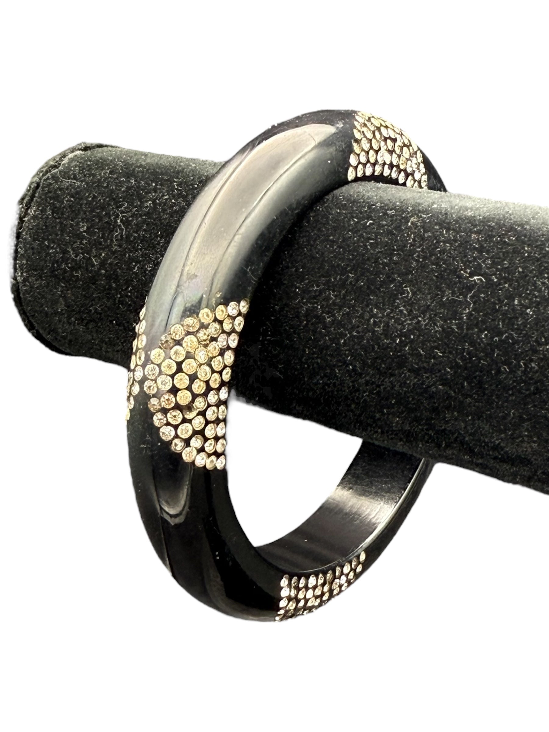 Vintage Bakelite bangle. This bangle features a black color with embedded rhinestones. This costume jewelry had no noticeable flaws.