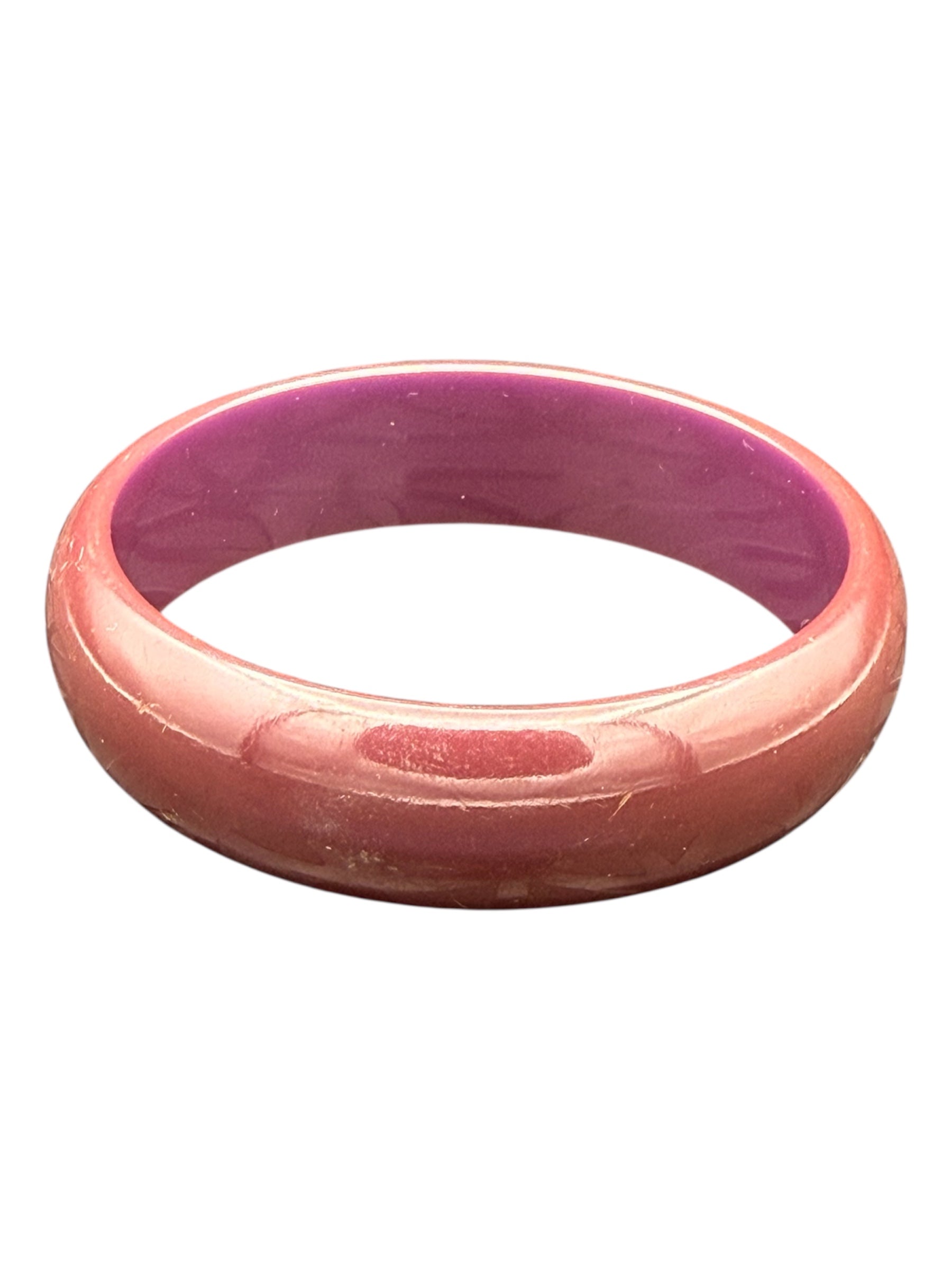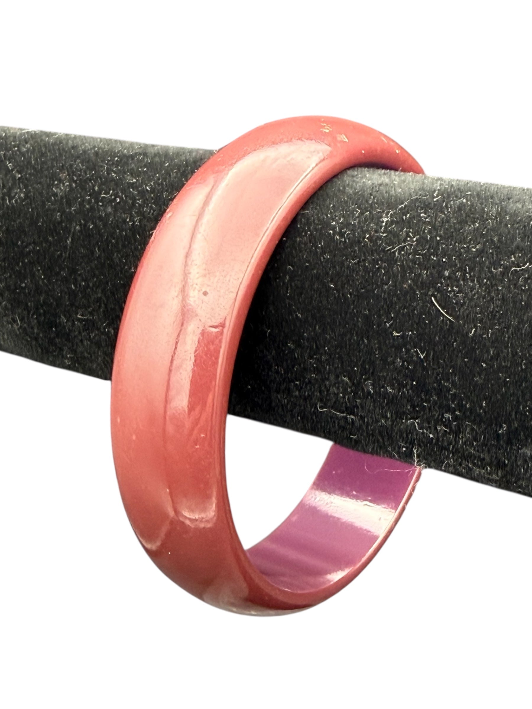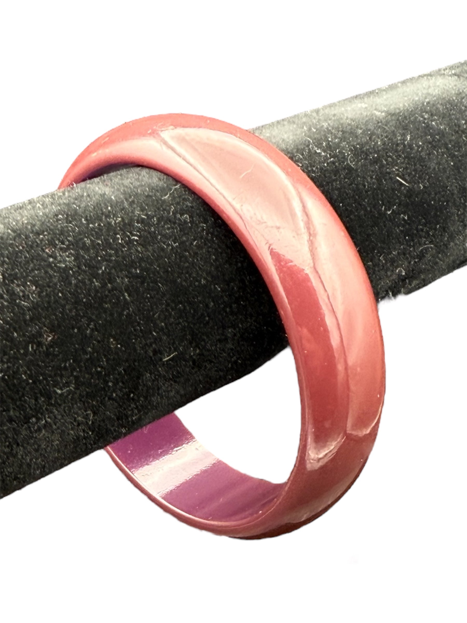 Vintage Bakelite bangle. This bangle is a deep red with a somewhat purple interior. There was no noticeable flaws with this piece.