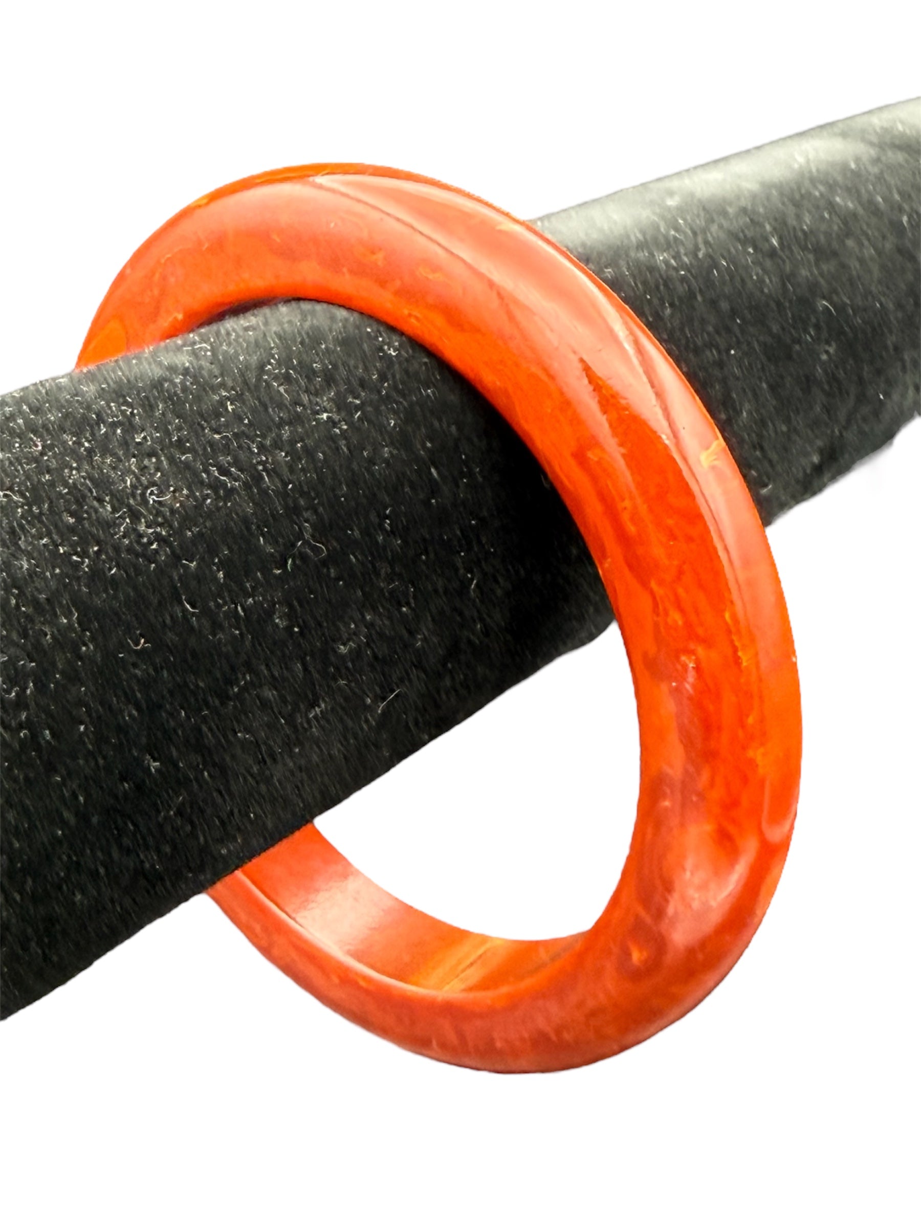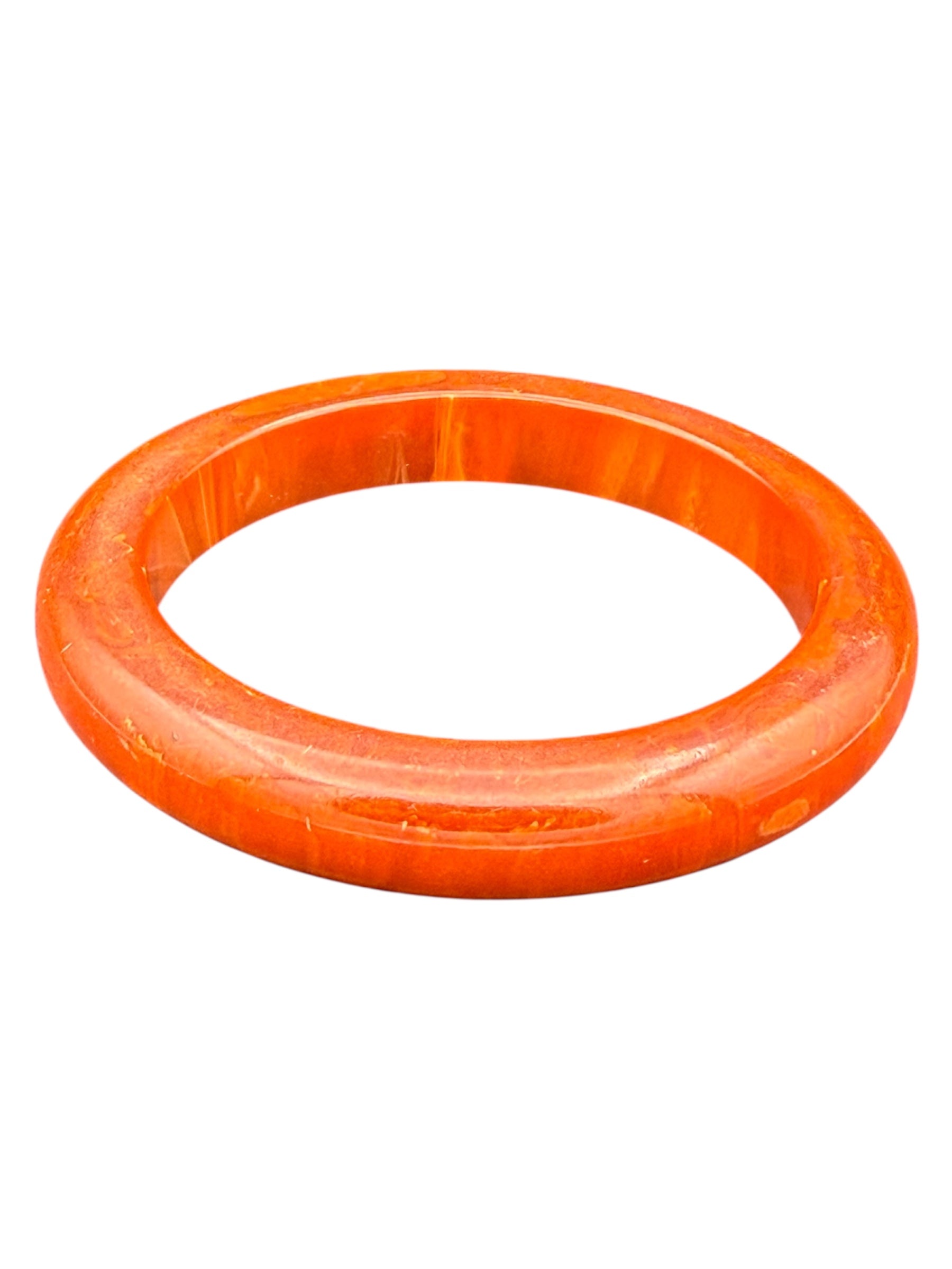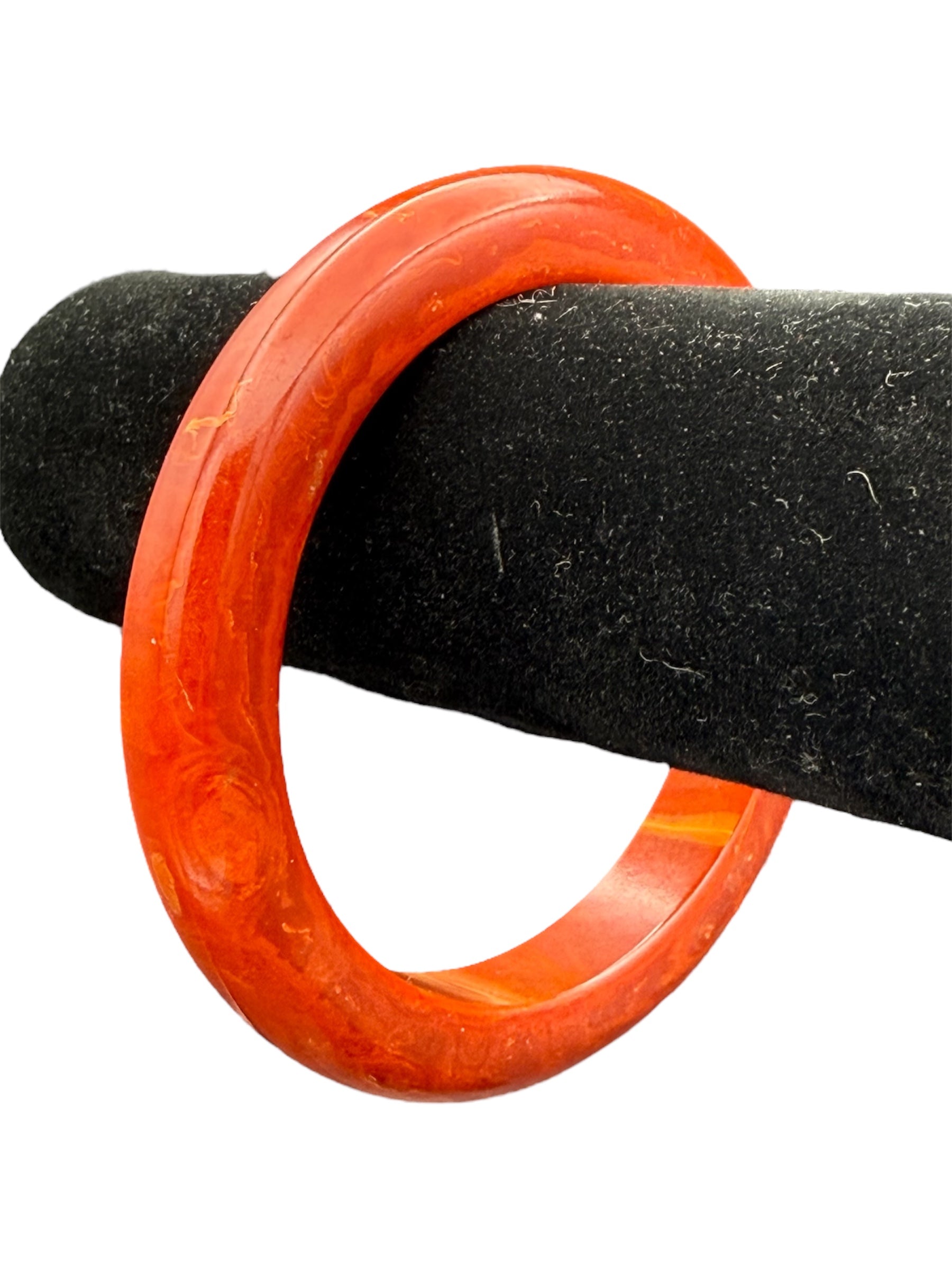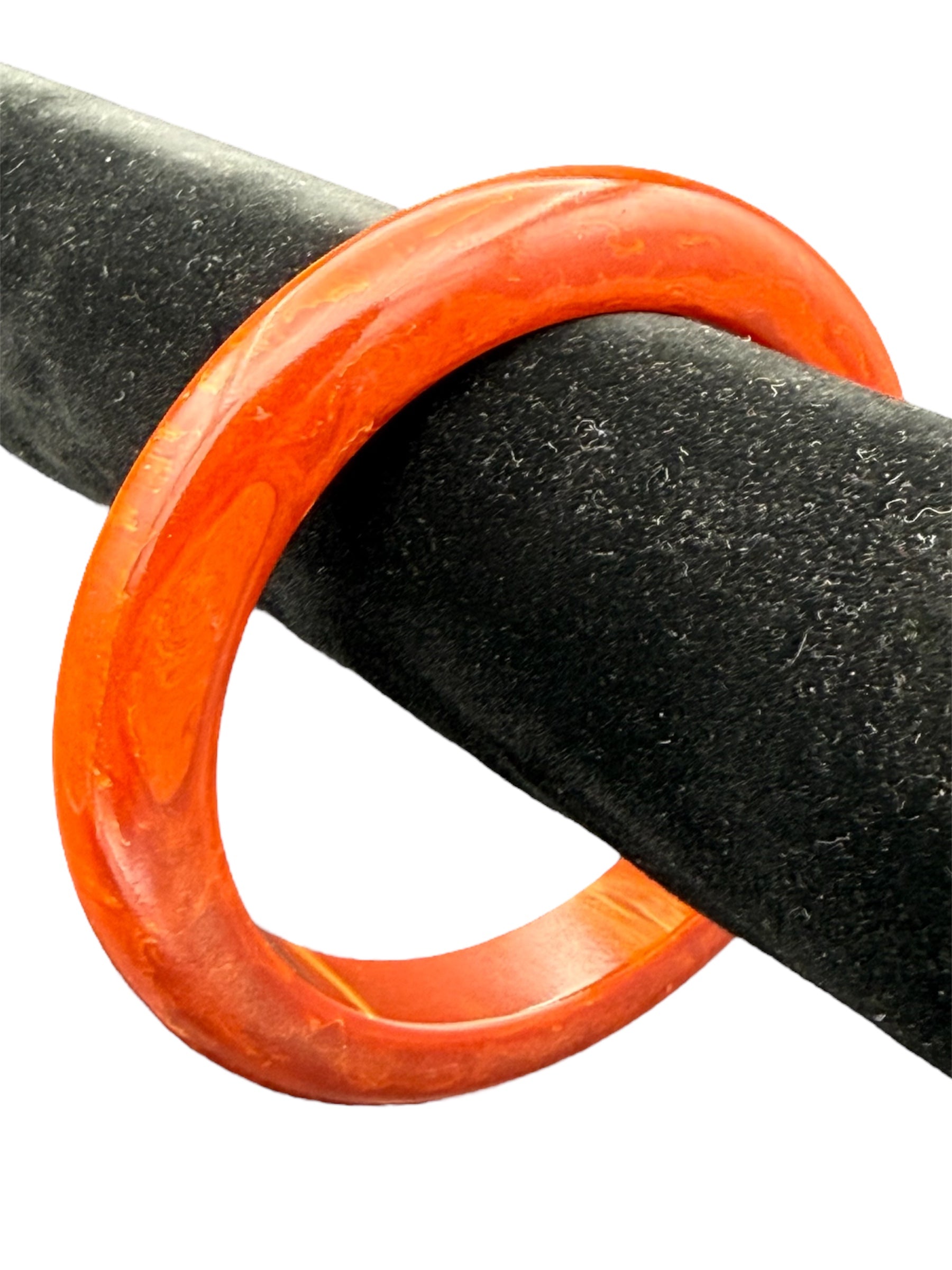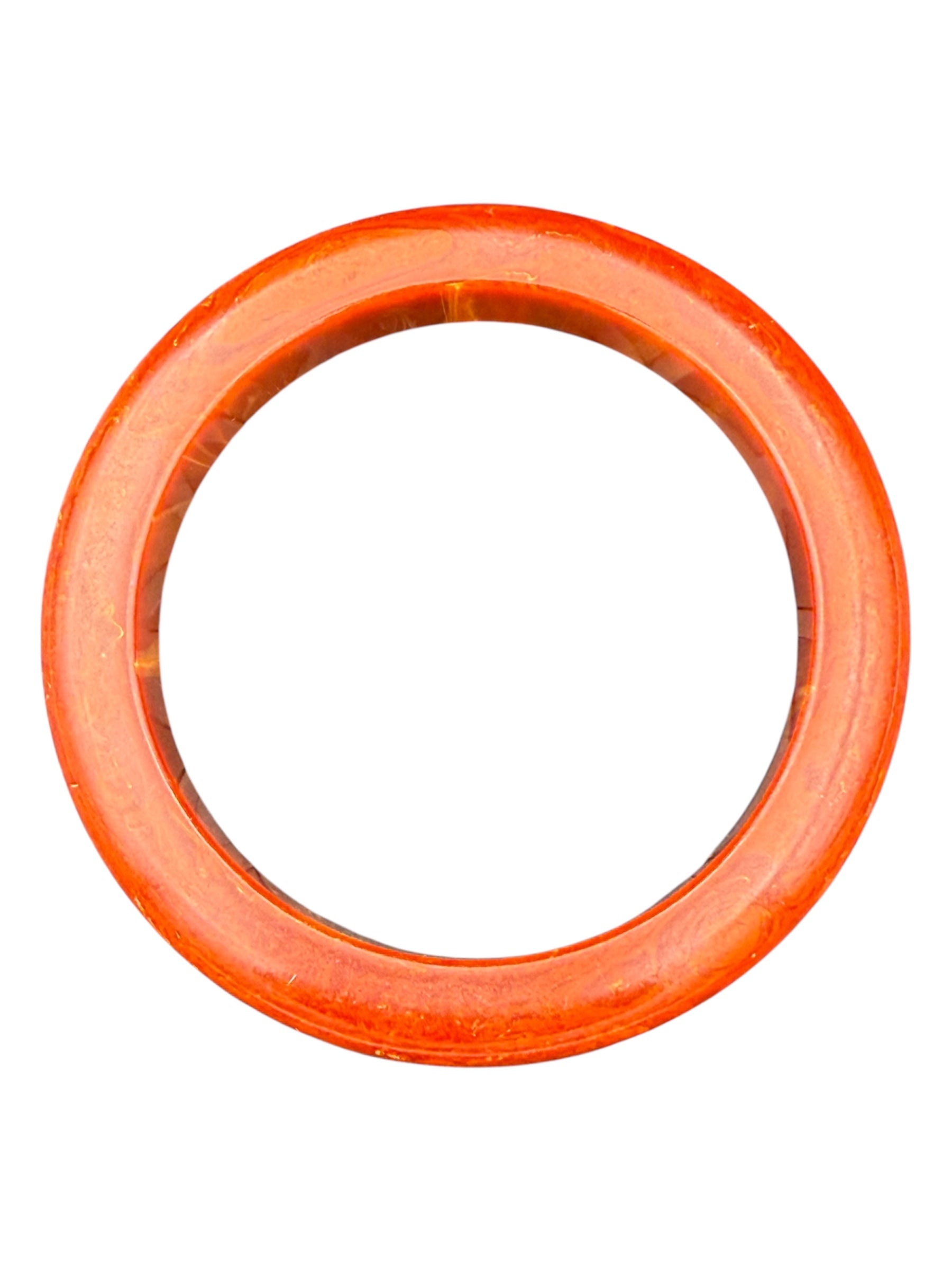 Vintage Bakelite bangle. This bangle features a swirled orange color. There was no noticeable flaws with this piece.