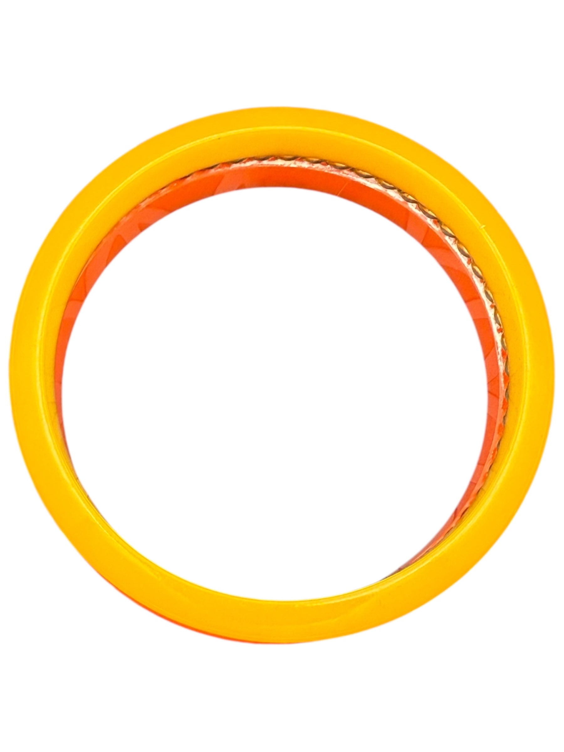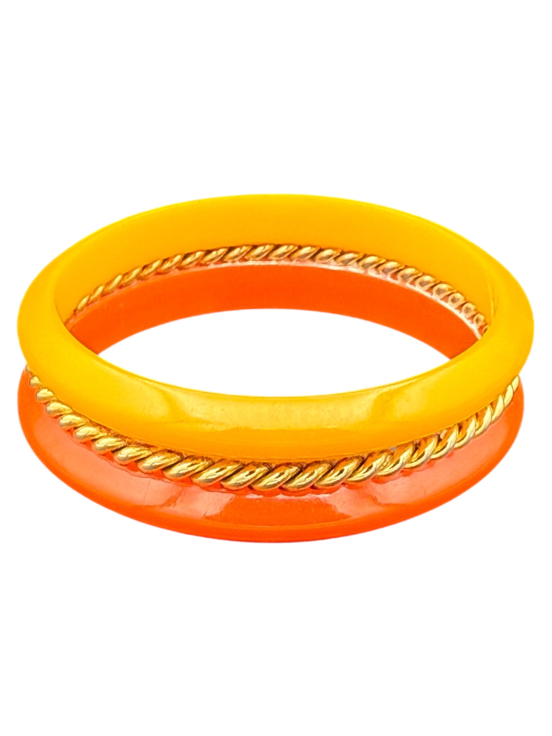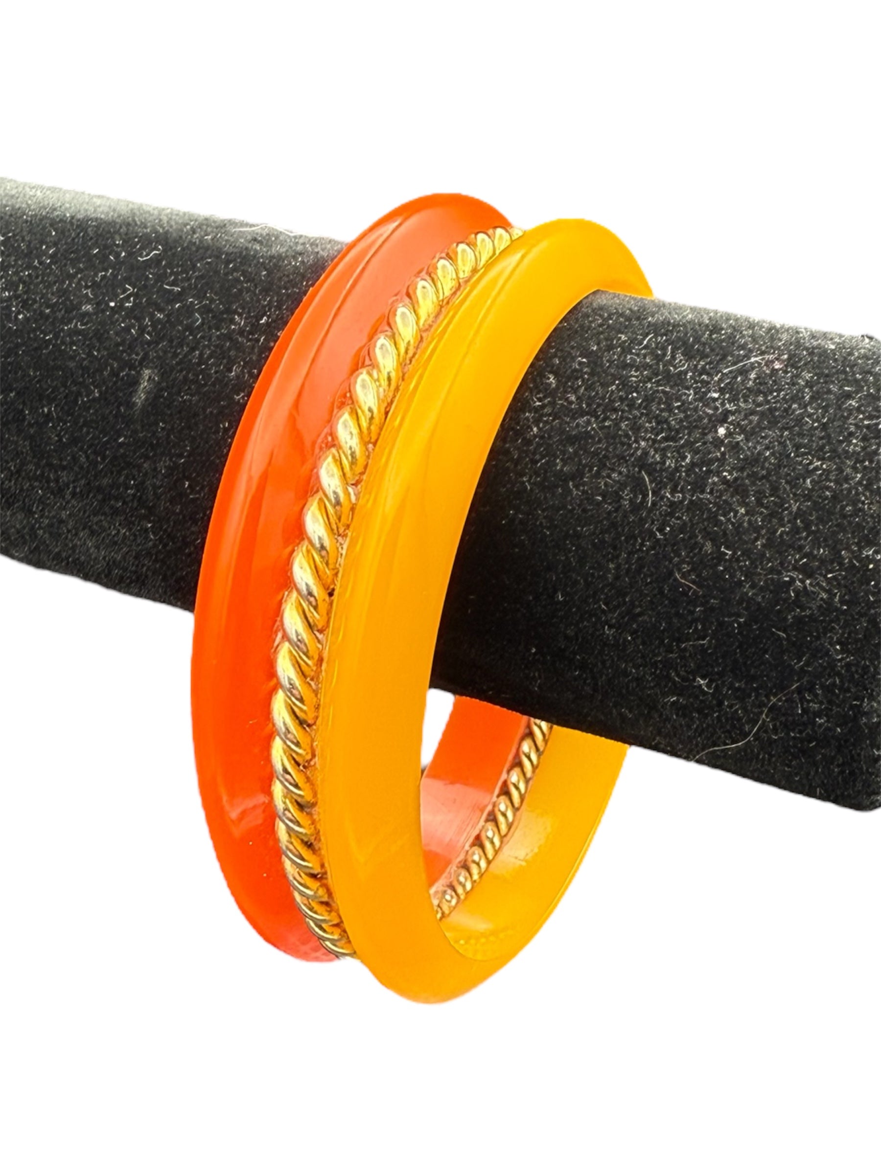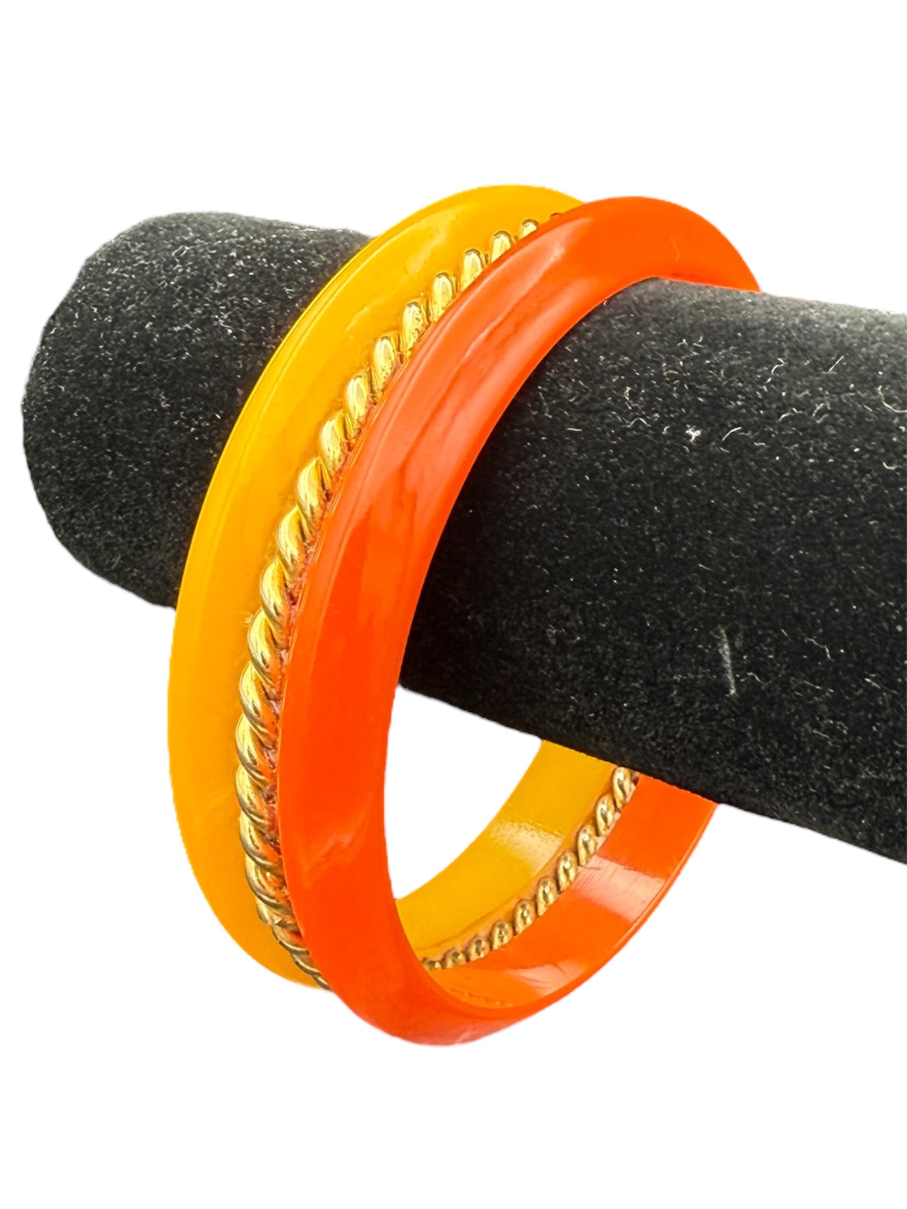 Vintage Bakelite bangle. This single bangle is yellow on one side and orange on the other, separated by a gold-colored, twisted band. There was no noticeable flaws with this piece.