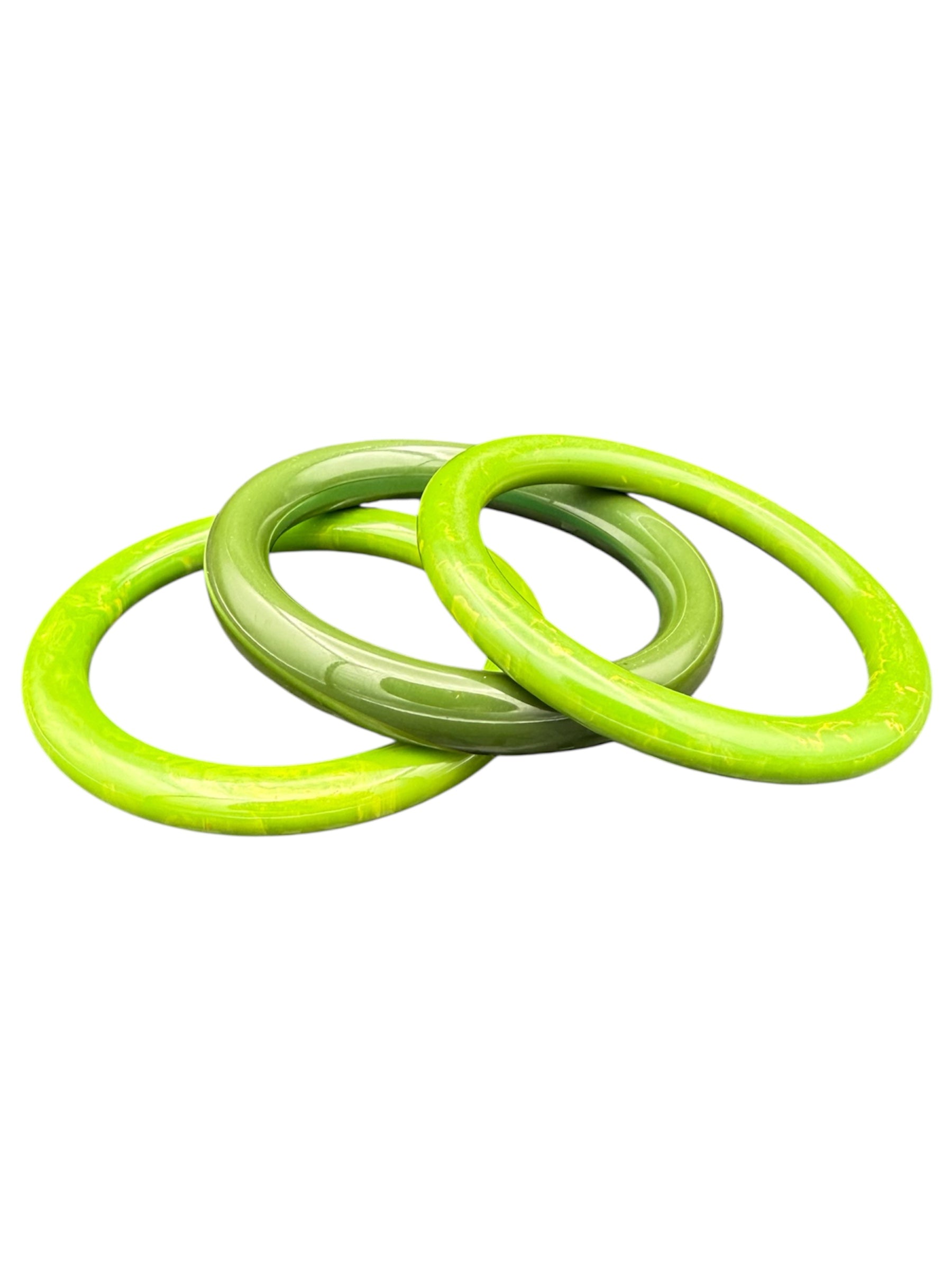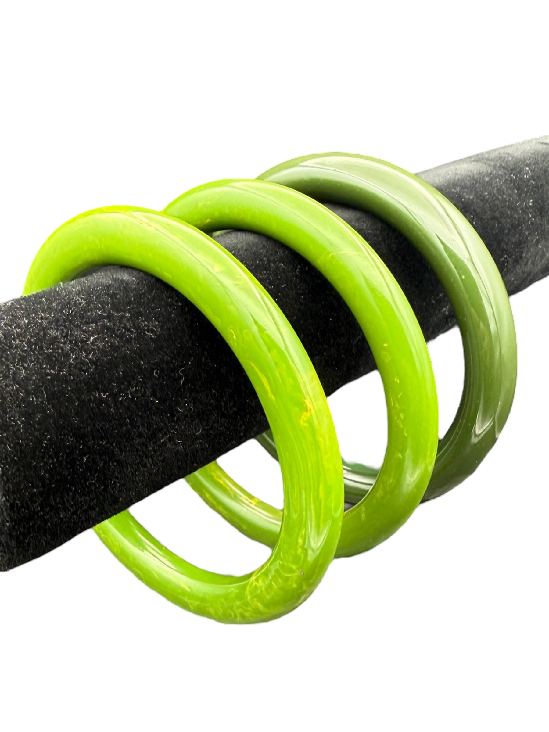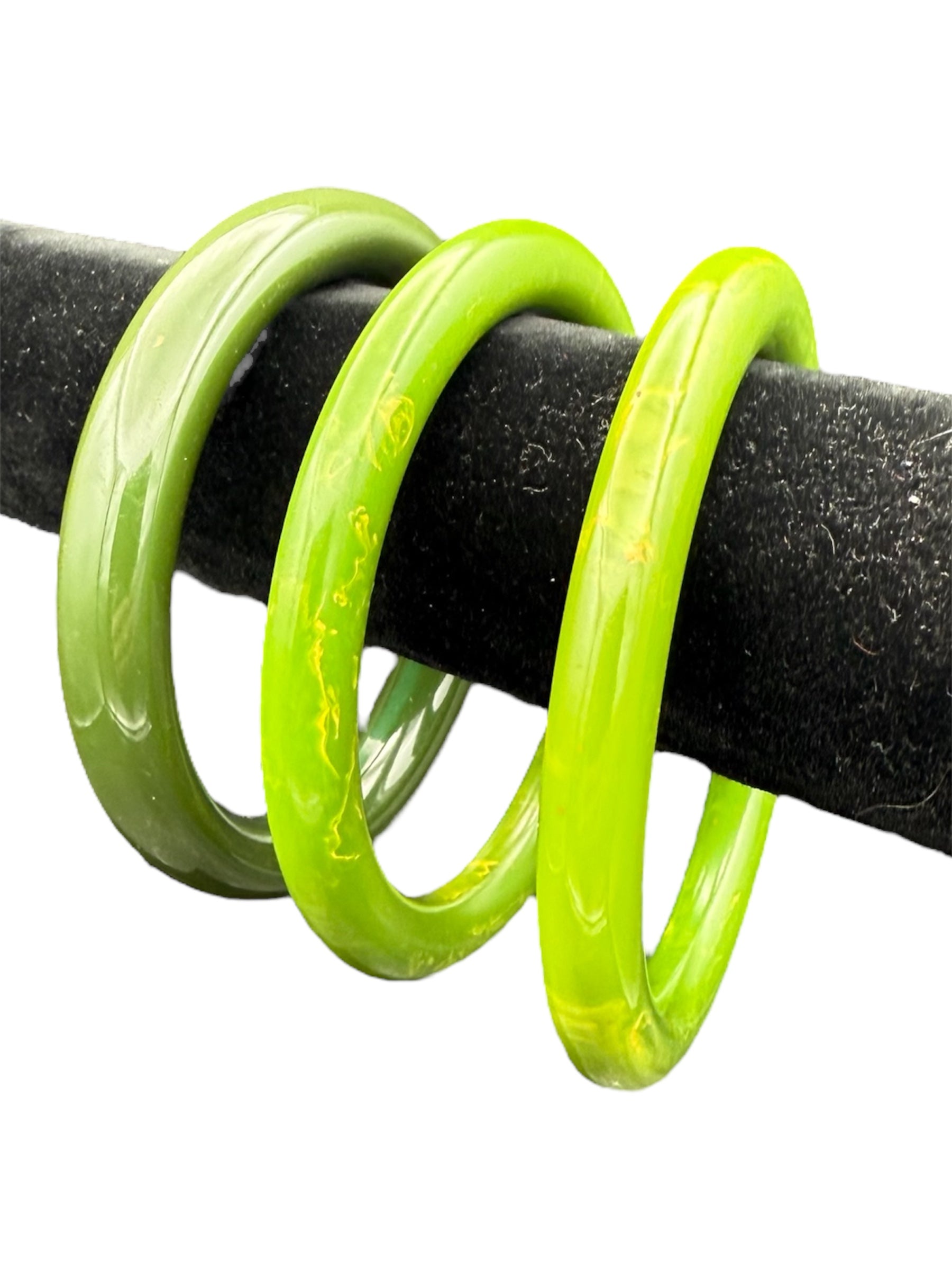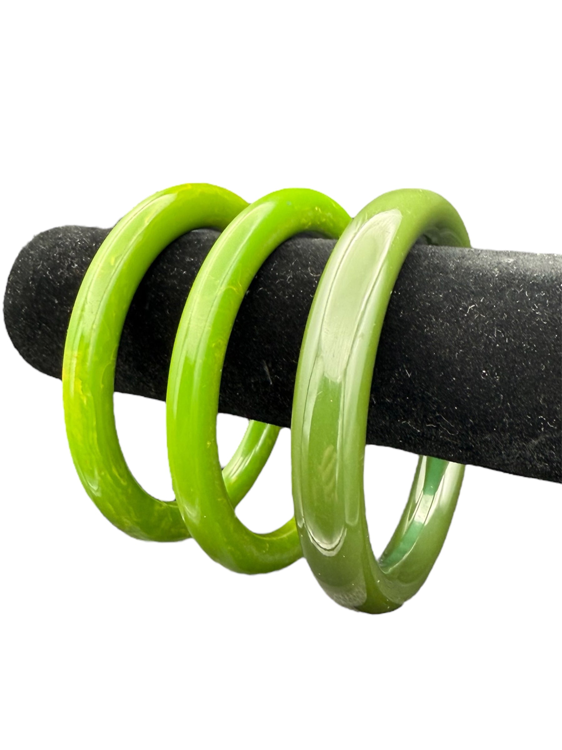 Vintage Bakelite bangles set. This set features three green bakelite bangles. There was no noticeable flaws.