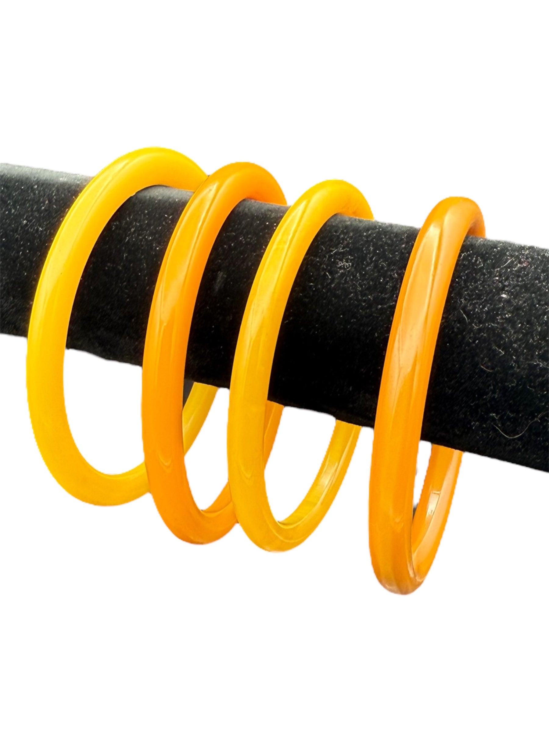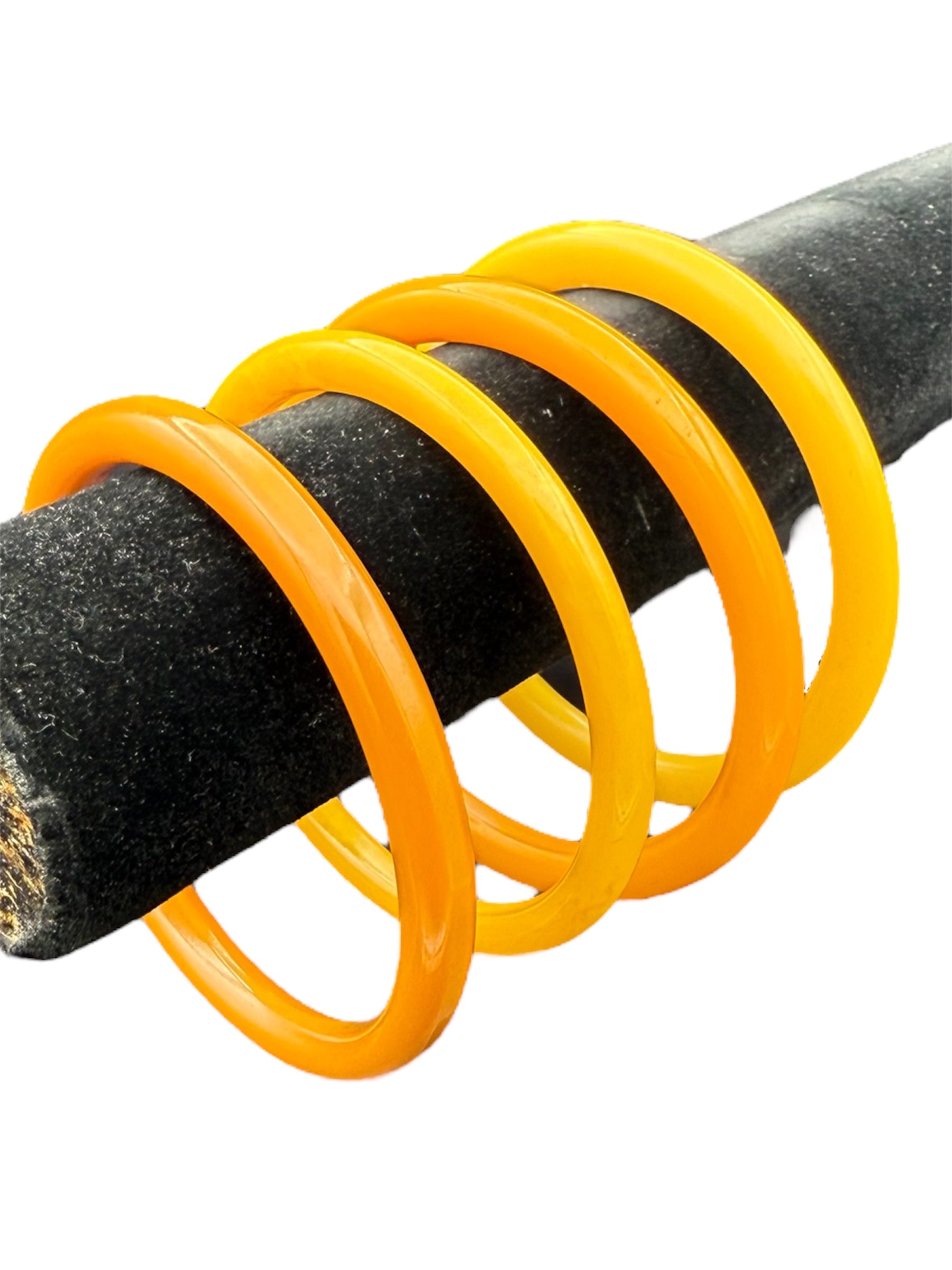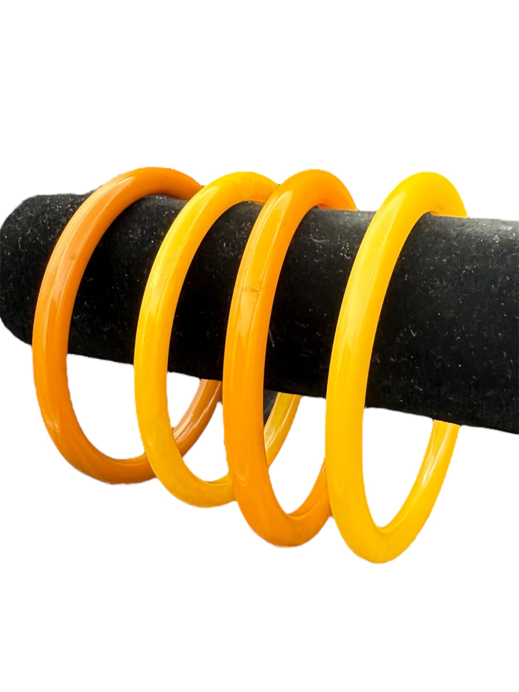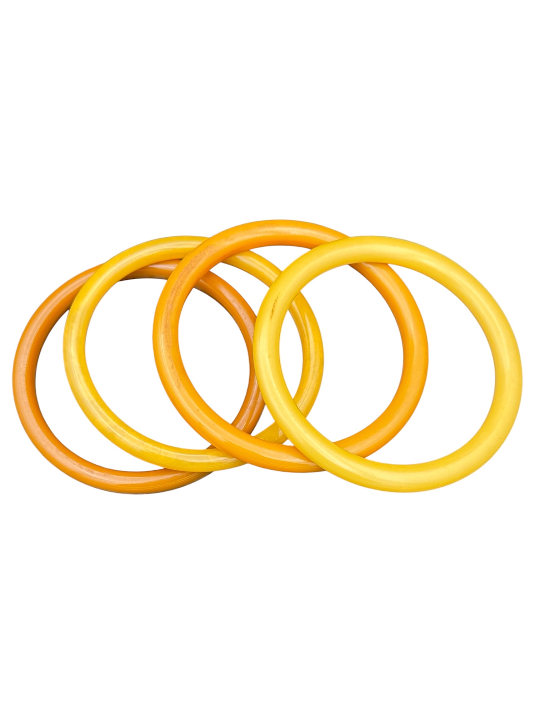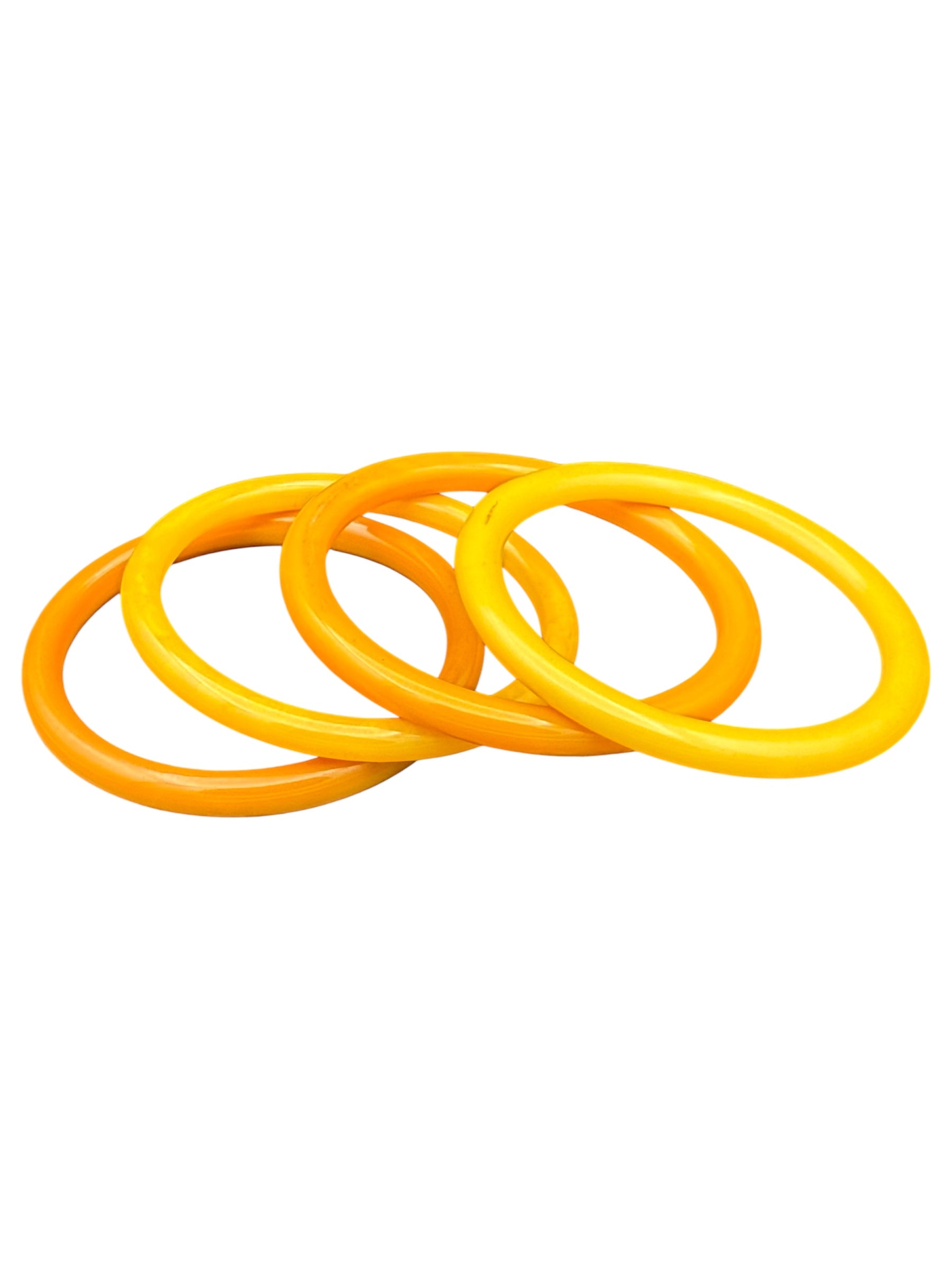 Vintage Bakelite bangles set. This set features four yellow bangles. There is a small mark on one of the bangles, visible in the second and third photos.