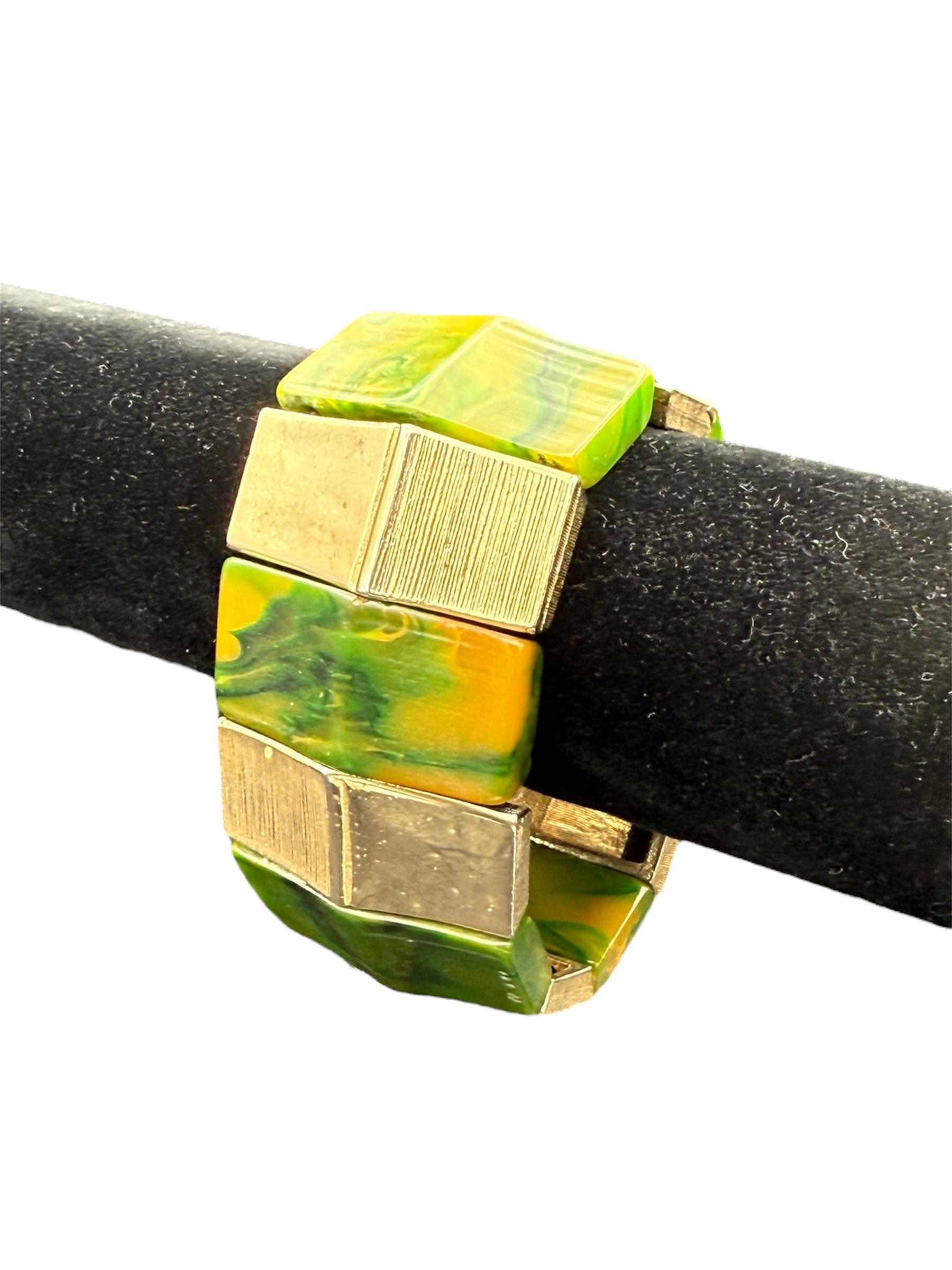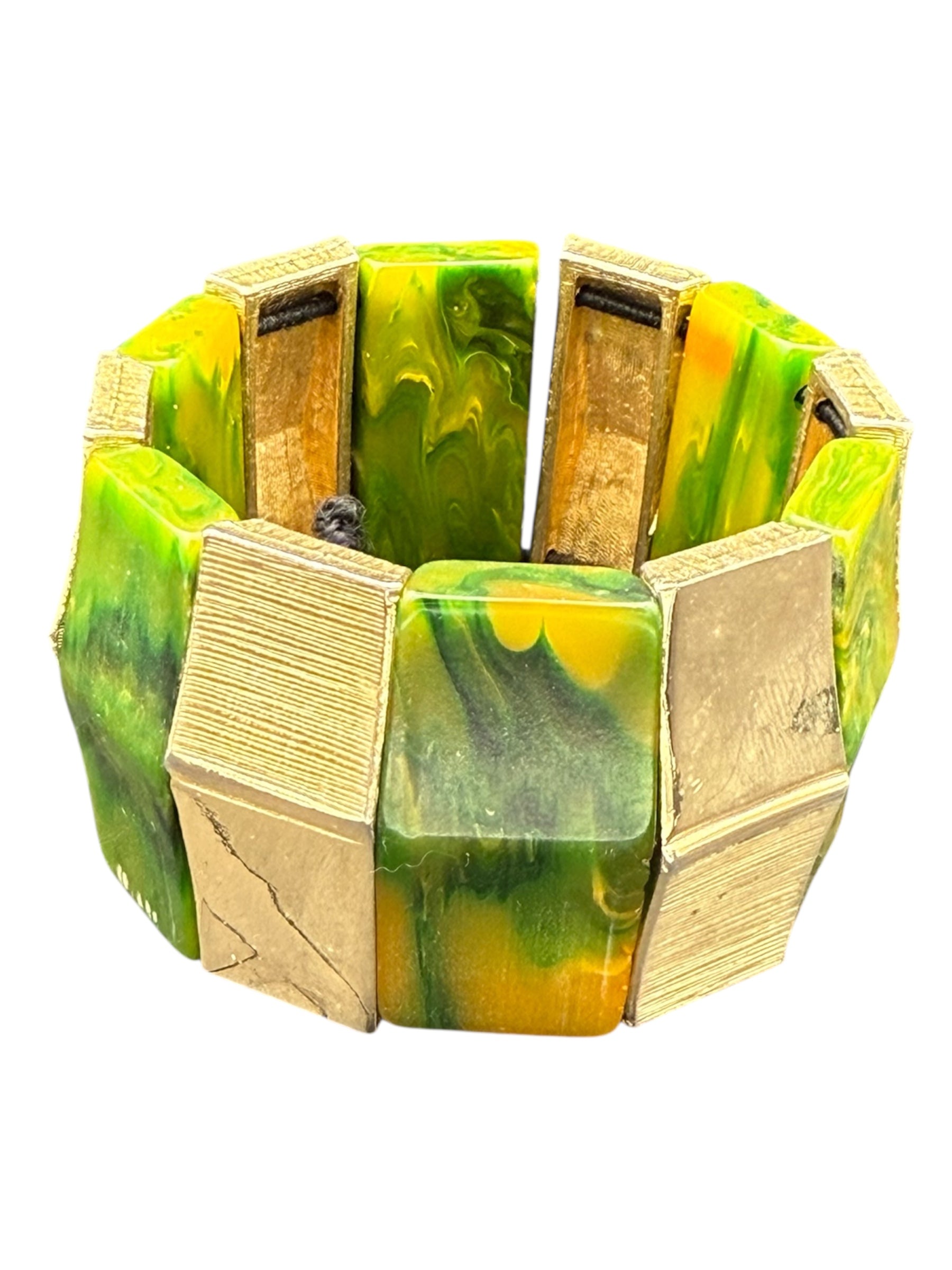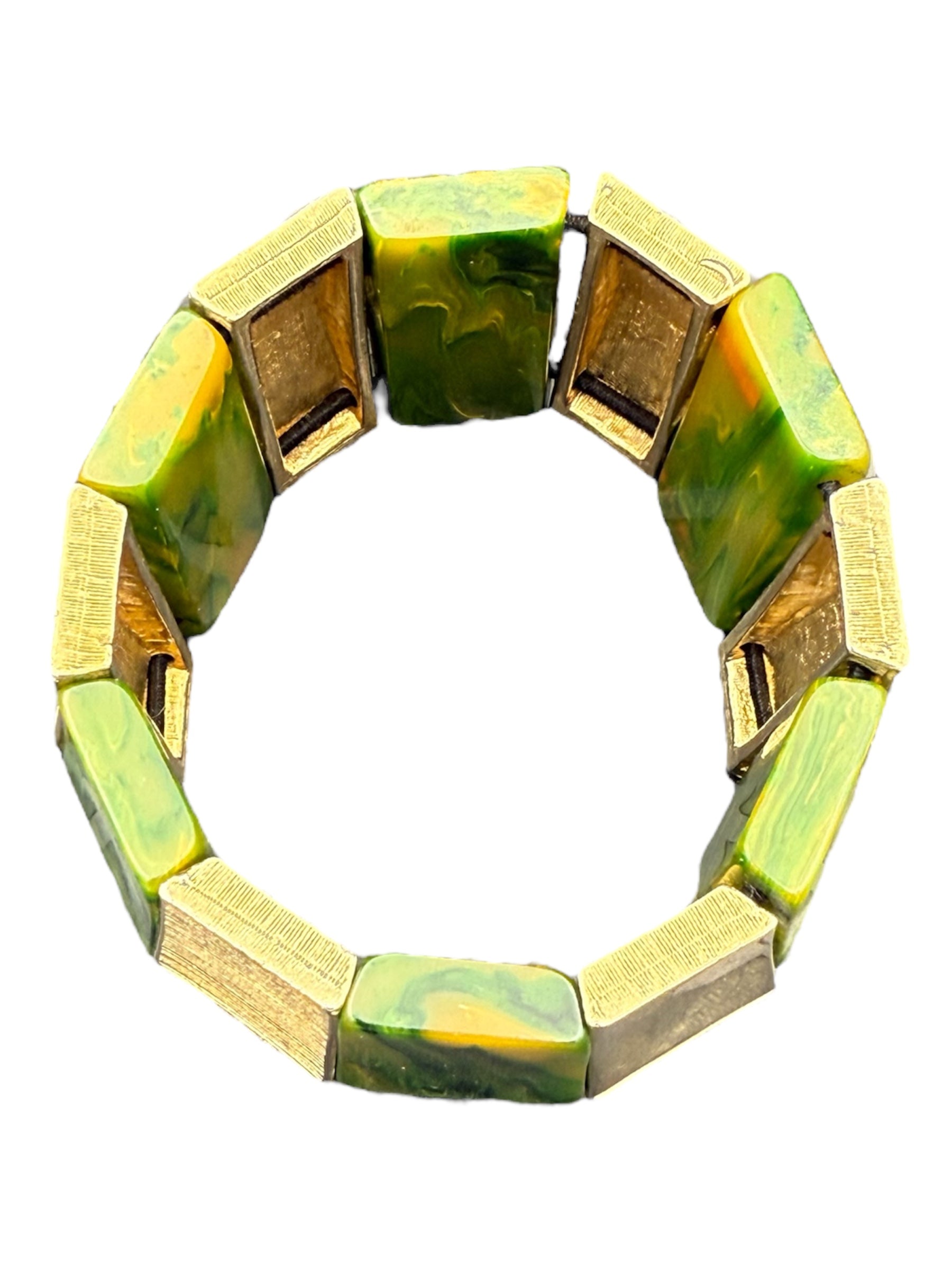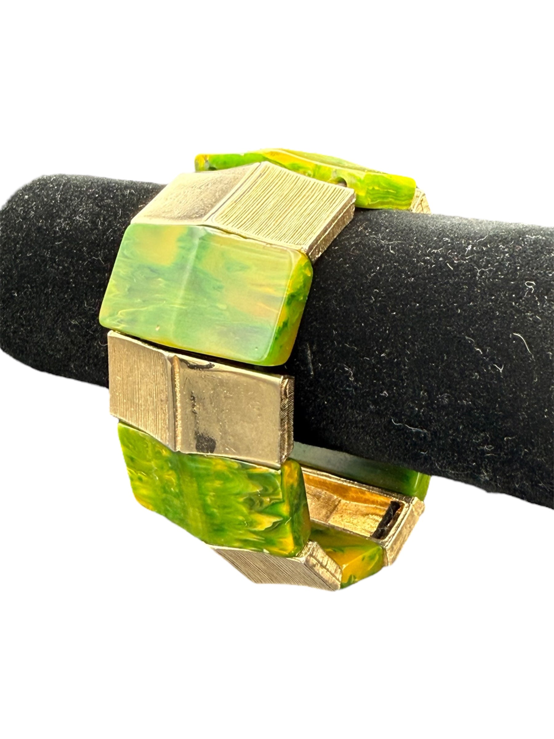 Vintage Bakelite stretch bracelet. This stretchable bracelet features green pieces with hints of yellow with gold-toned pieces in between. There was no noticeable flaws with this item.