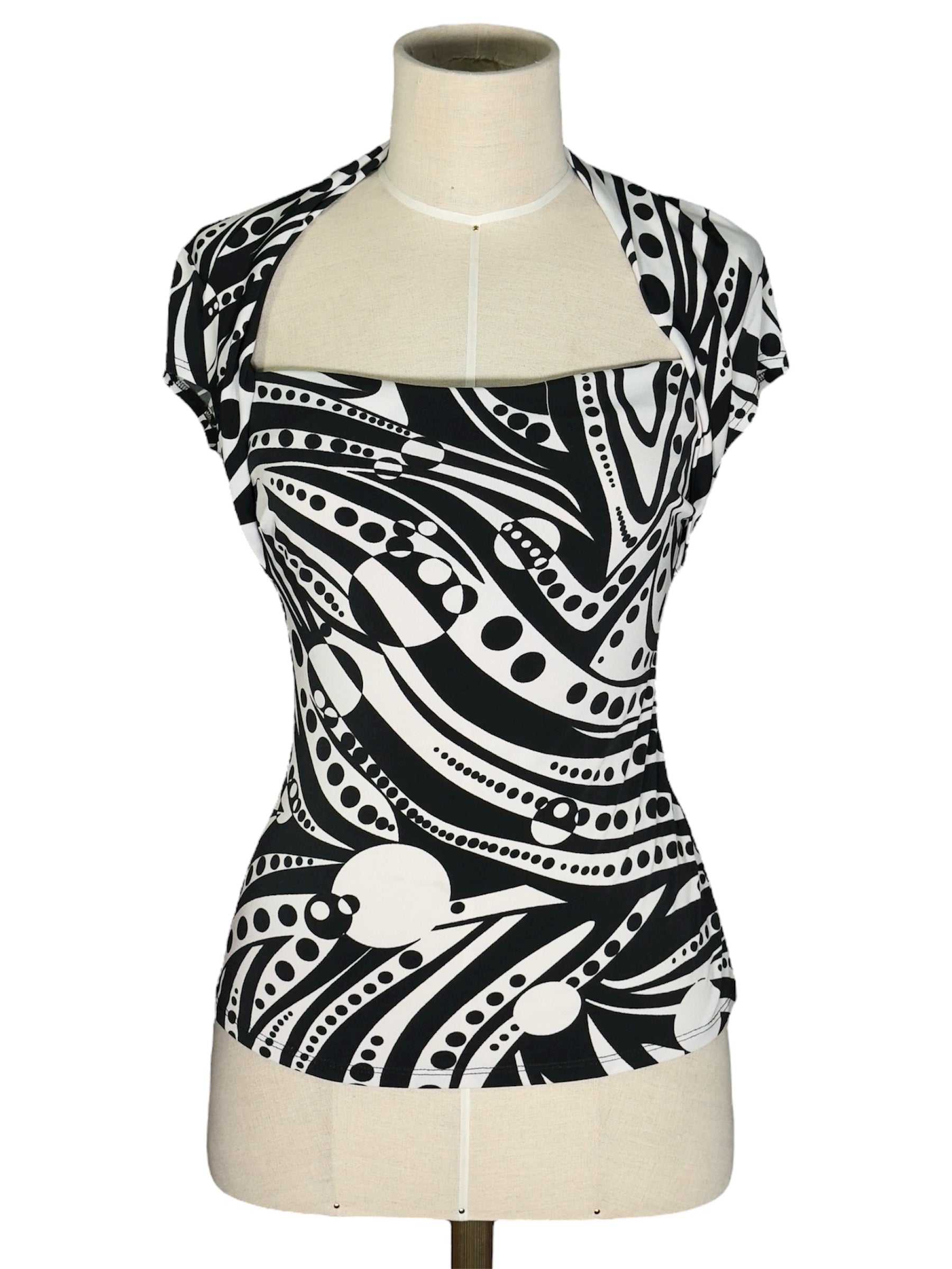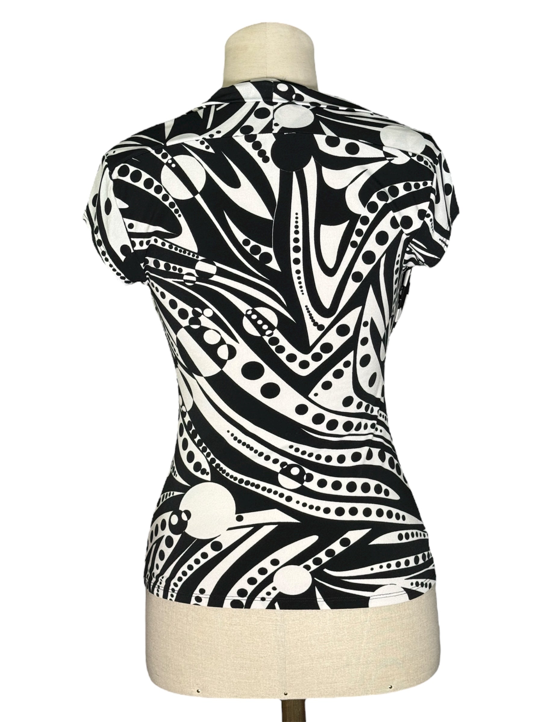 1990s Cache Black and White Abstract Swirl Print Top
