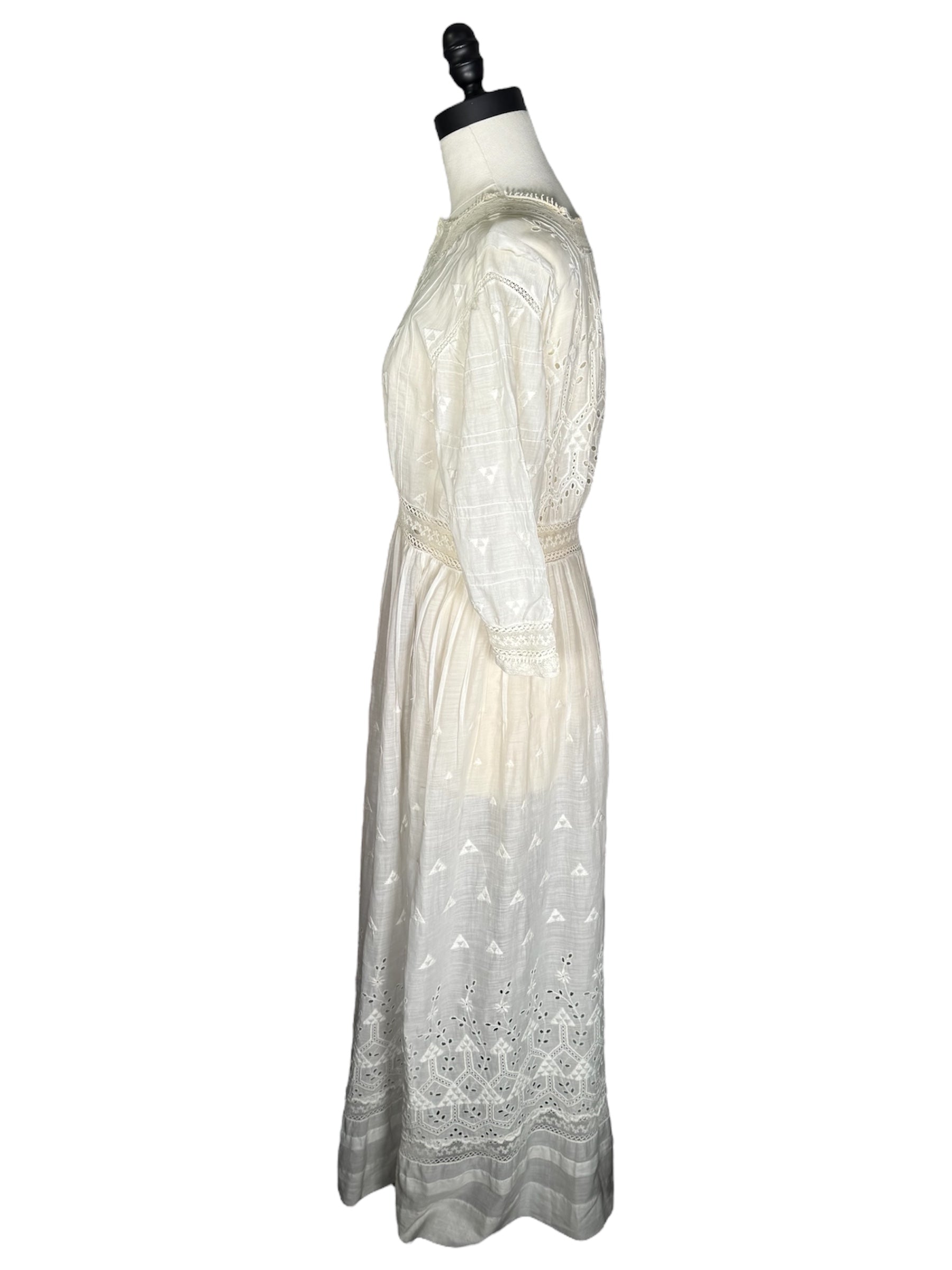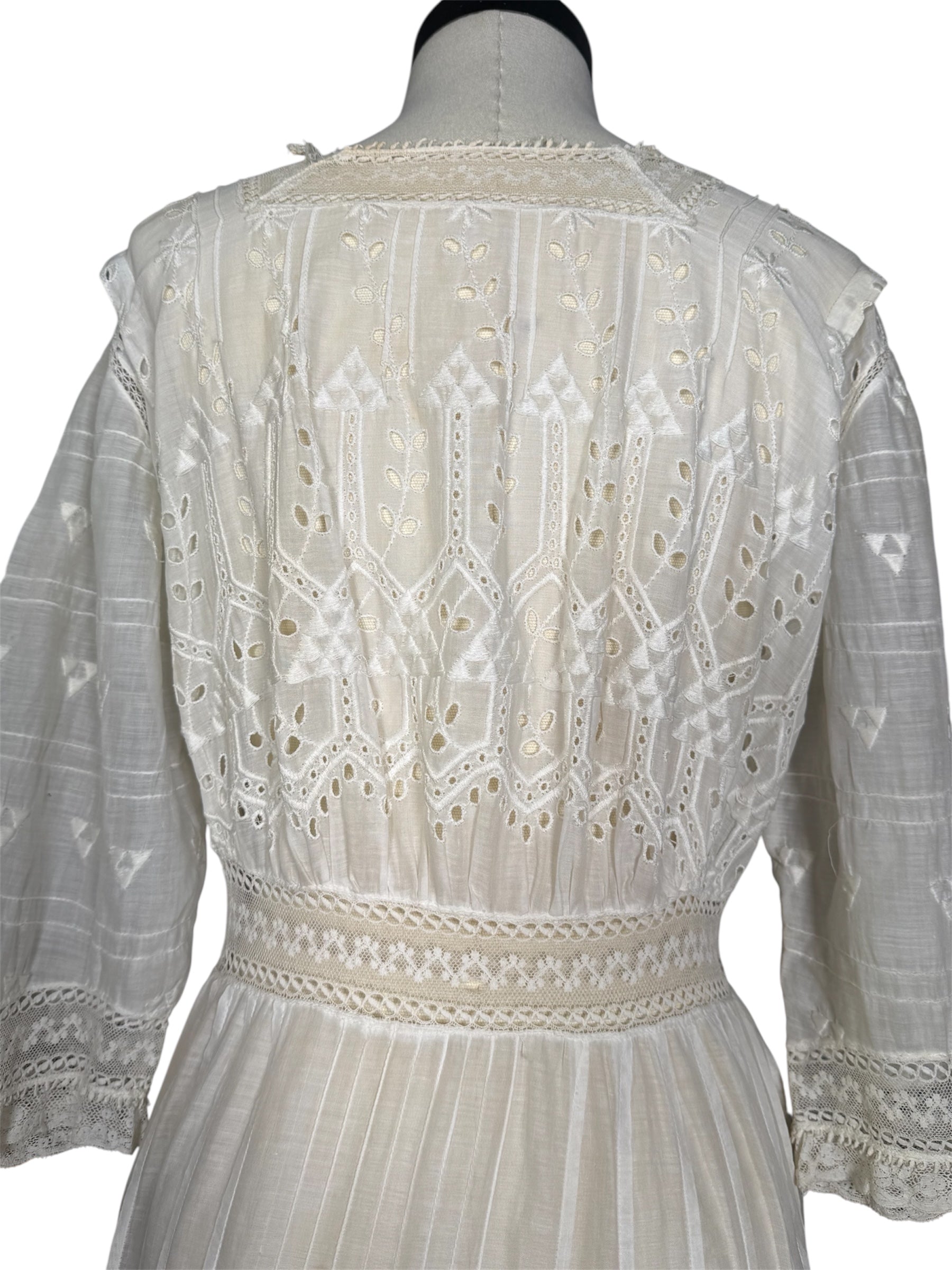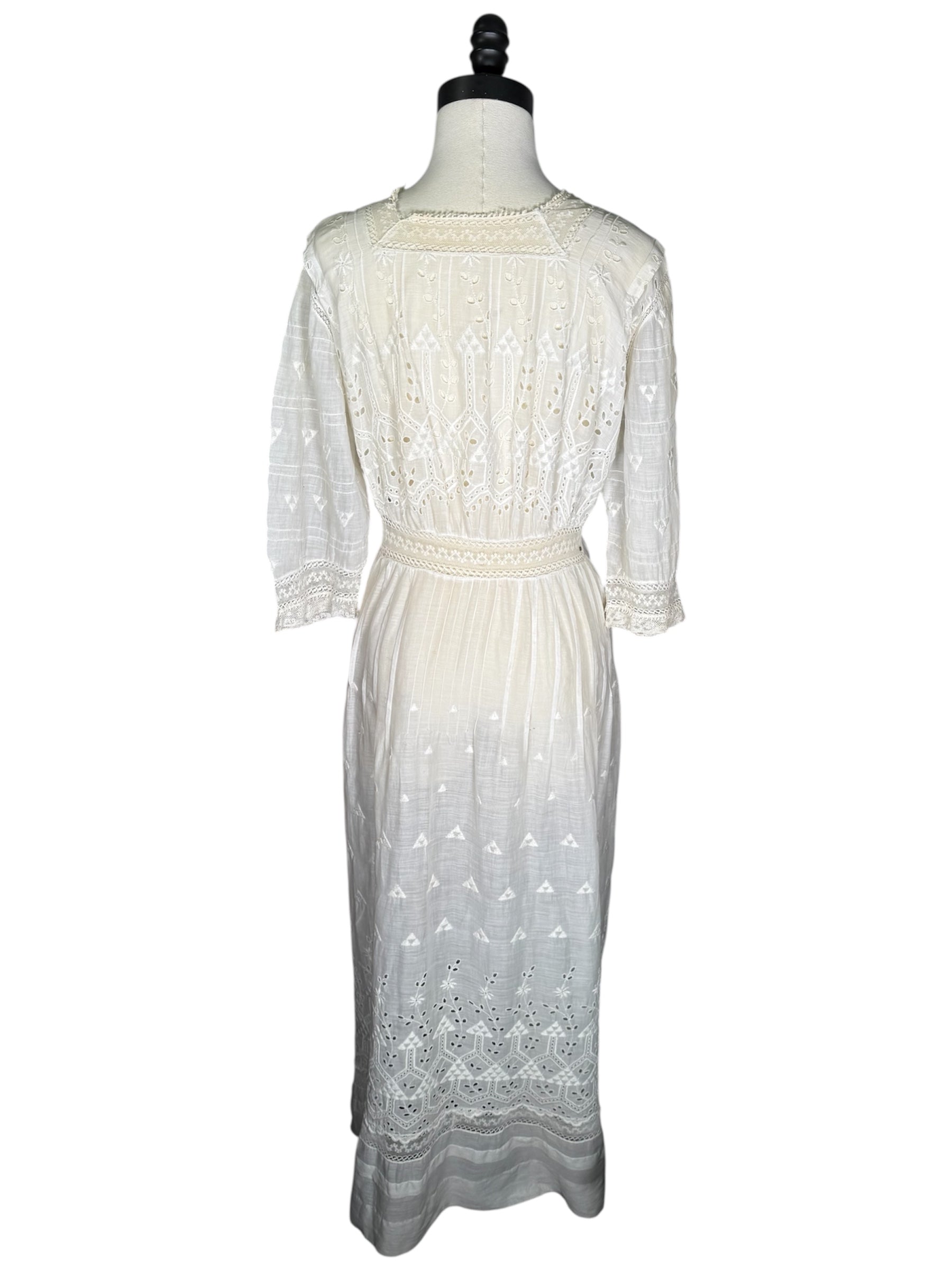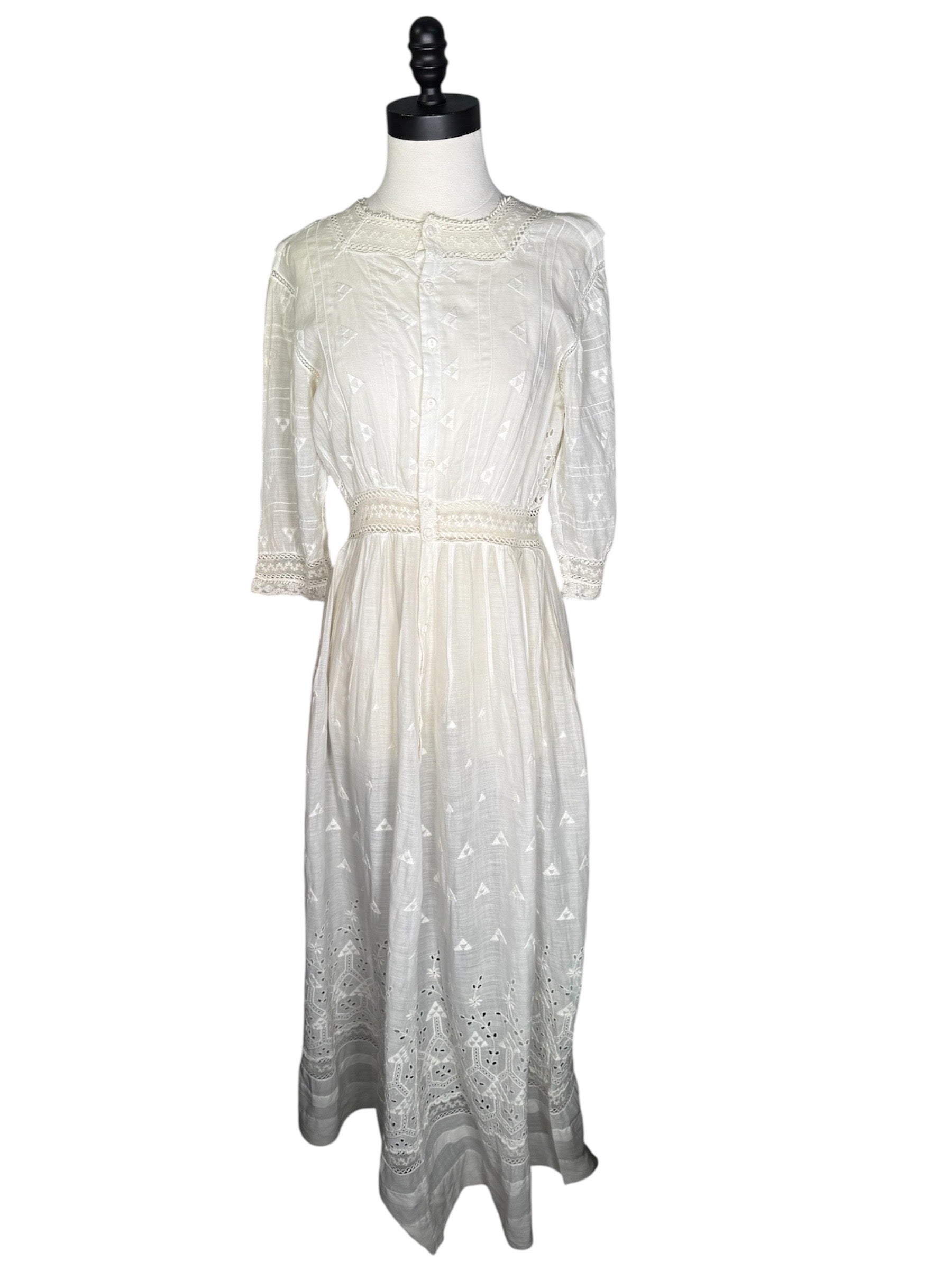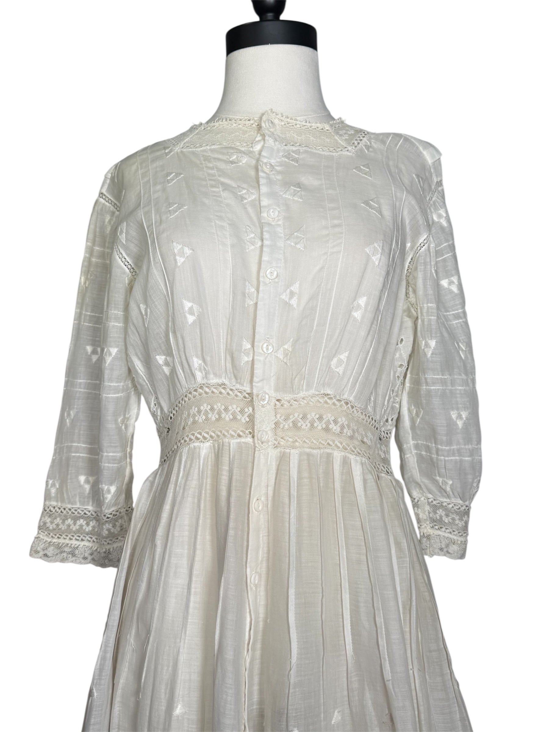 1901-1910 Edwardian day dress. This white dress features lace panels on the neckline, on the waist, and at the bottom of the sleeves. It also has floral and triangle embroidery throughout the dress, with heavy embroidery on the bottom. This cotton dress is sheer and was photographed without a slip. It has a square neckline and three-fourths sleeves. It attaches at the front with buttons that go from the top of the dress to the middle of the skirt. There are condition issues with this dress, pictured in the last three photos. There are slight tears in three areas of the lace.