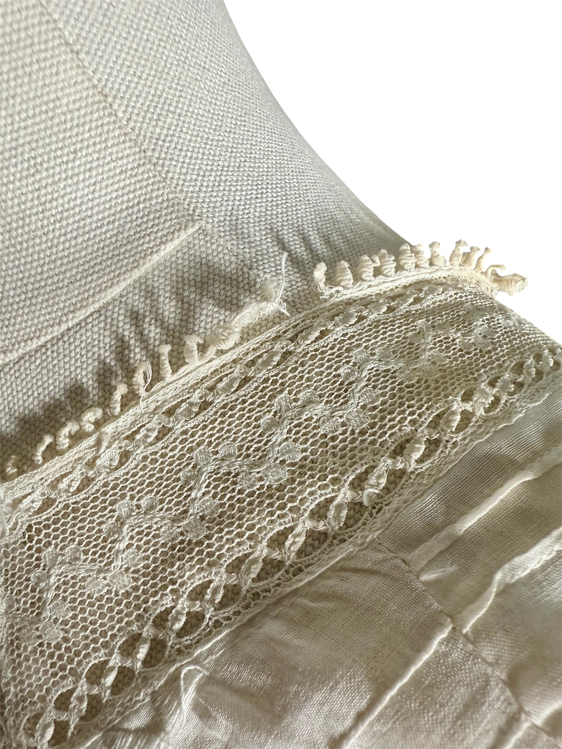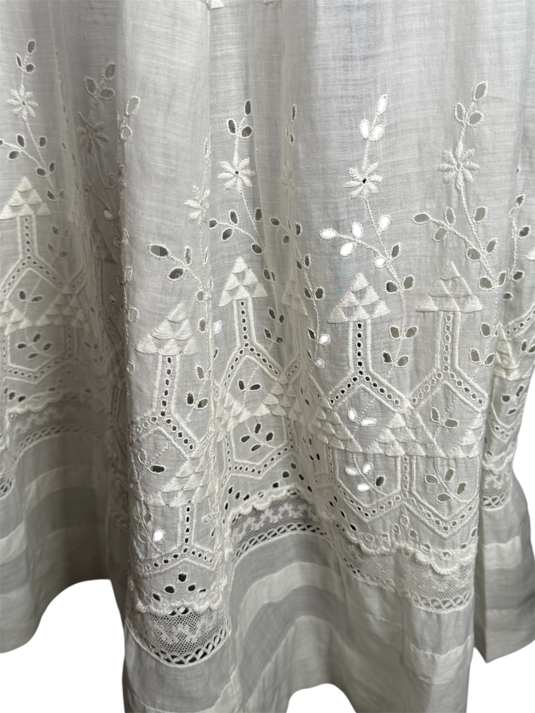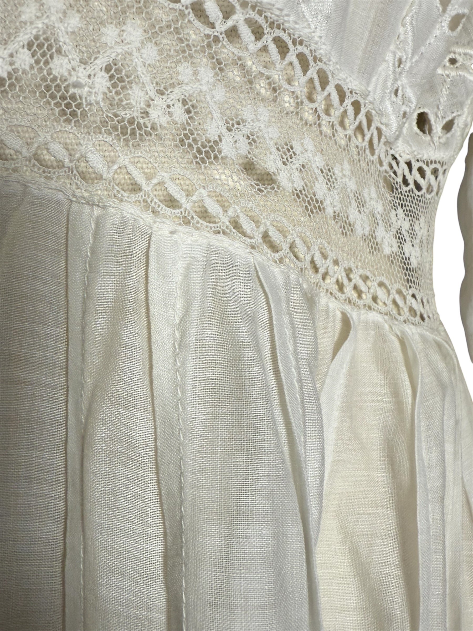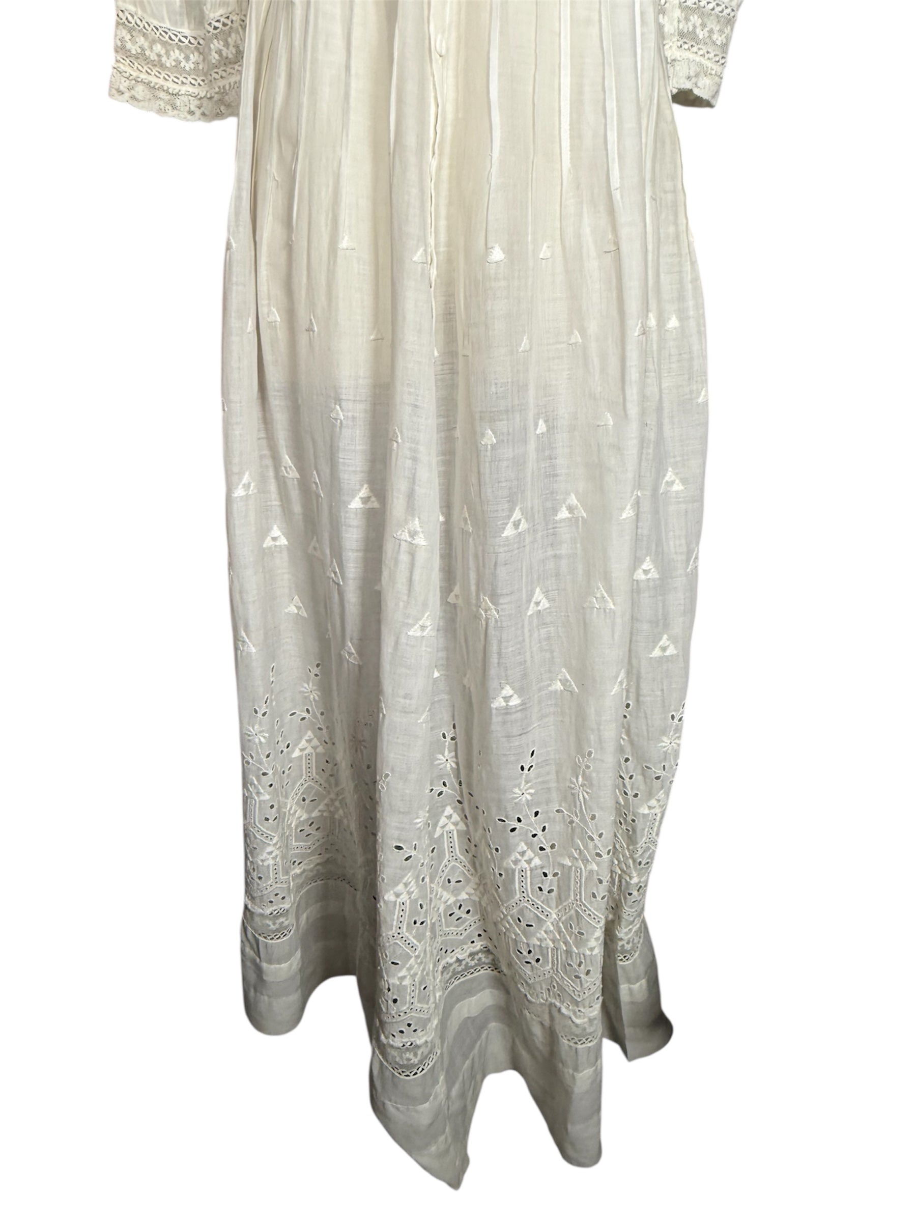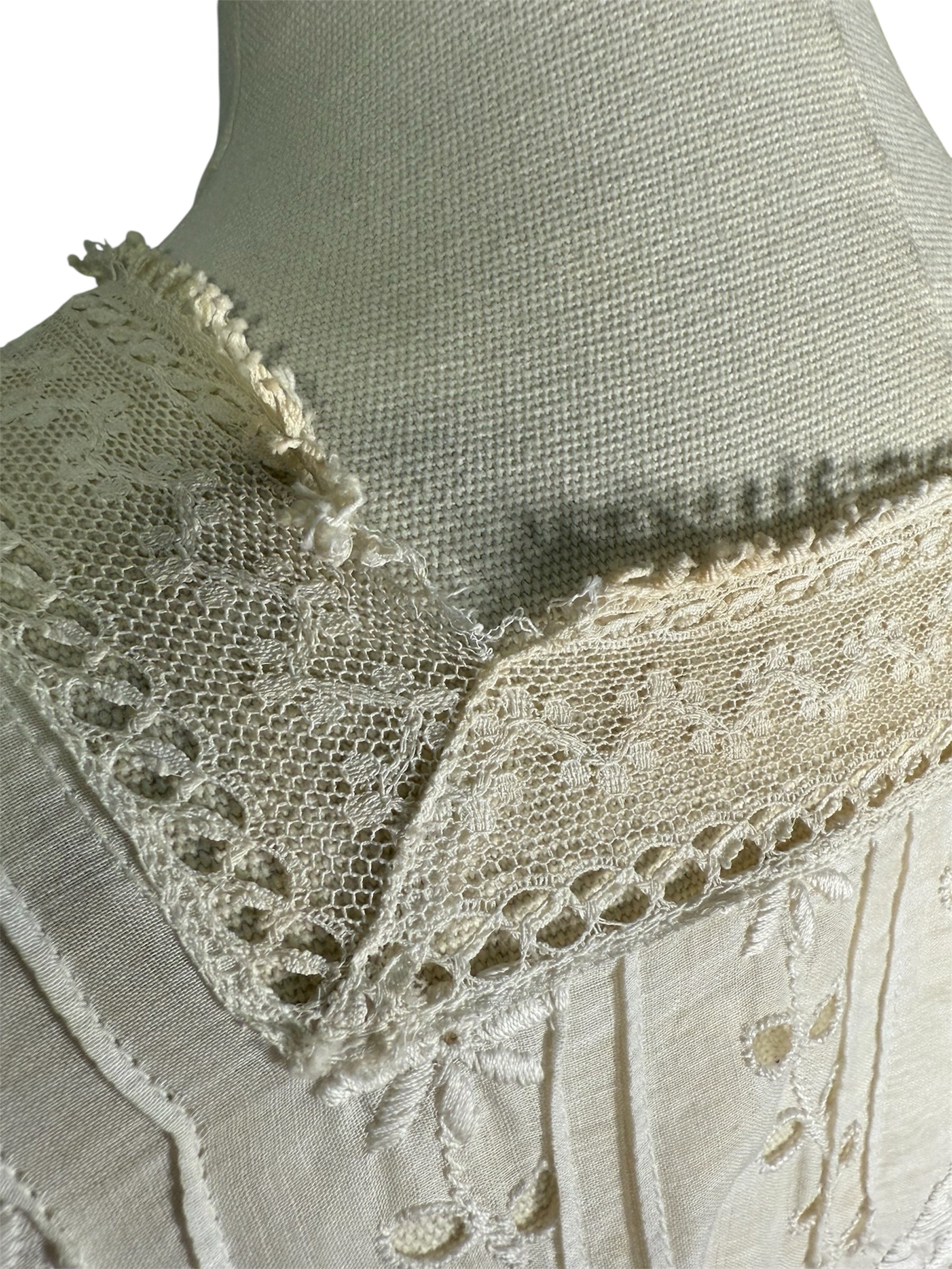 1901-1910 Edwardian day dress. This white dress features lace panels on the neckline, on the waist, and at the bottom of the sleeves. It also has floral and triangle embroidery throughout the dress, with heavy embroidery on the bottom. This cotton dress is sheer and was photographed without a slip. It has a square neckline and three-fourths sleeves. It attaches at the front with buttons that go from the top of the dress to the middle of the skirt. There are condition issues with this dress, pictured in the last three photos. There are slight tears in three areas of the lace.
