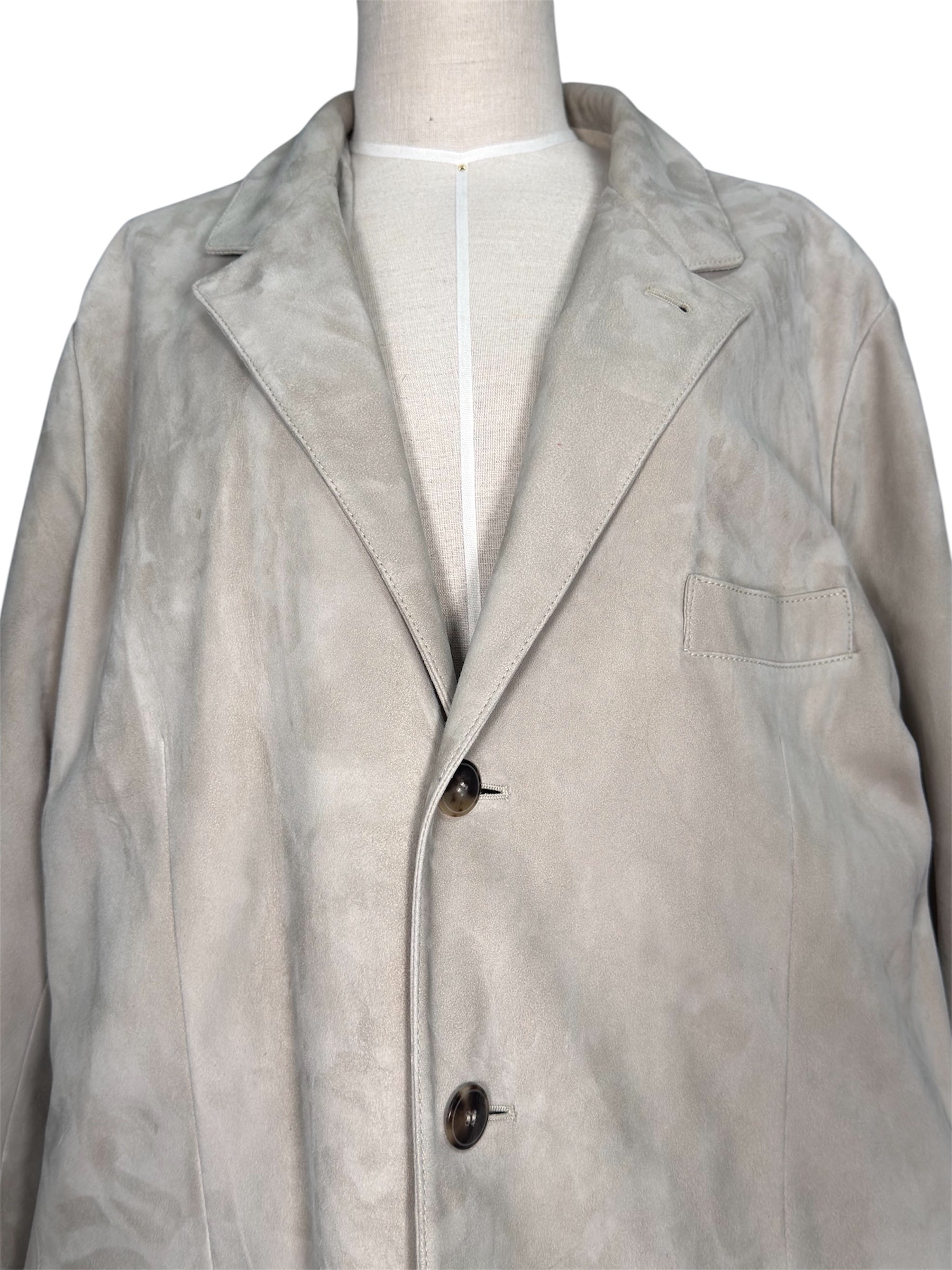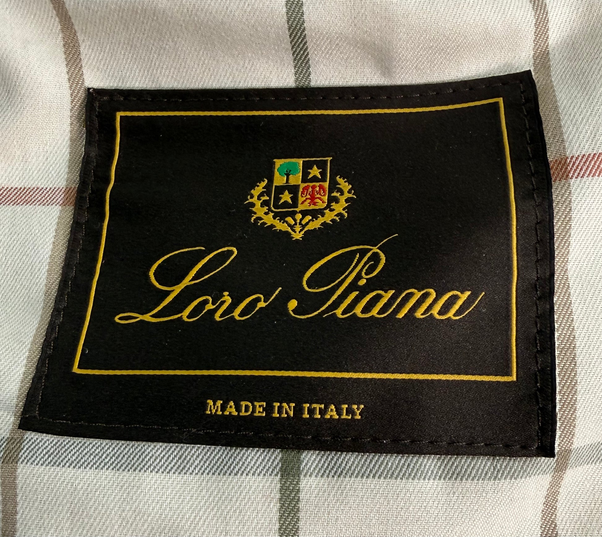 Modern Loro Piana jacket featuring soft kidskin leather in a light beige tone, notched lapels, three-button front closure, and flap pockets. Fully lined interior in a check pattern with subtle red and green lines, and interior pockets for added utility. Made in Italy with premium craftsmanship and luxurious feel. It is marked a size 54, but please refer to the measurements. Condition is excellent with minimal visible signs of wear.