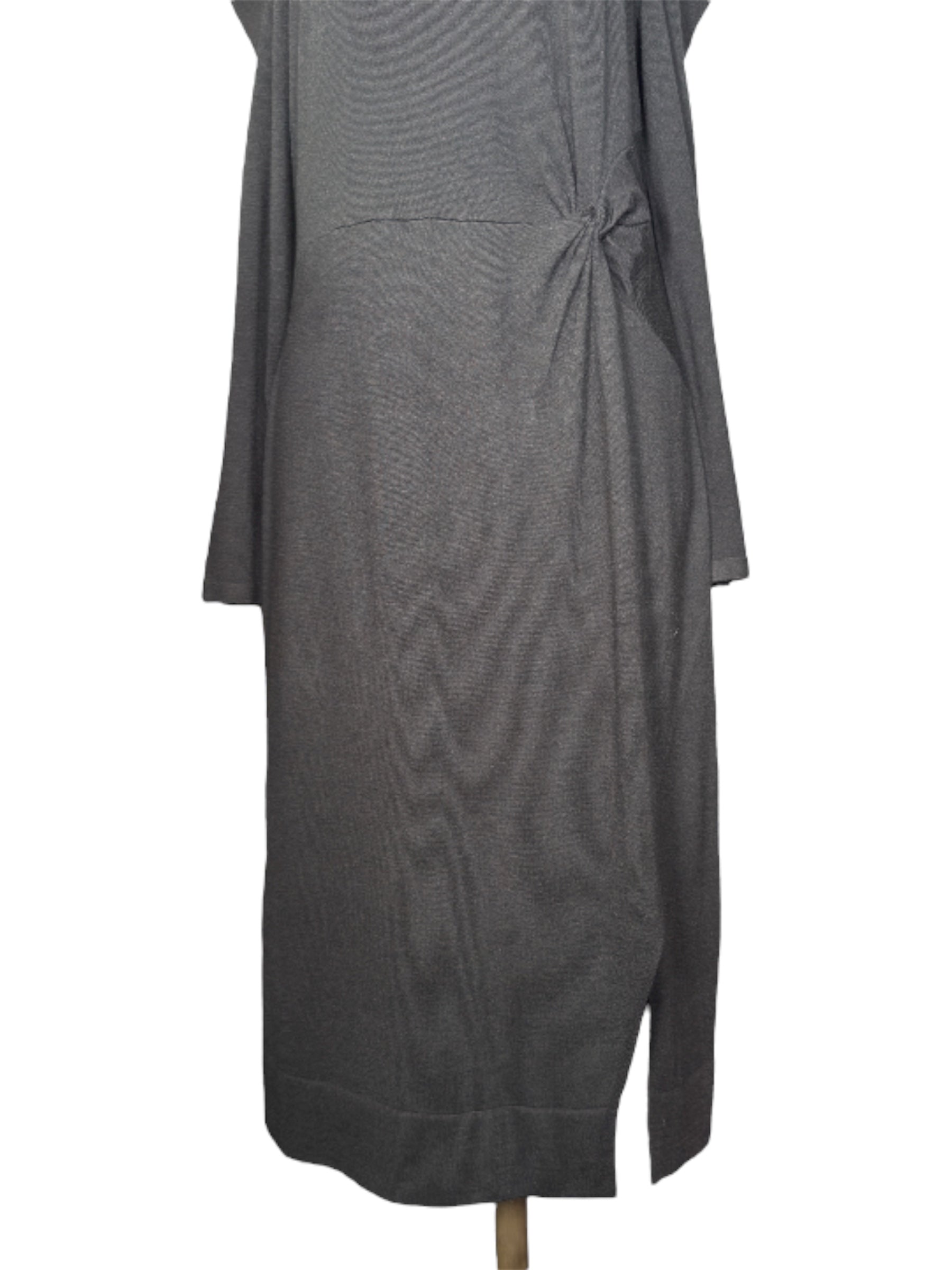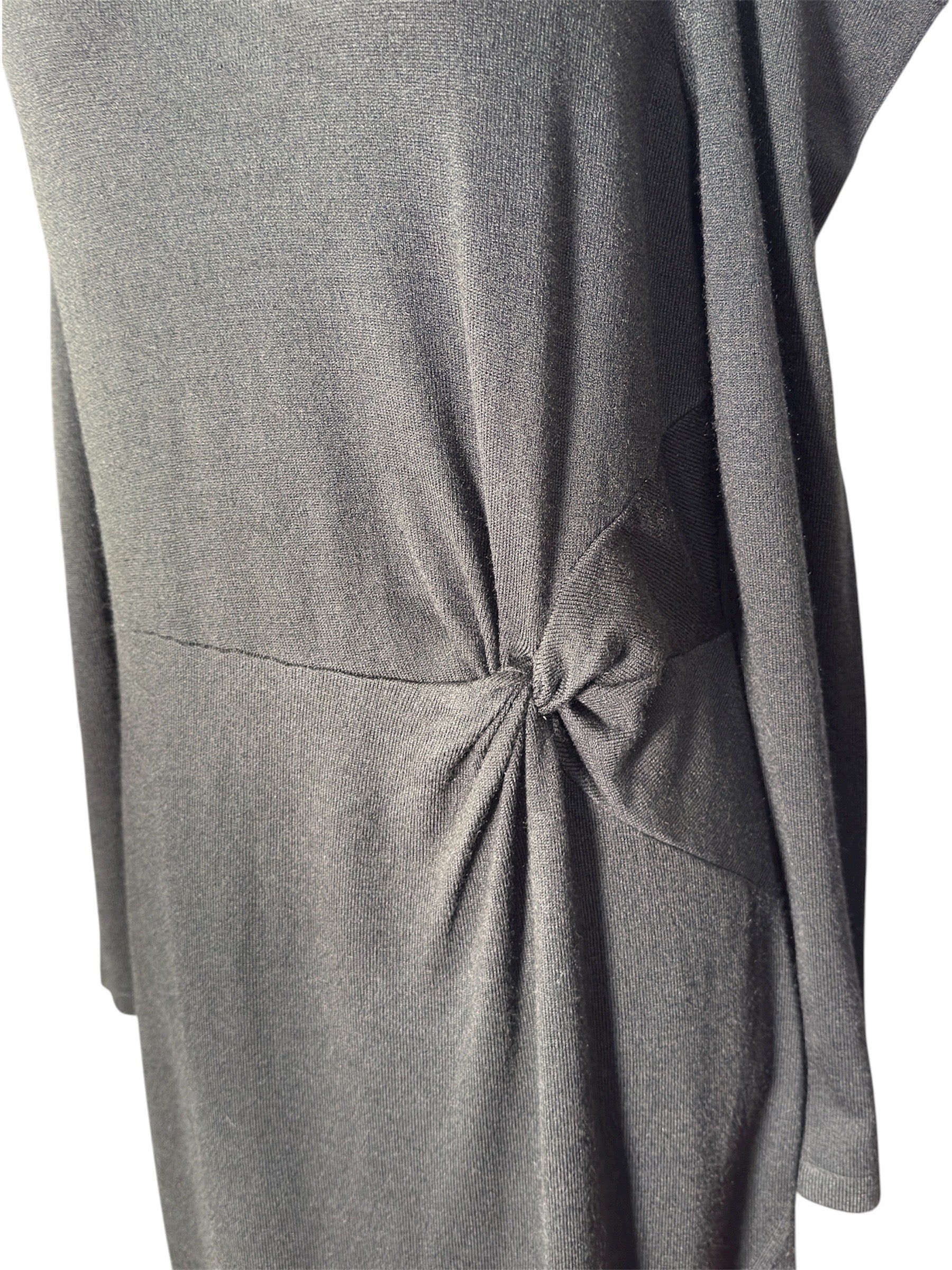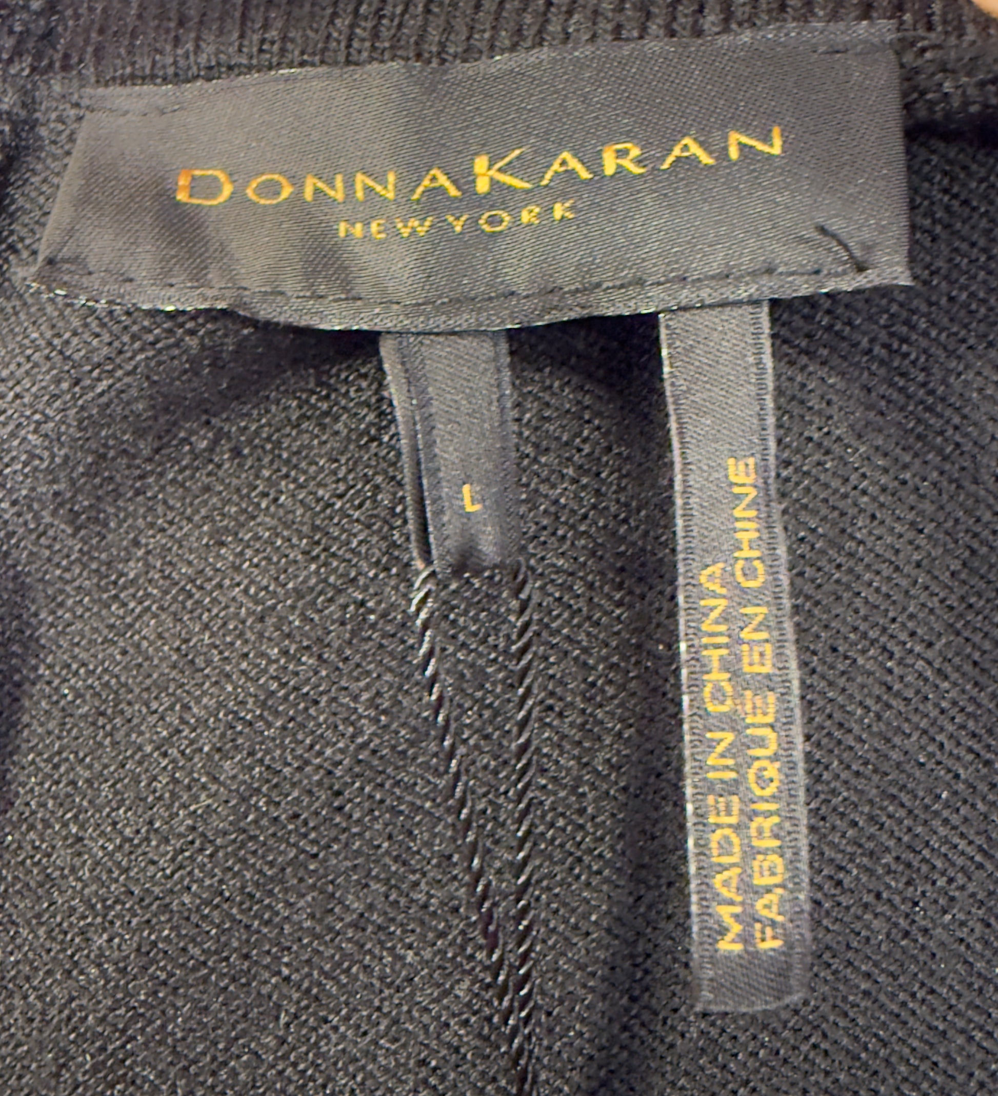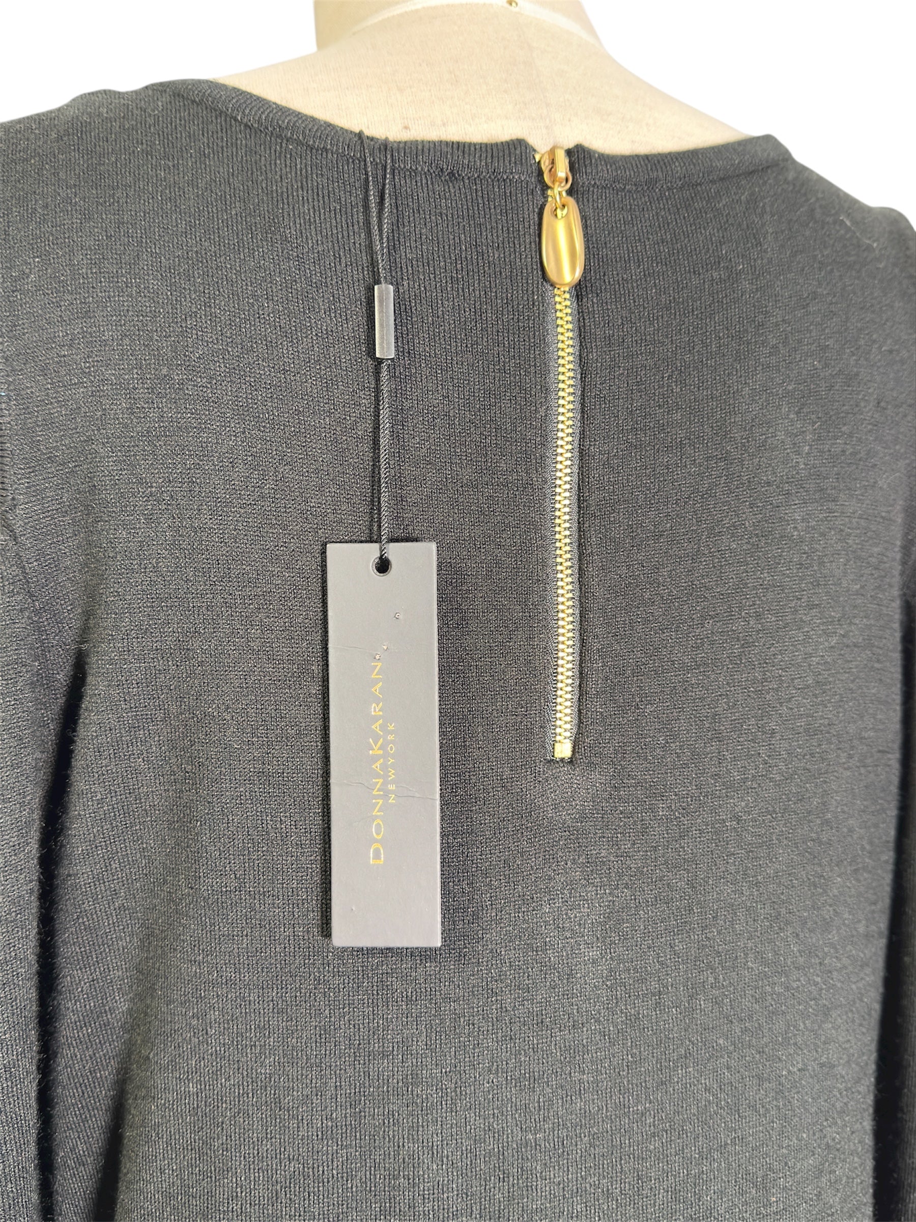 Modern Donna Karan New York deadstock/new with tags black dress. This dress features cold shoulder long sleeves, a gathered waist, and a slit in the side of the bottom of the front. The material is 64% acrylic, 29% nylon, 5% wool, and 2% spandex. It attaches at the back with a gold zipper. The dress was made in China and is marked a size large, but please refer to the measurements. There was no visible condition issues with this piece.