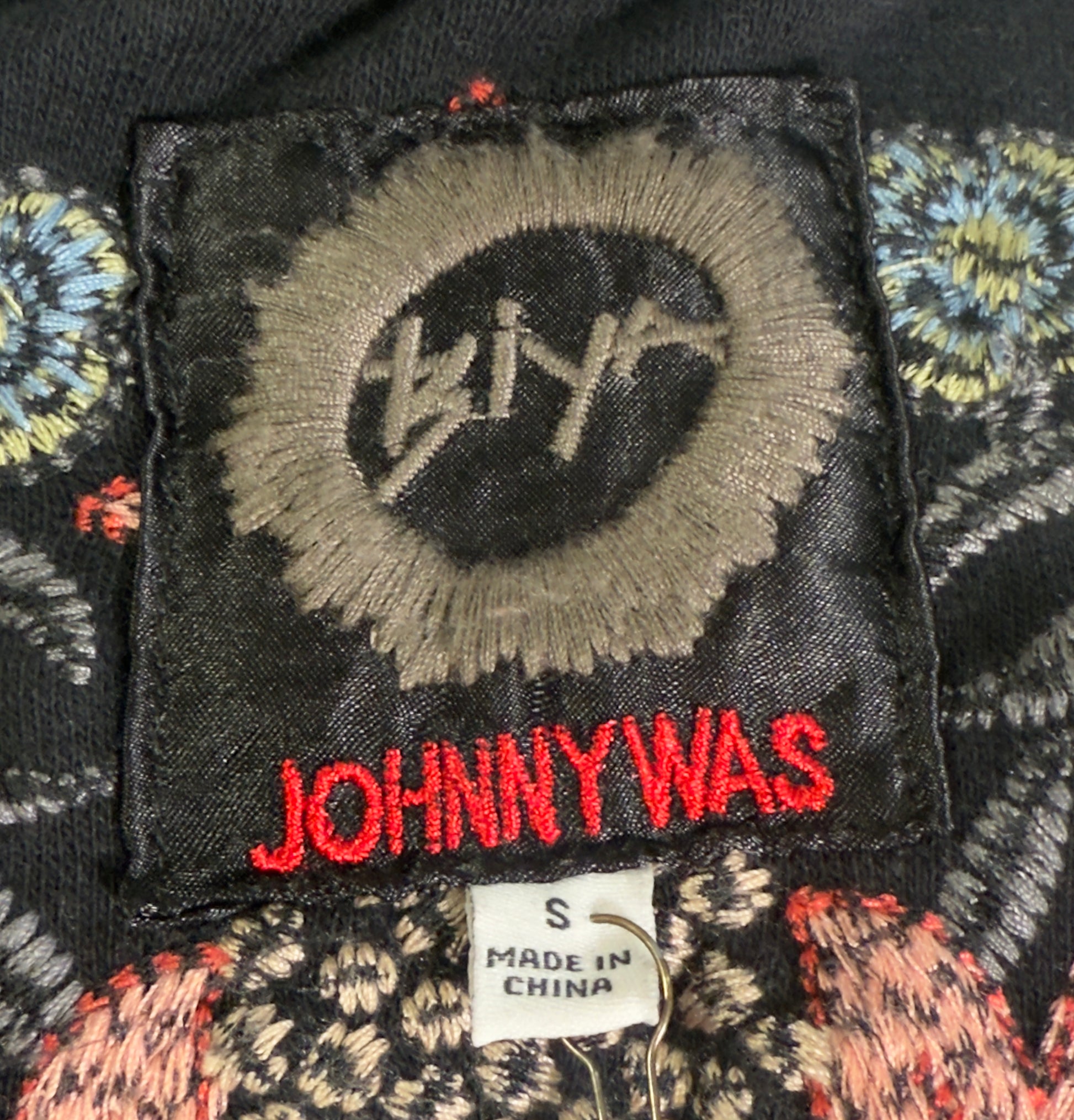 Modern Johnny Was BIYA Deadstock/NWT cardigan. Ornate long open oversized cardigan featuring allover vibrant flower embroidery, geometric color blocks, front pockets, long sleeves, button closure, and textured stitched details for a statement boho look. It is marked a size small, but please refer to the measurements. The material is 97% cotton and 3% spandex with a 100% polyester trim. There is a slight condition issue with this piece, pictured in the last photo. There is a few loose strings.
