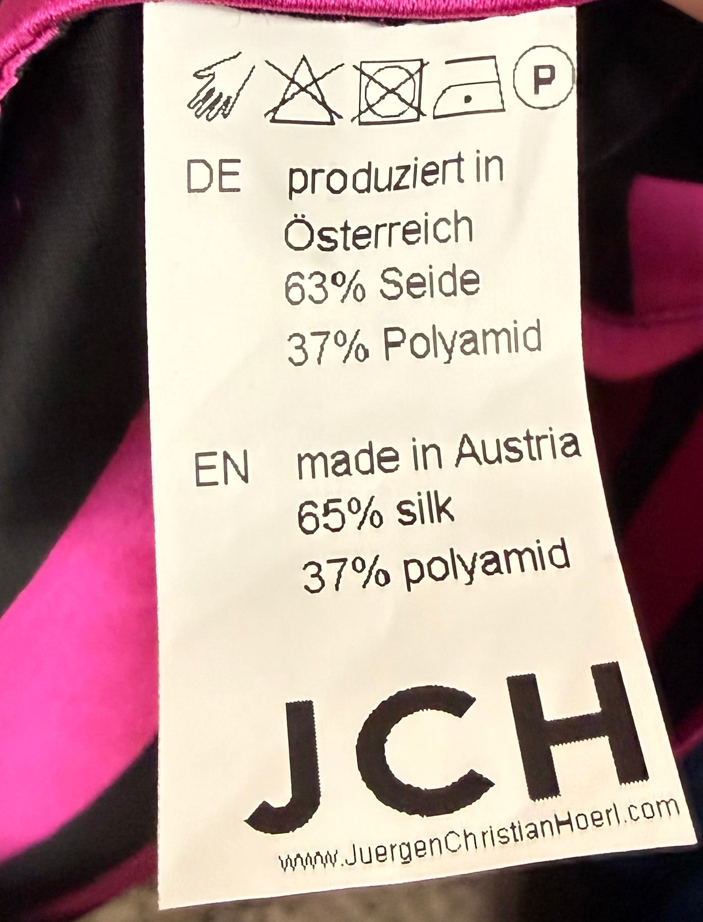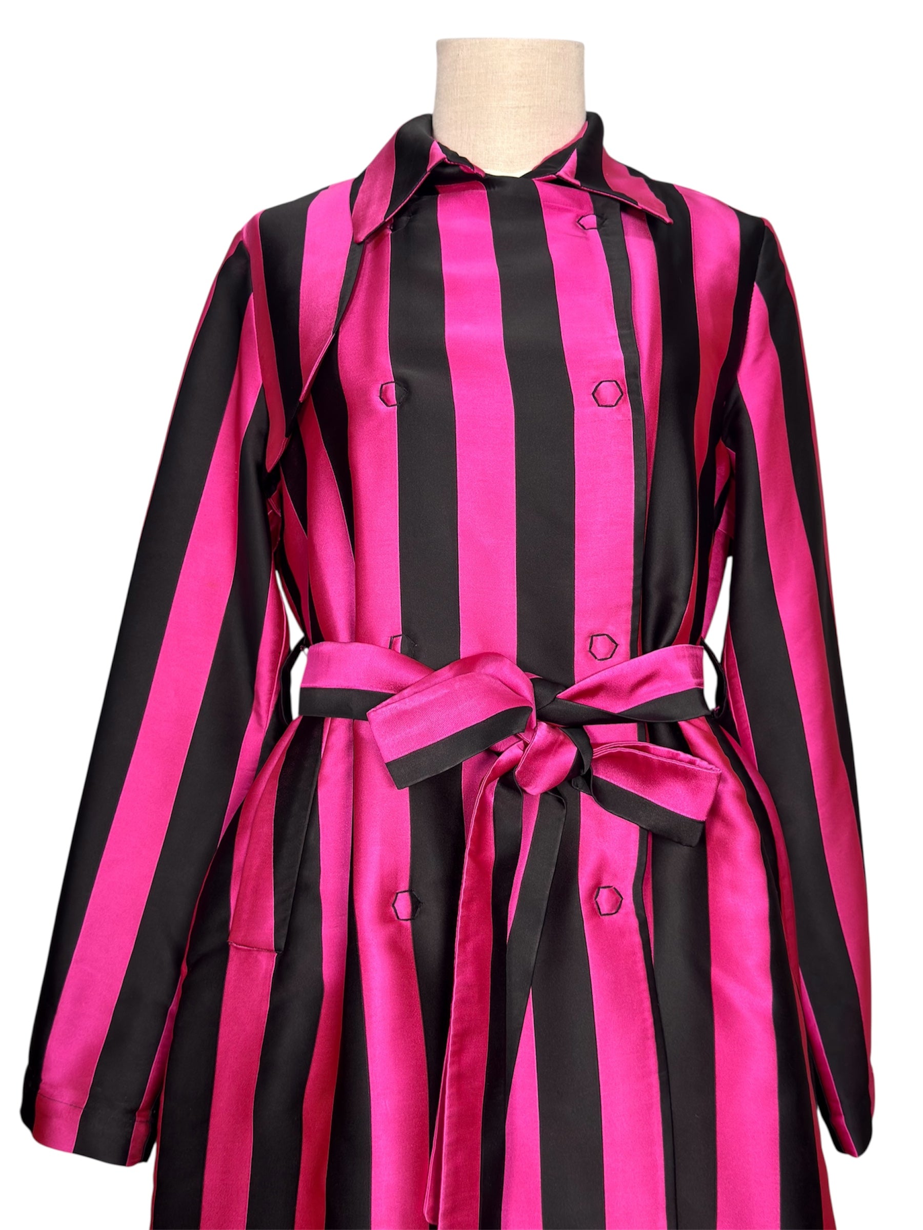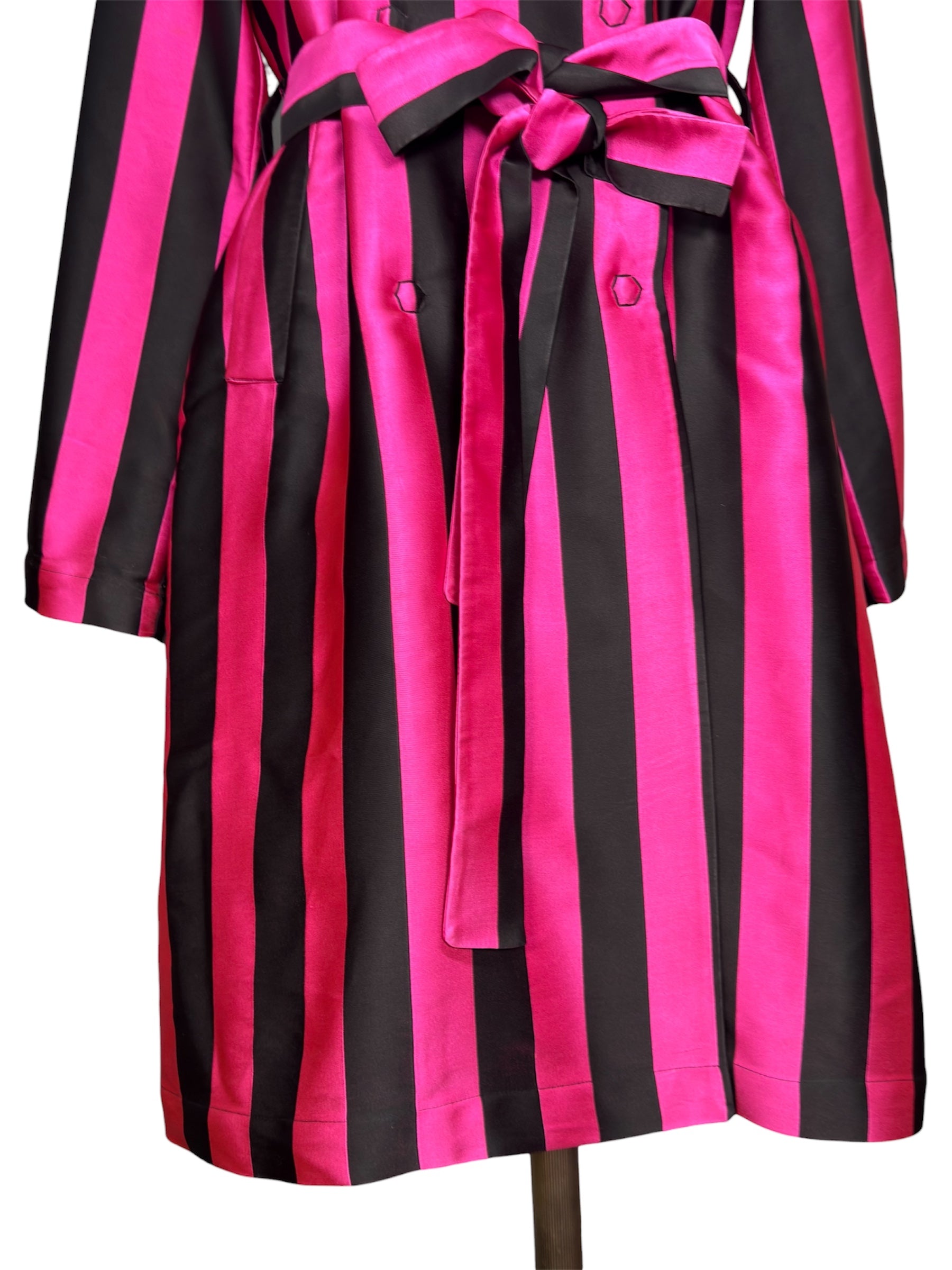 Modern JCH Jurgen Christian Hoerl coat dress. This dress was designed by the Austrian designer Jurgen Christian Hoerl and features a pink and black satin striped look. It has a pointed collar, a fabric overlay detail on the front of the right shoulder, and ties into a cinched look with a fabric belt. There are pockets at the front of either hip and it attaches with a double row of snap buttons in the front. The material of the dress is 63% silk and 37% polyamide/nylon. It was made in Austria and is marked a size 36, but please refer to the measurements. There were no noticeable flaws with this piece, in excellent condition.