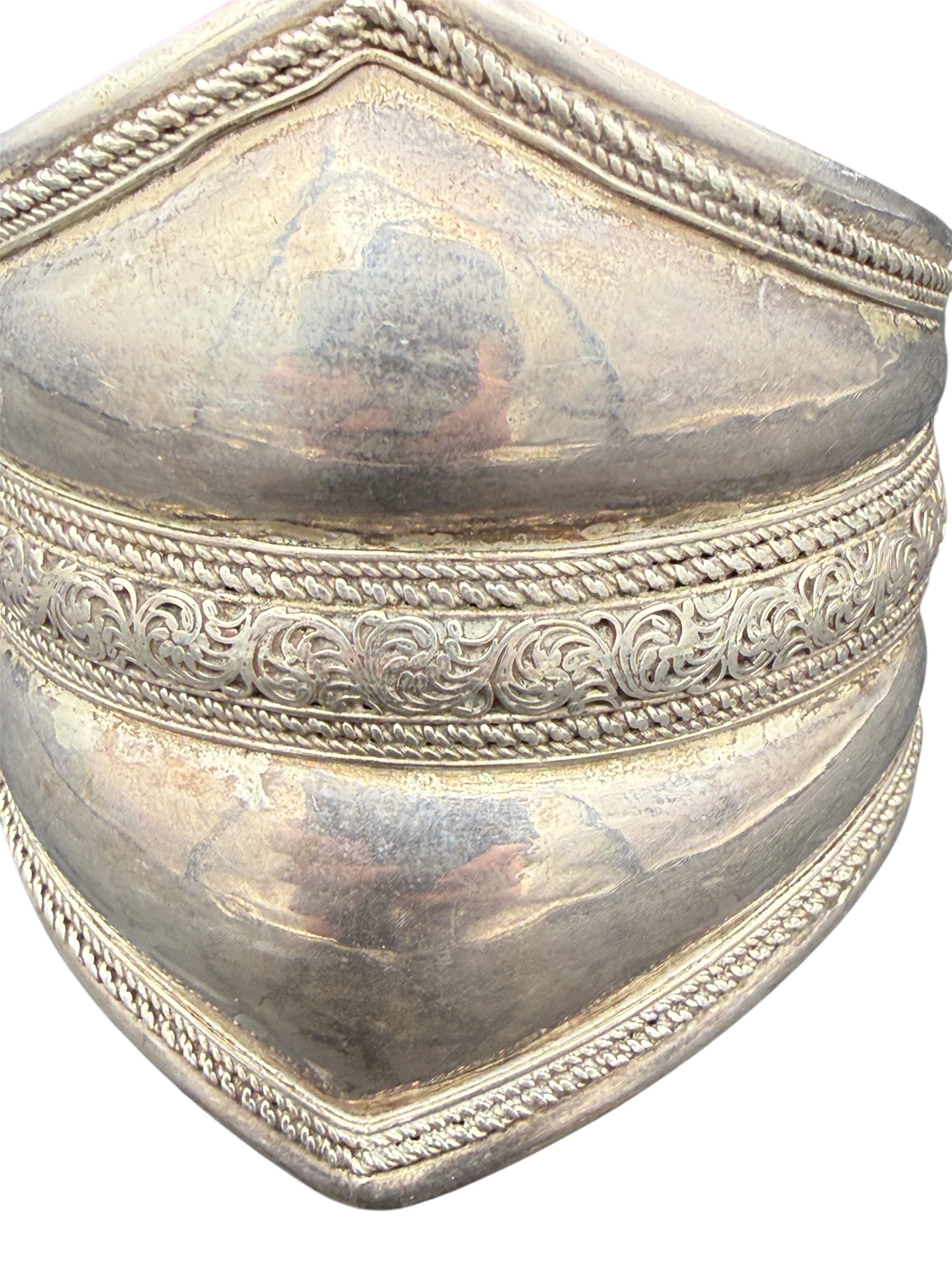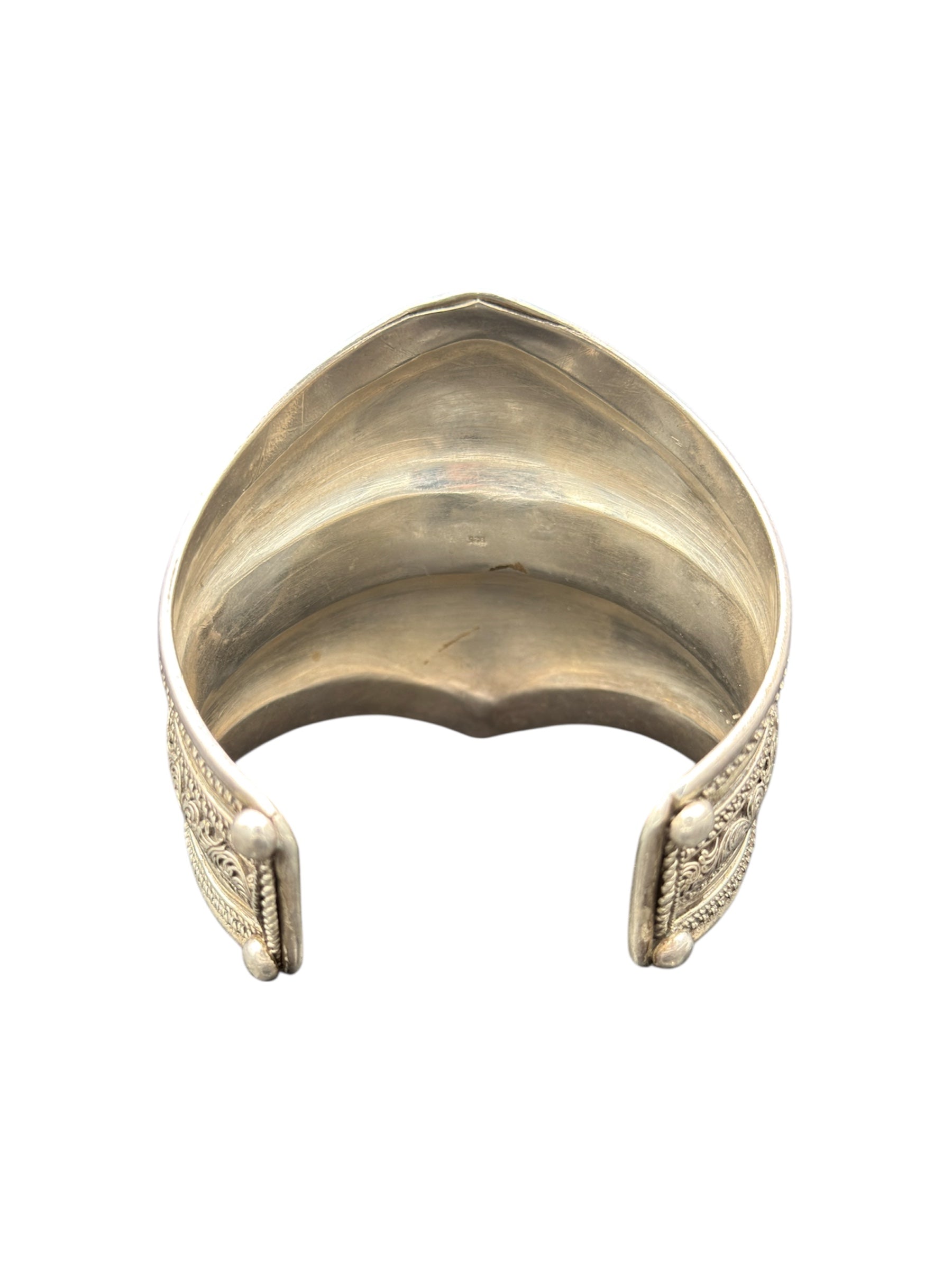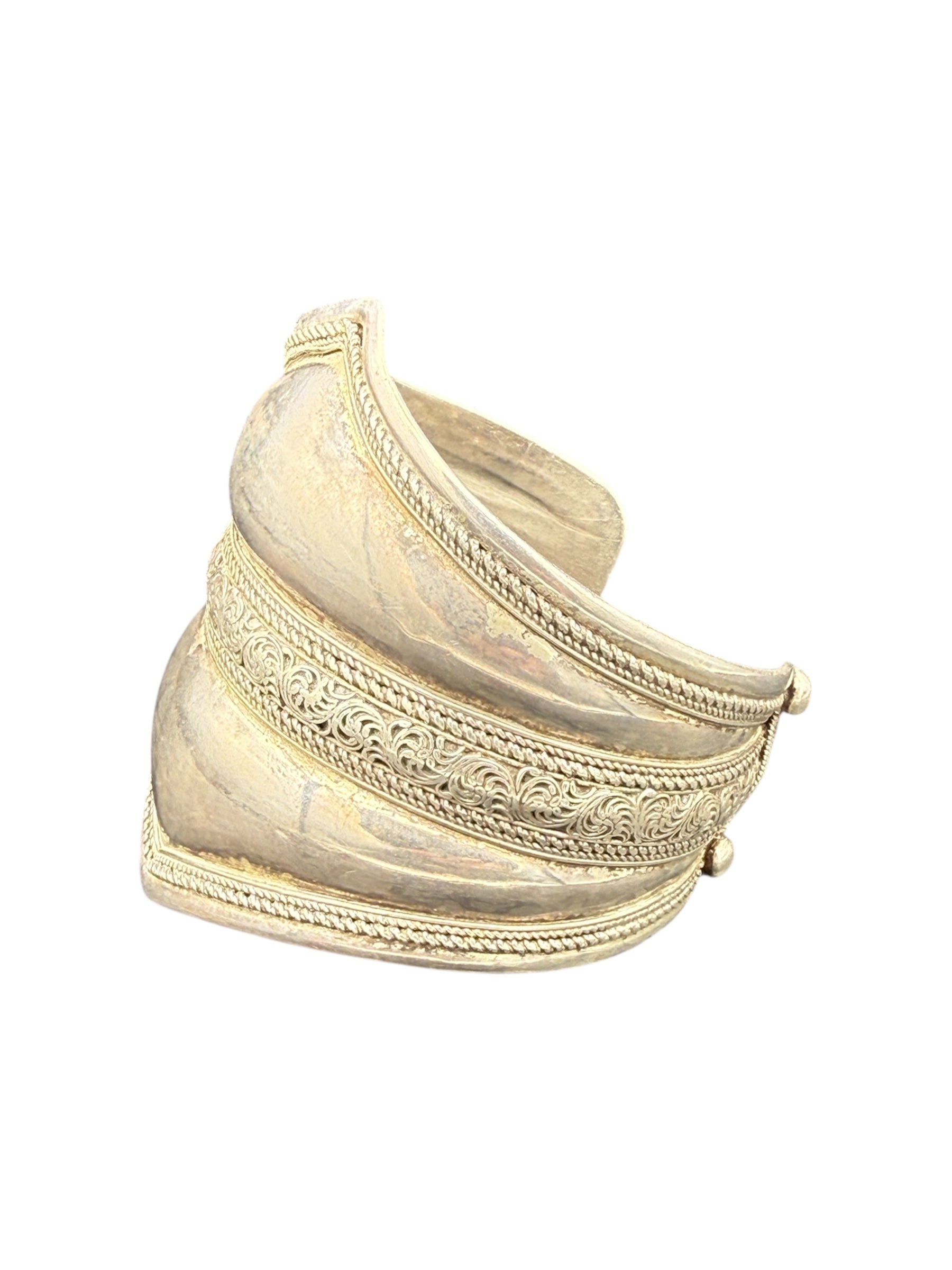 Vintage detailed wide silver cuff bracelet featuring engraved filigree patterns and textured repoussé accents, perfect for jewelry collectors or statement accessory lovers. Stamped 925 on inside, shown on the last photo.