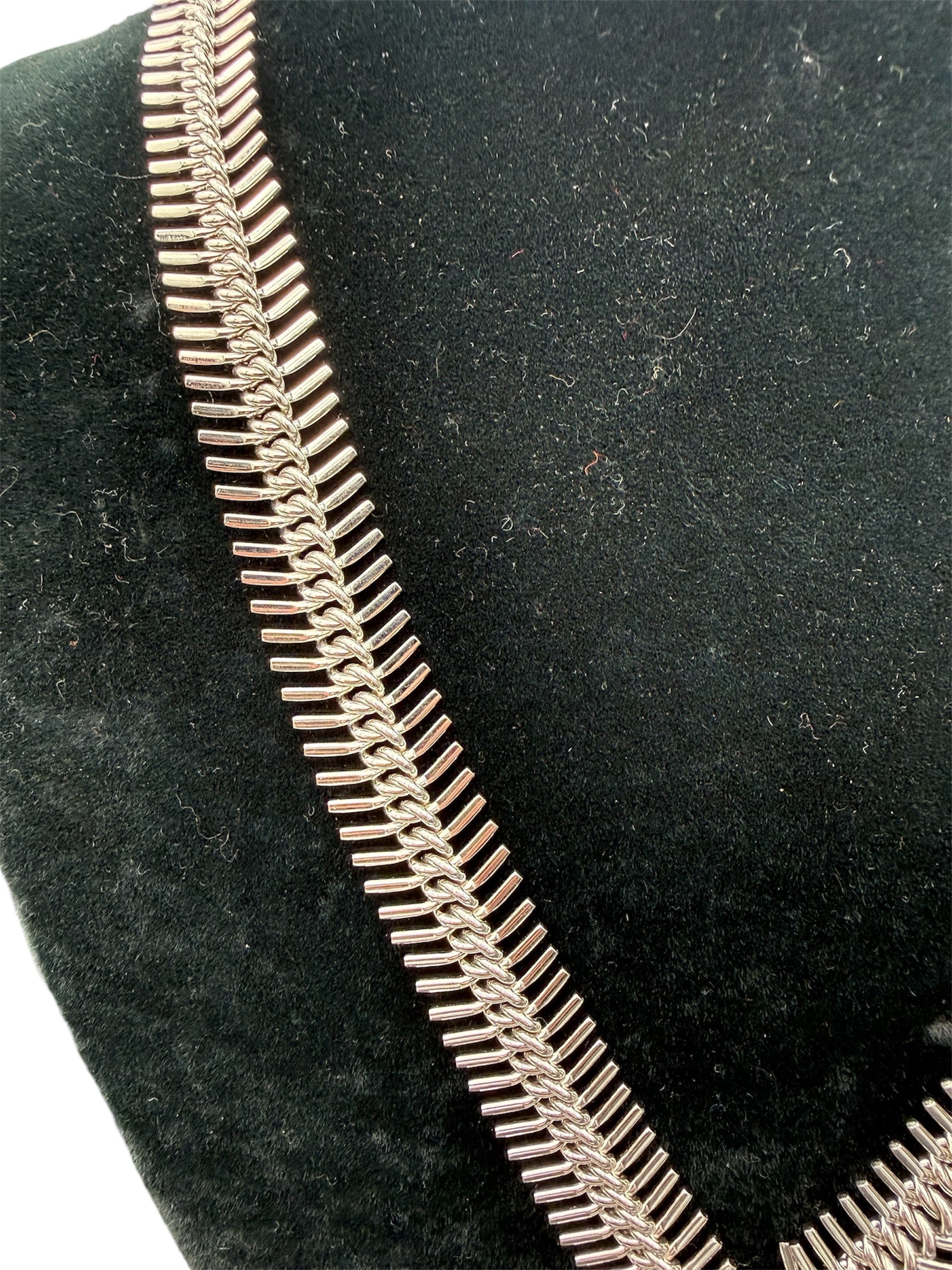 Vintage sterling silver necklace featuring a striking modernist design with a bold geometric fish bone chain and a large banded White Botswana agate pendant. The pendant showcases unique natural stone patterns set in sculptural silver, secured with a classic spring ring clasp. It is stamped "Sterling", shown in the last photo. It is in excellent condition.