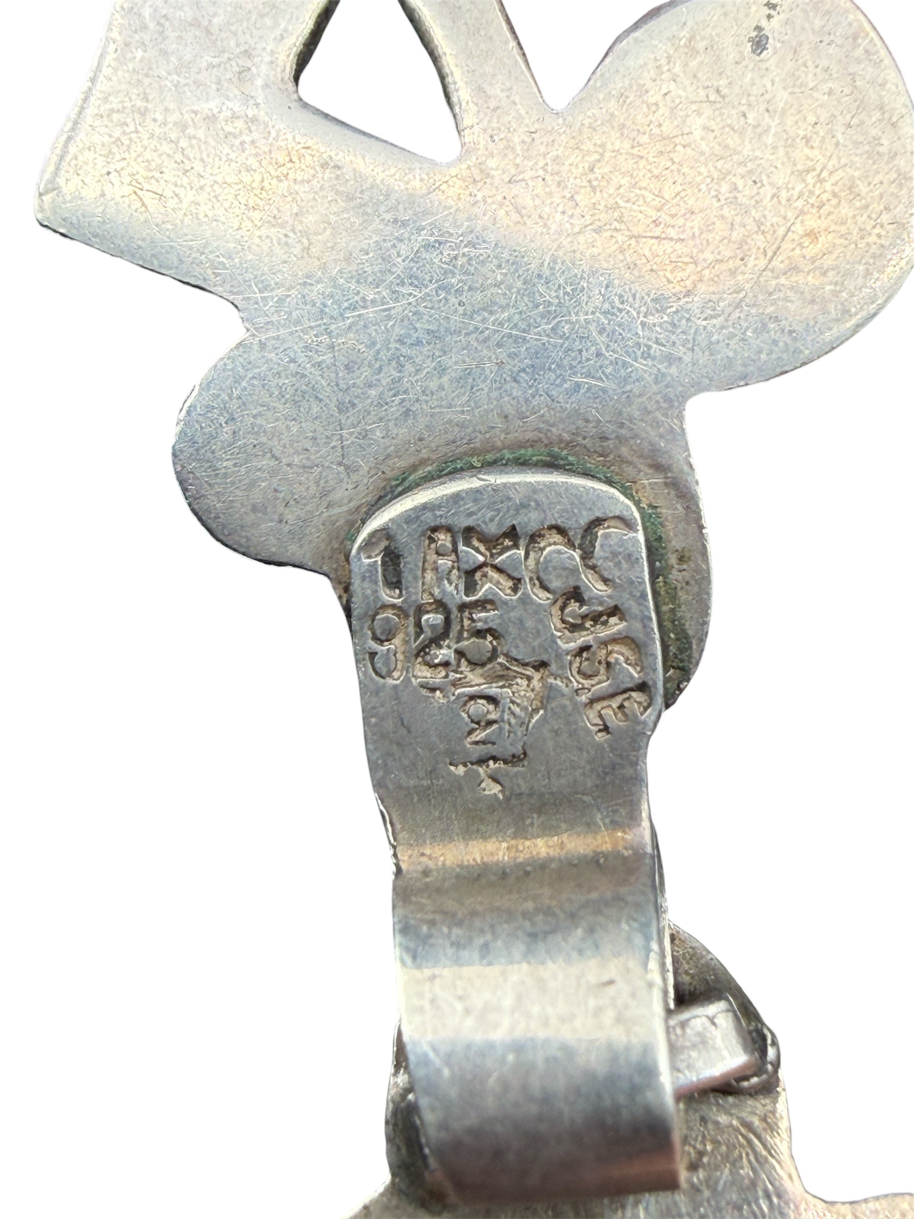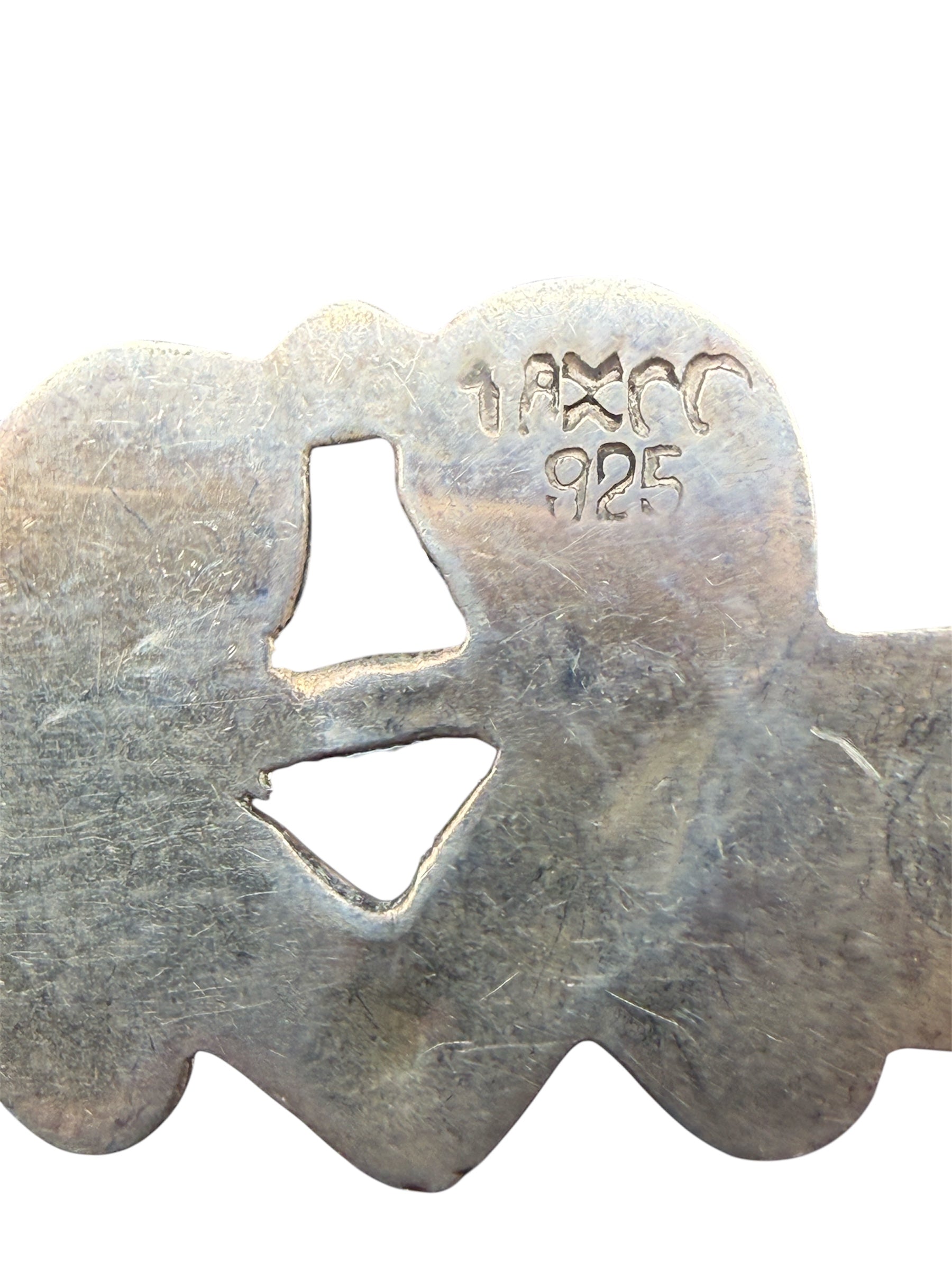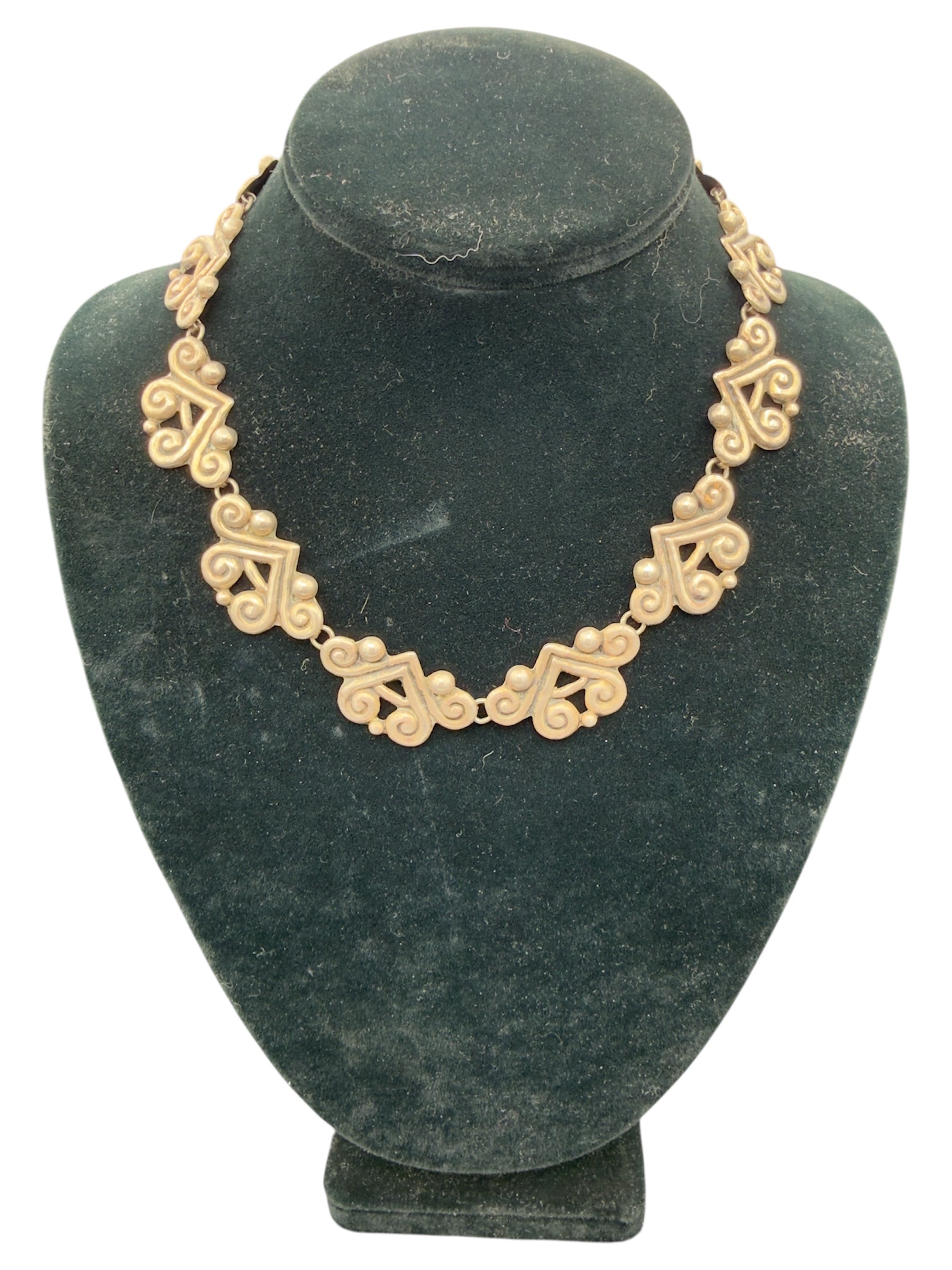 Vintage Taxco sterling silver 925 necklace with sculpted geometric panels and ornate scrollwork, perfect for collectors and statement jewelry lovers. Stamped on back with "Taxco" and "925".