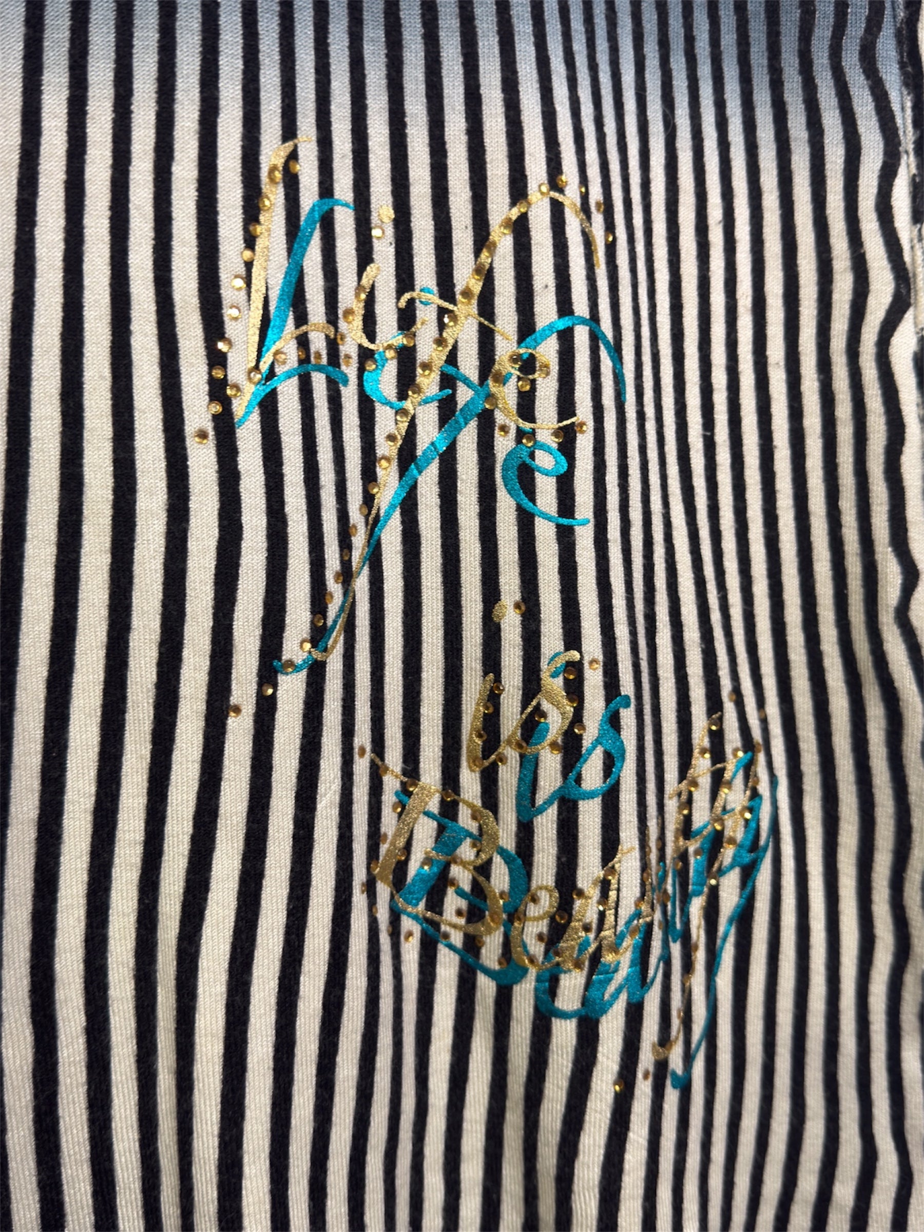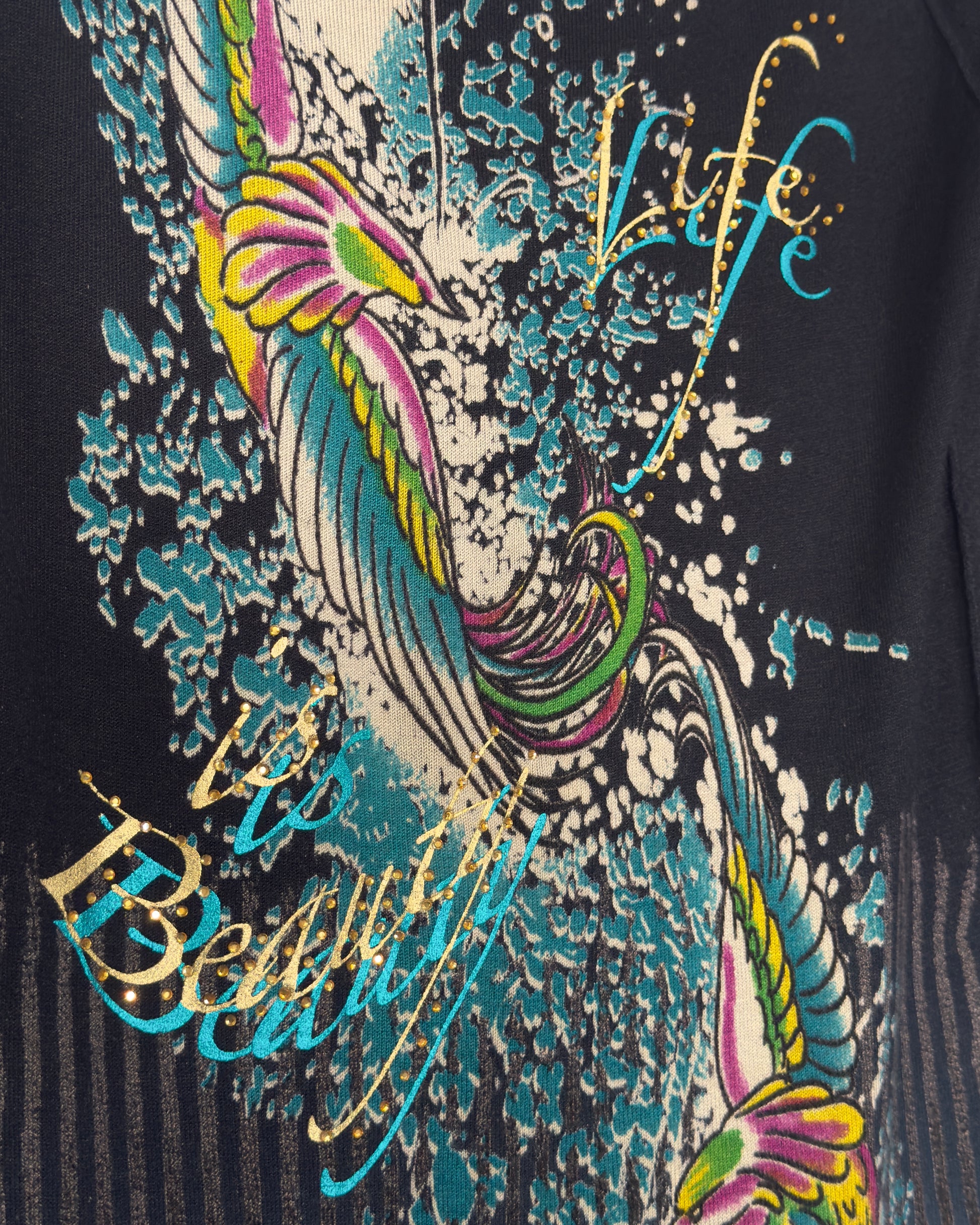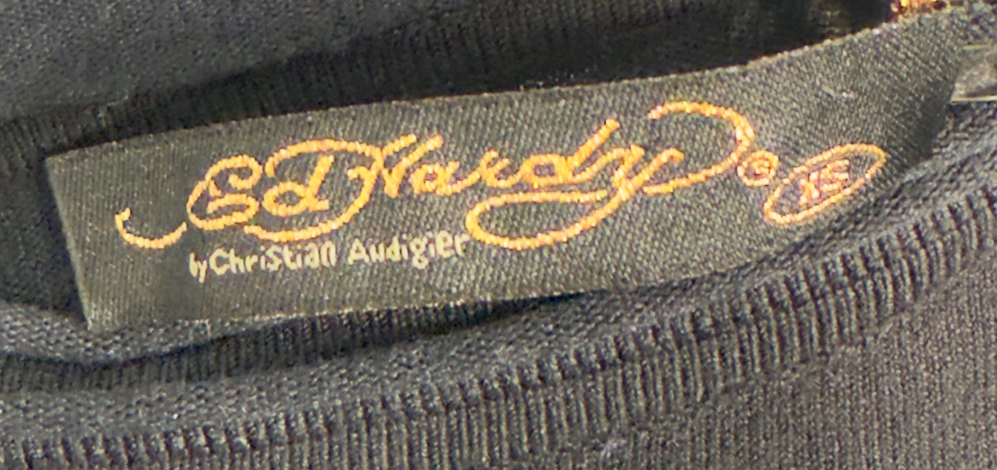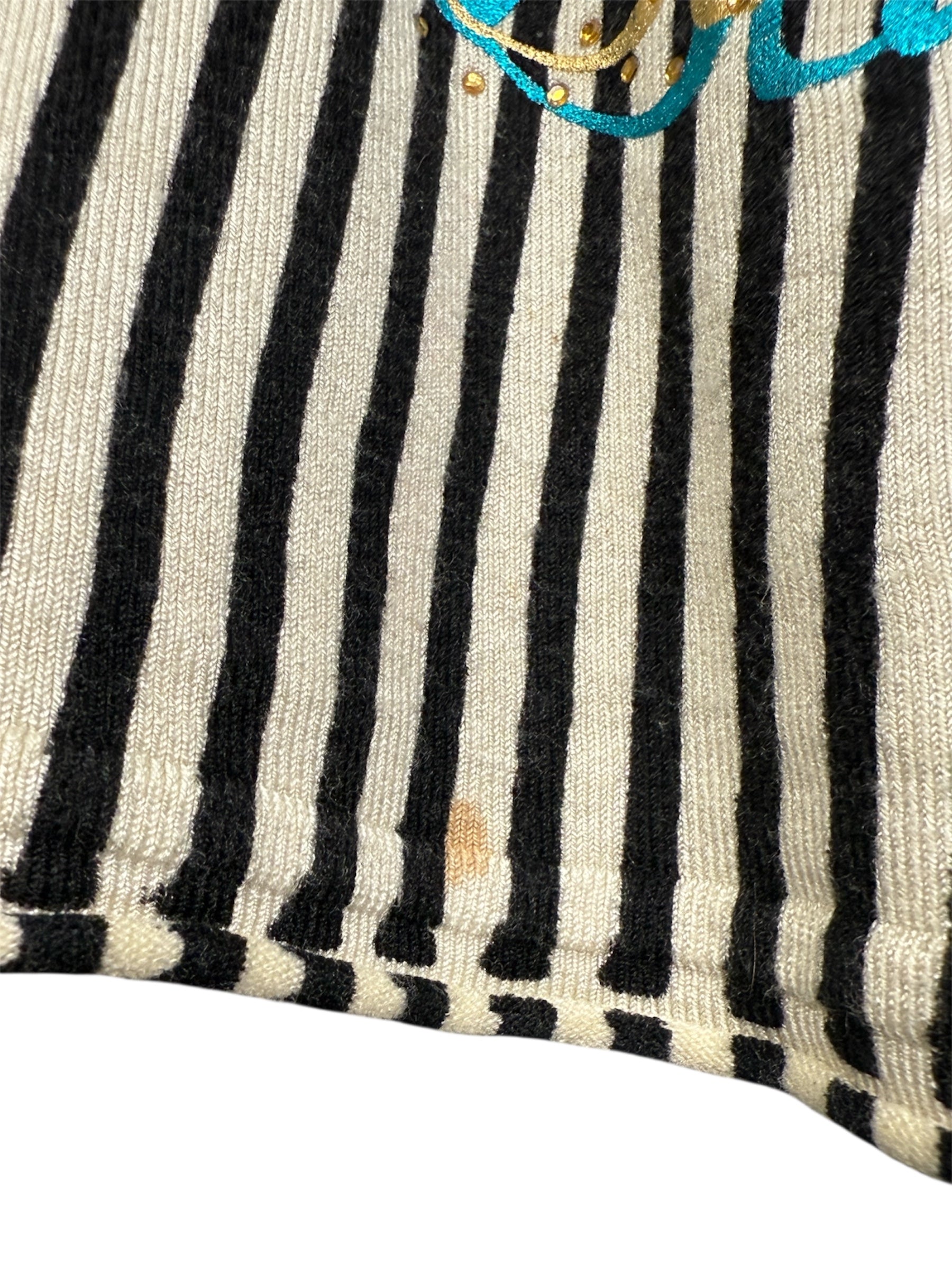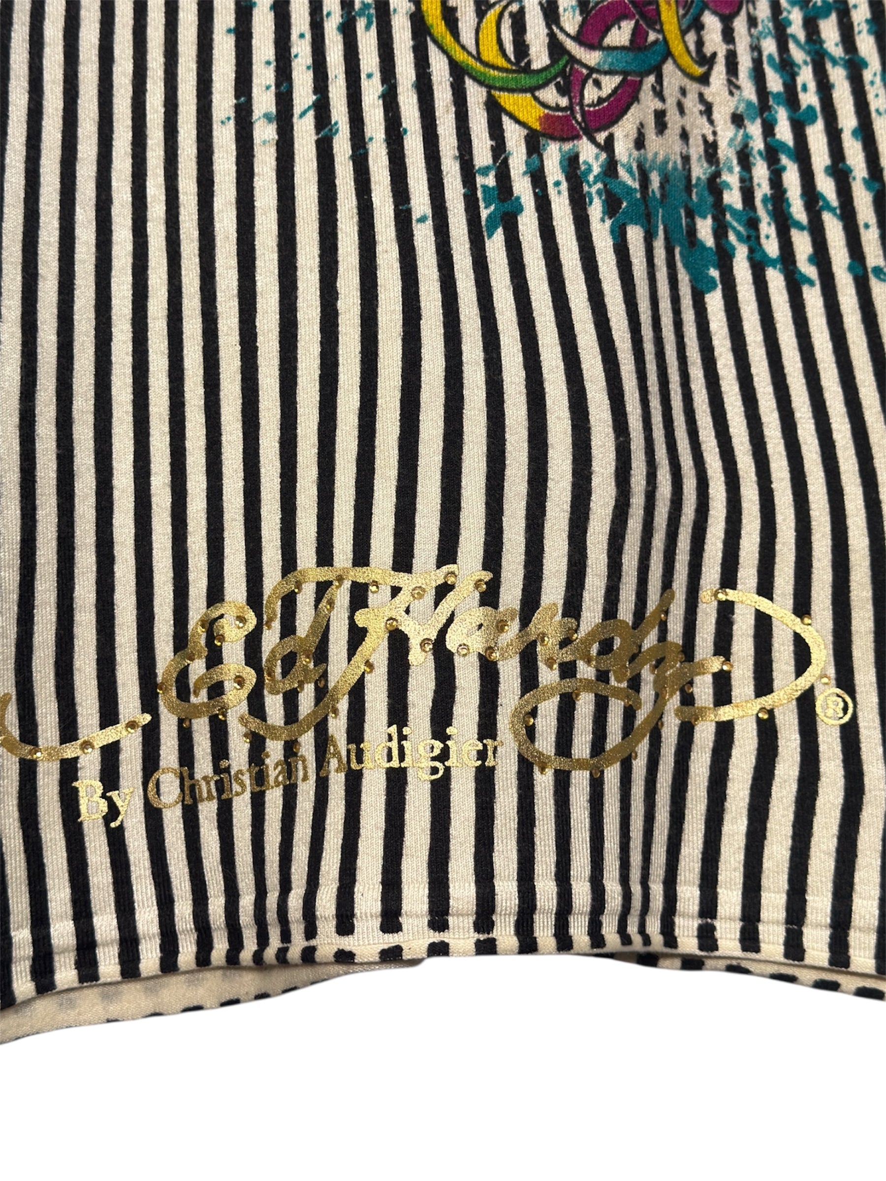 2000s Ed Hardy by Christian Audigier dress. This t-shirt style dress has extra long sleeves and a bird/peacock design. The base color of the dress is navy and it also features black and white stripes along the bottom of the dress and sleeves, along with blue, pink, and yellow colors in the design. The front and back has graphic letter of "Life is beautiful". The front of the dress has graphic letter of "Don Ed Hardy Designs" on the bottom and the back has lettering that says "Ed Hardy by Christian Audigier". This dress is marked an extra small, but please refer to the measurements. There is a small condition issue with this piece, shown in the last photo. There is a small stain on the bottom hem of the dress.
